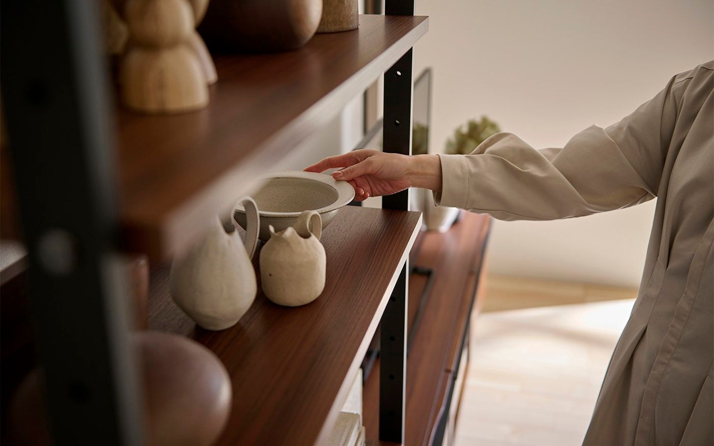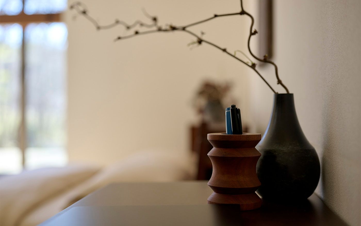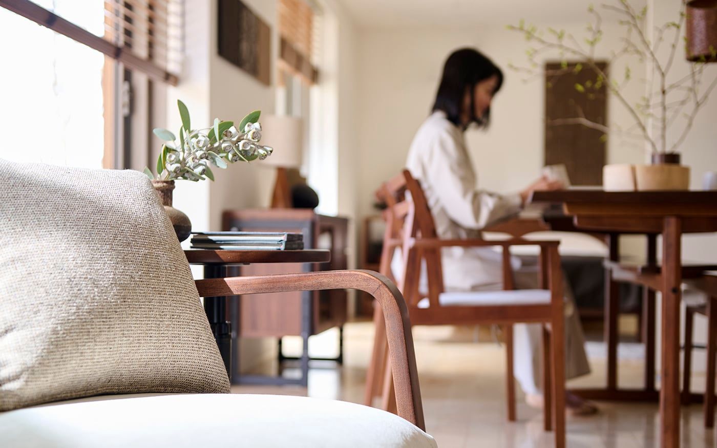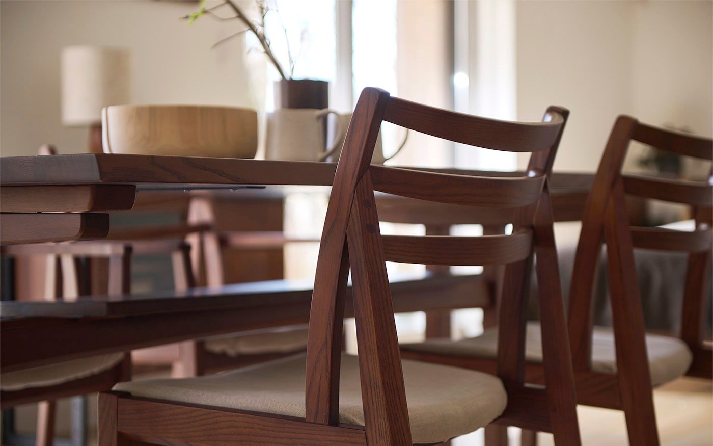 優しいブラウンカラーで統一したダイニングスペース。木々の木目を楽しめる無垢材ダイニングテーブルを設置した食卓には、余計な色を使わずシンプルにブラウン単色でまとめました。素材感のあるペンダントライトや、枝柄の壁面装飾をさりげなくアクセントに。