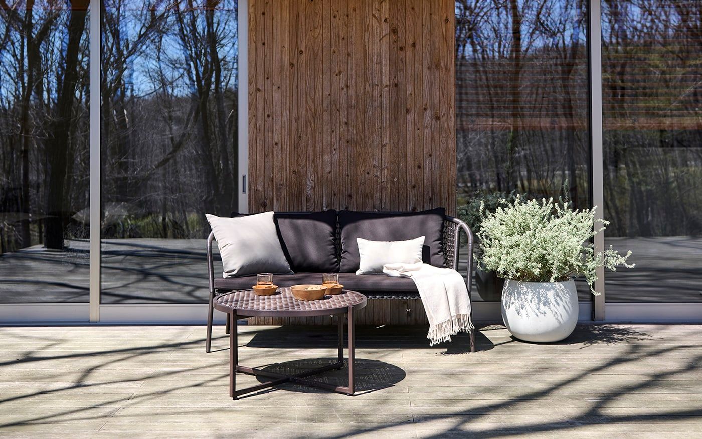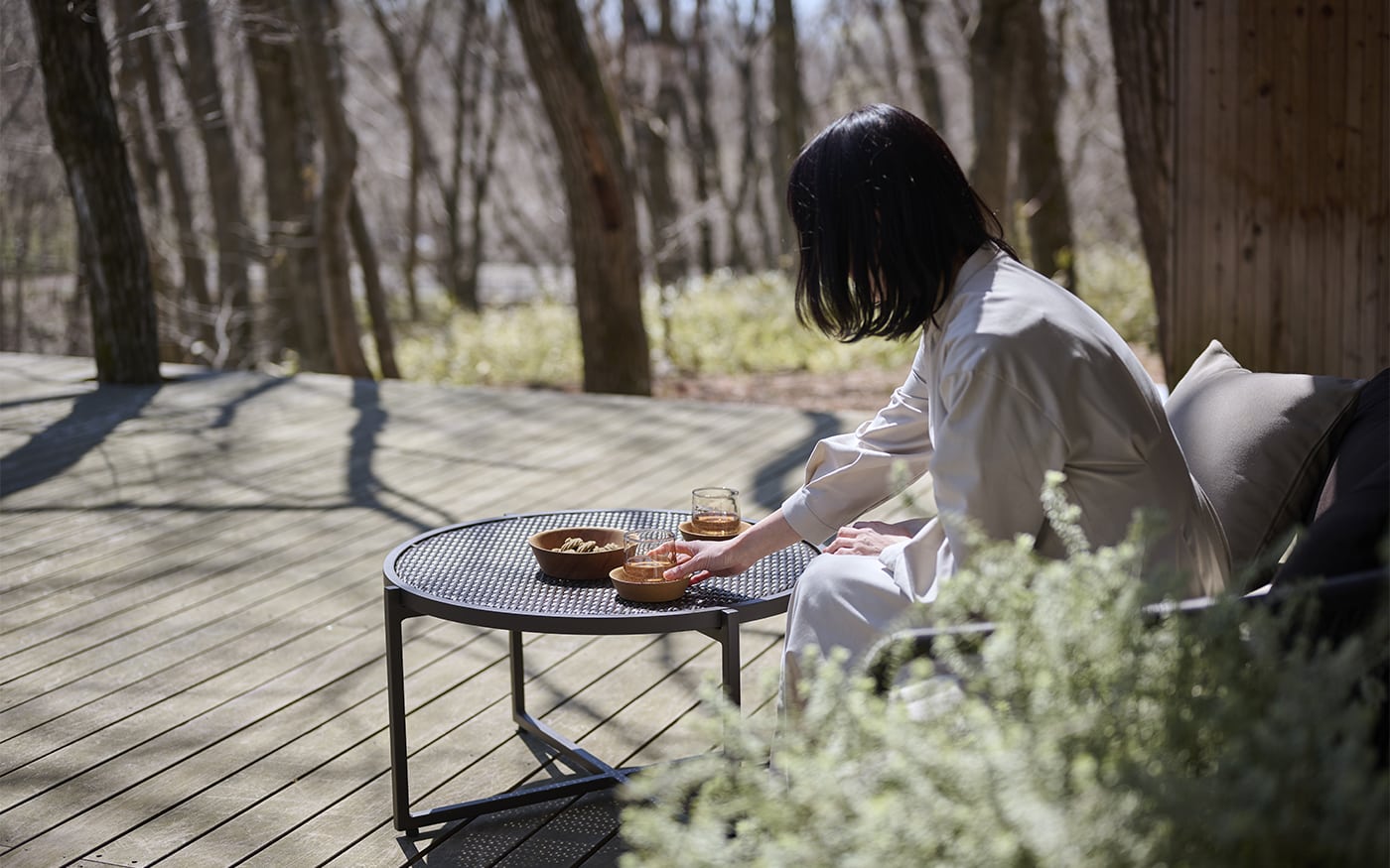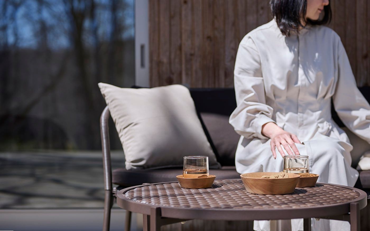 心地よい木々の木漏れ日を感じながら寛げるウッドテラス。編み込みタイプで自然な雰囲気も感じさせる屋外用家具をレイアウトして、シンプルなブラウンコーディネートを屋外空間にも作りあげました。