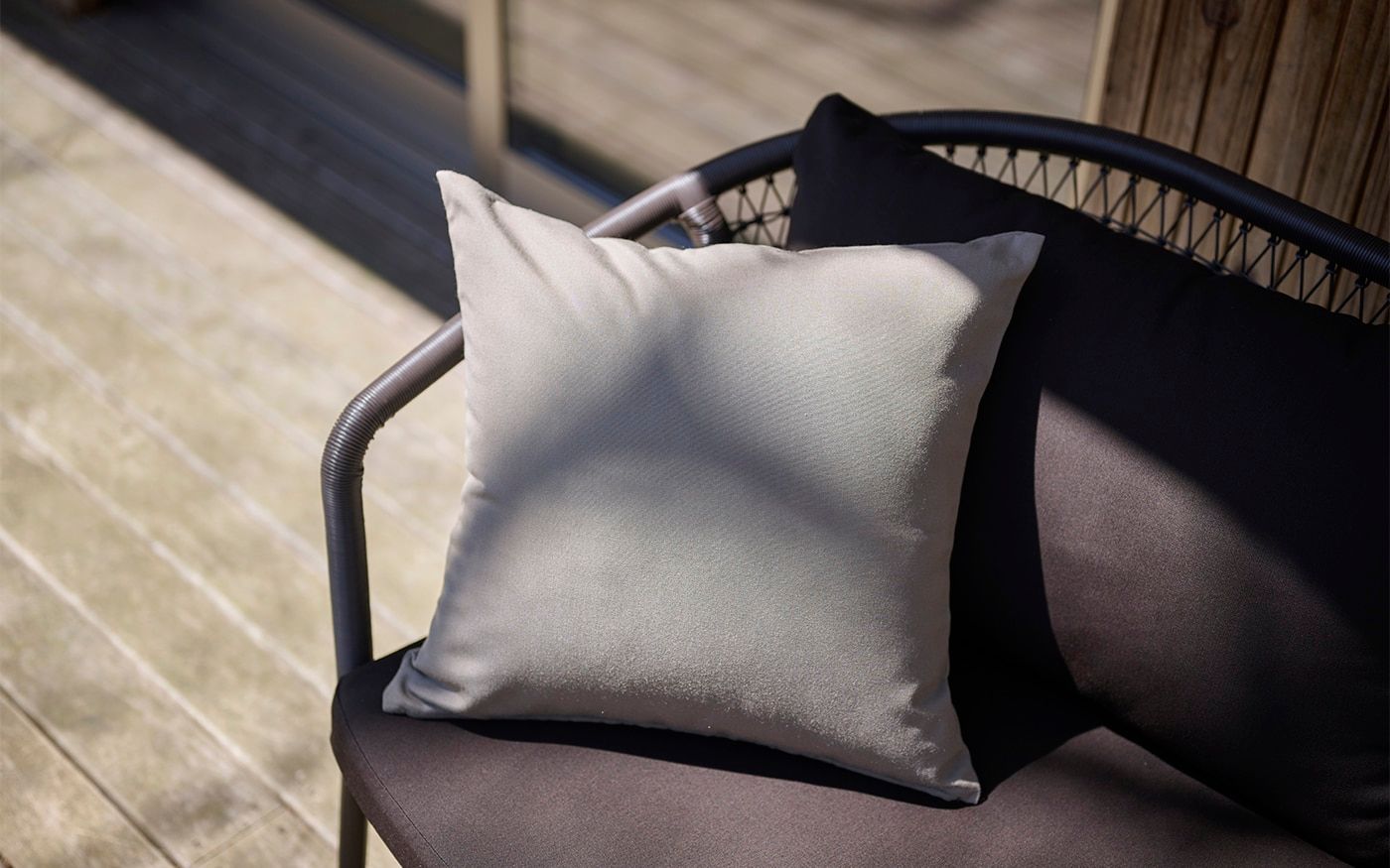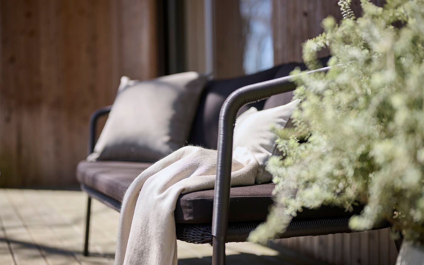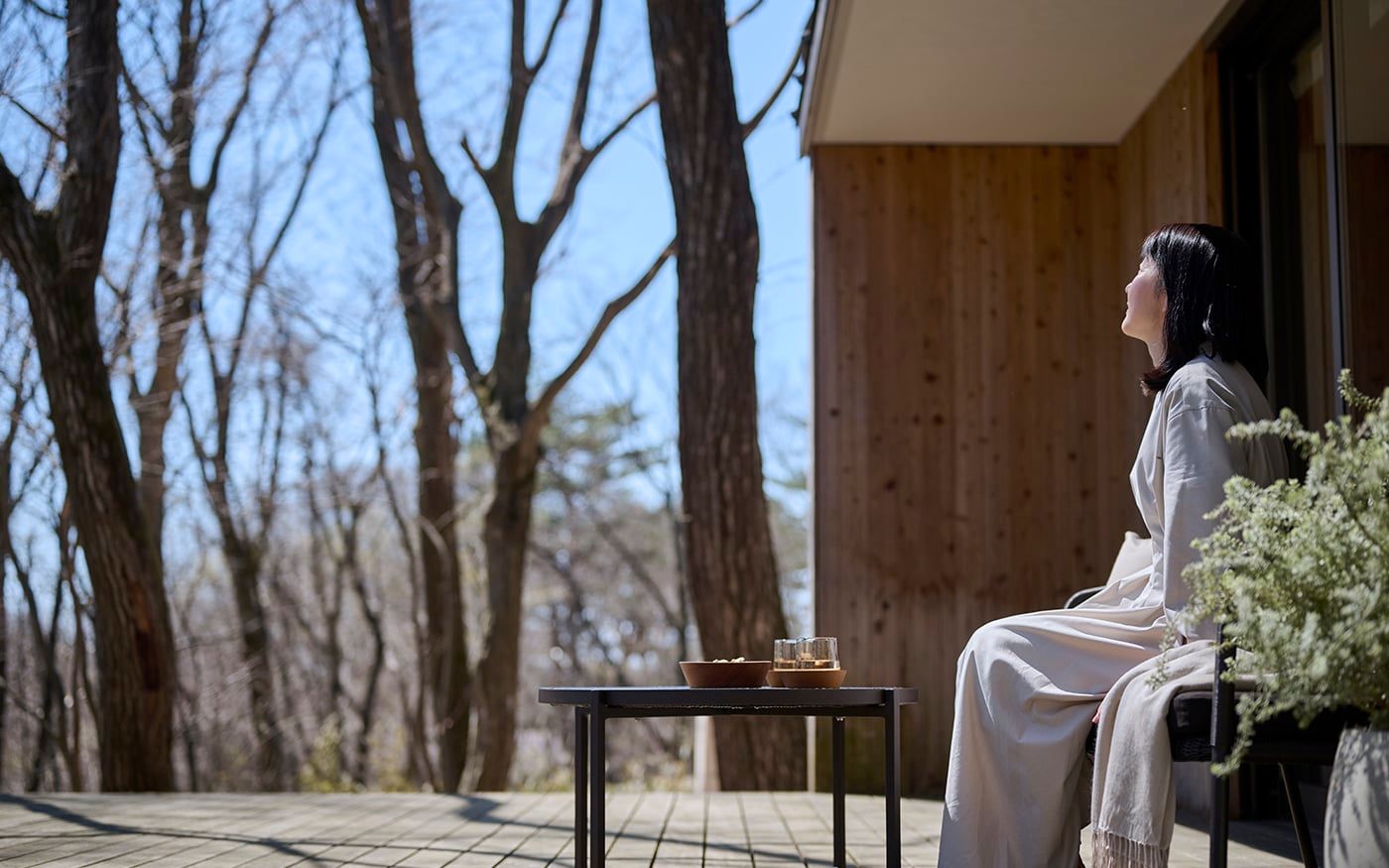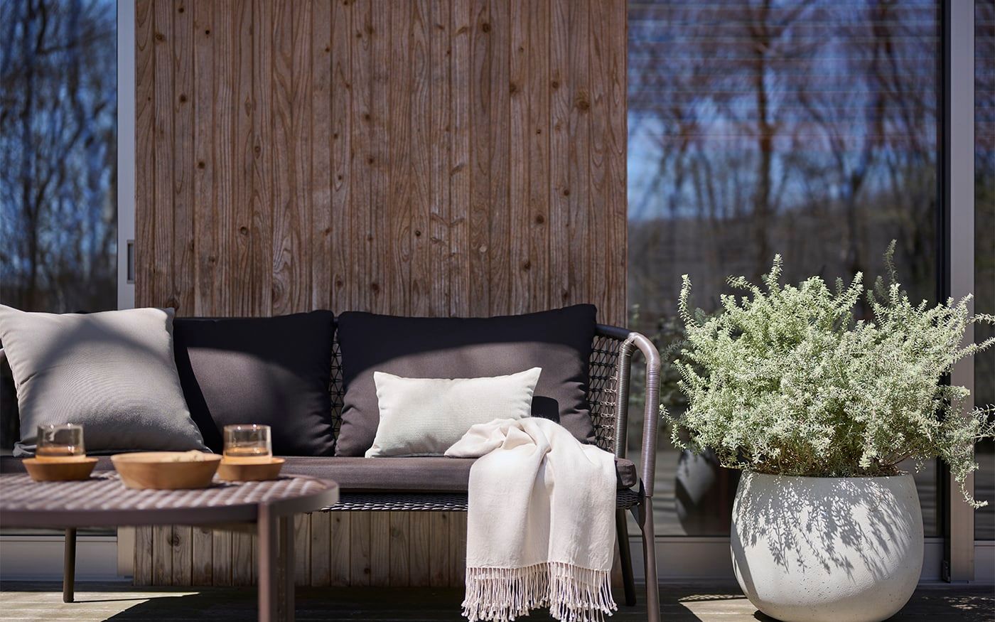 心地よい木々の木漏れ日を感じながら寛げるウッドテラス。編み込みタイプで自然な雰囲気も感じさせる屋外用家具をレイアウトして、シンプルなブラウンコーディネートを屋外空間にも作りあげました。