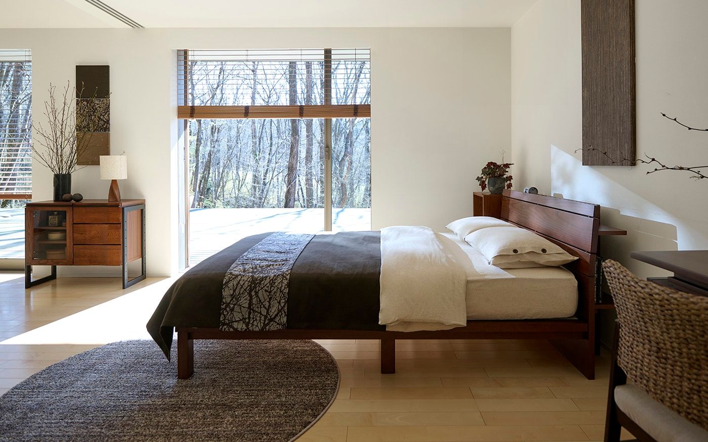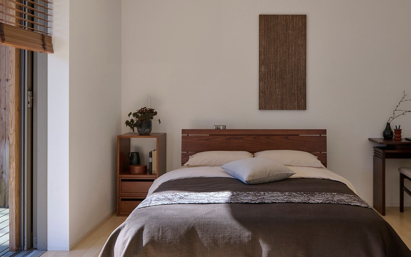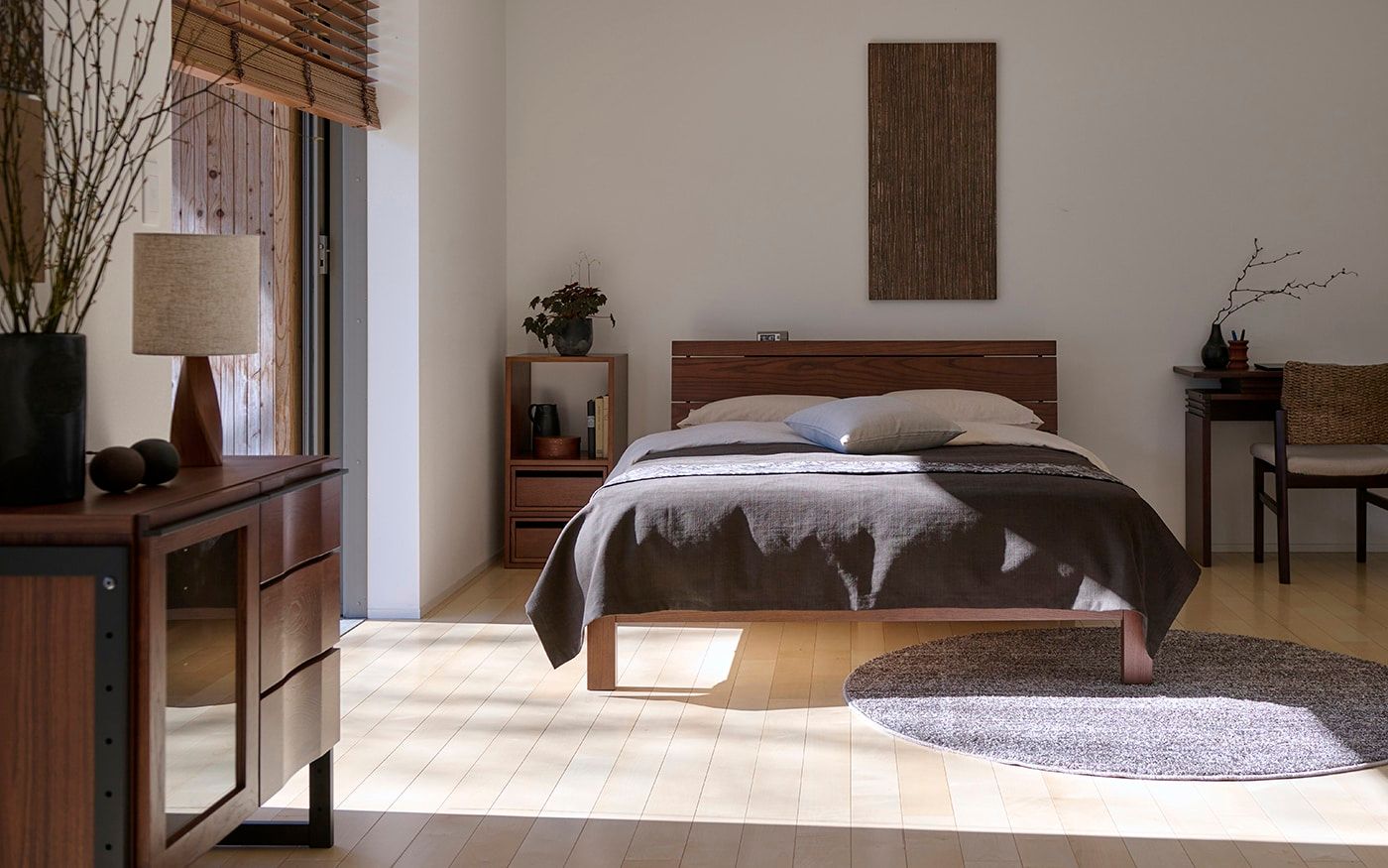 LDKと同様に、ブラウンのワンカラーで仕上げたシンプルな寝室。無垢材のベッドや収納、デスクの風合いを活かした潔いコーディネートです。ベッドスローやアートパネル、円形のラグによって、おしゃれで素材感も楽しめる寝室が叶います。