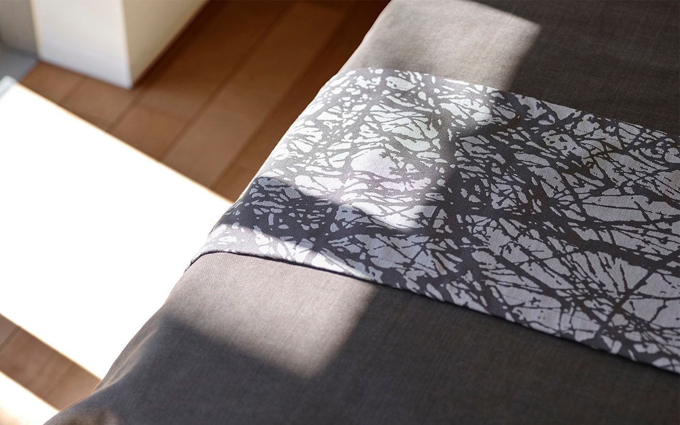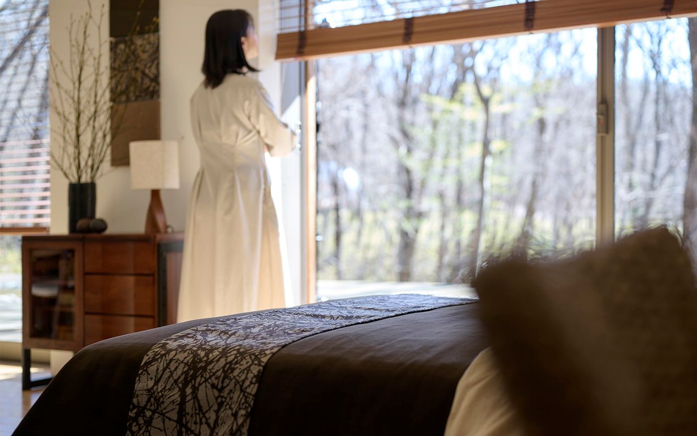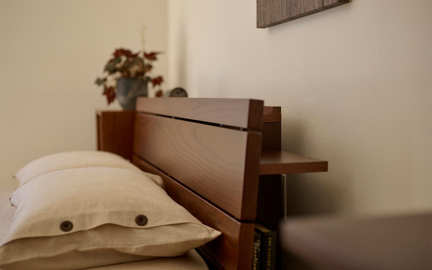 LDKと同様に、ブラウンのワンカラーで仕上げたシンプルな寝室。無垢材のベッドや収納、デスクの風合いを活かした潔いコーディネートです。ベッドスローやアートパネル、円形のラグによって、おしゃれで素材感も楽しめる寝室が叶います。