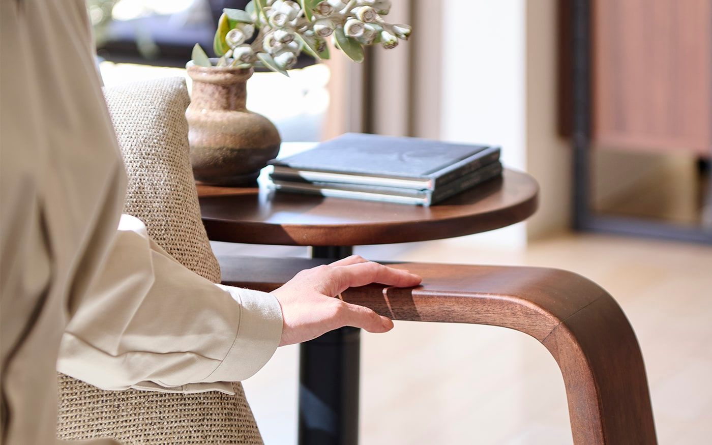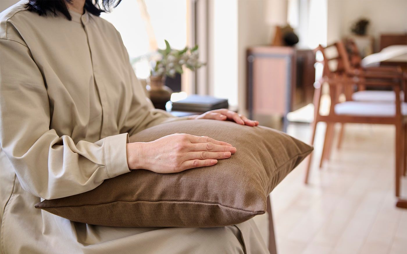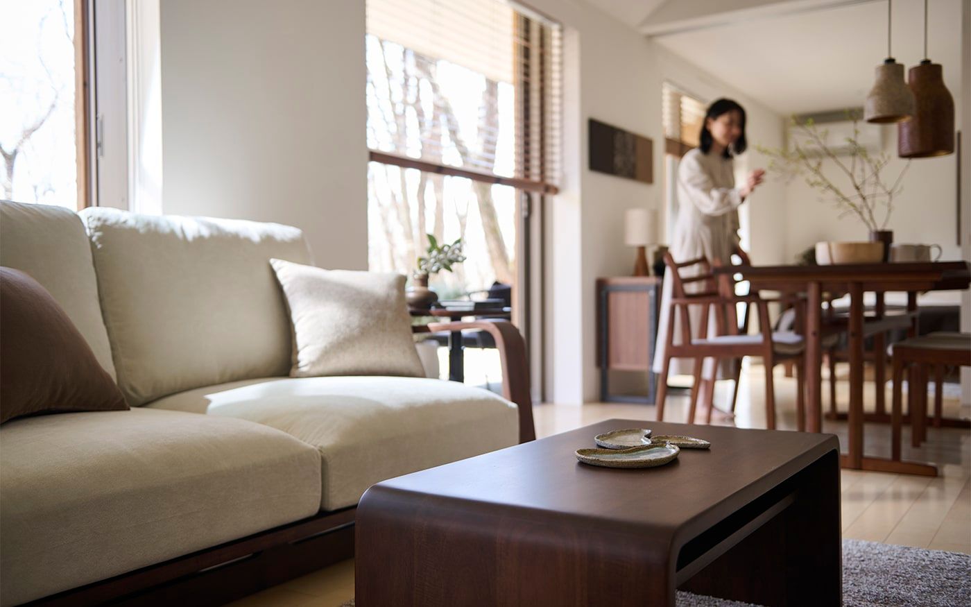 無垢材の曲線アームが美しいハイバックソファや、ローテーブルを配置したリビング。ナチュラルな床色にオフホワイトのソファカバーで合わせたシンプルなコーディネートに、茶色のクッションでグラデーションを作りアクセントを付けました。