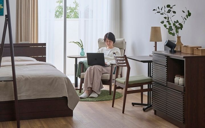 LDKと同様に、ブラウンのワンカラーで仕上げたシンプルな寝室。無垢材のベッドや収納、デスクの風合いを活かした潔いコーディネートです。ベッドスローやアートパネル、円形のラグによって、おしゃれで素材感も楽しめる寝室が叶います。