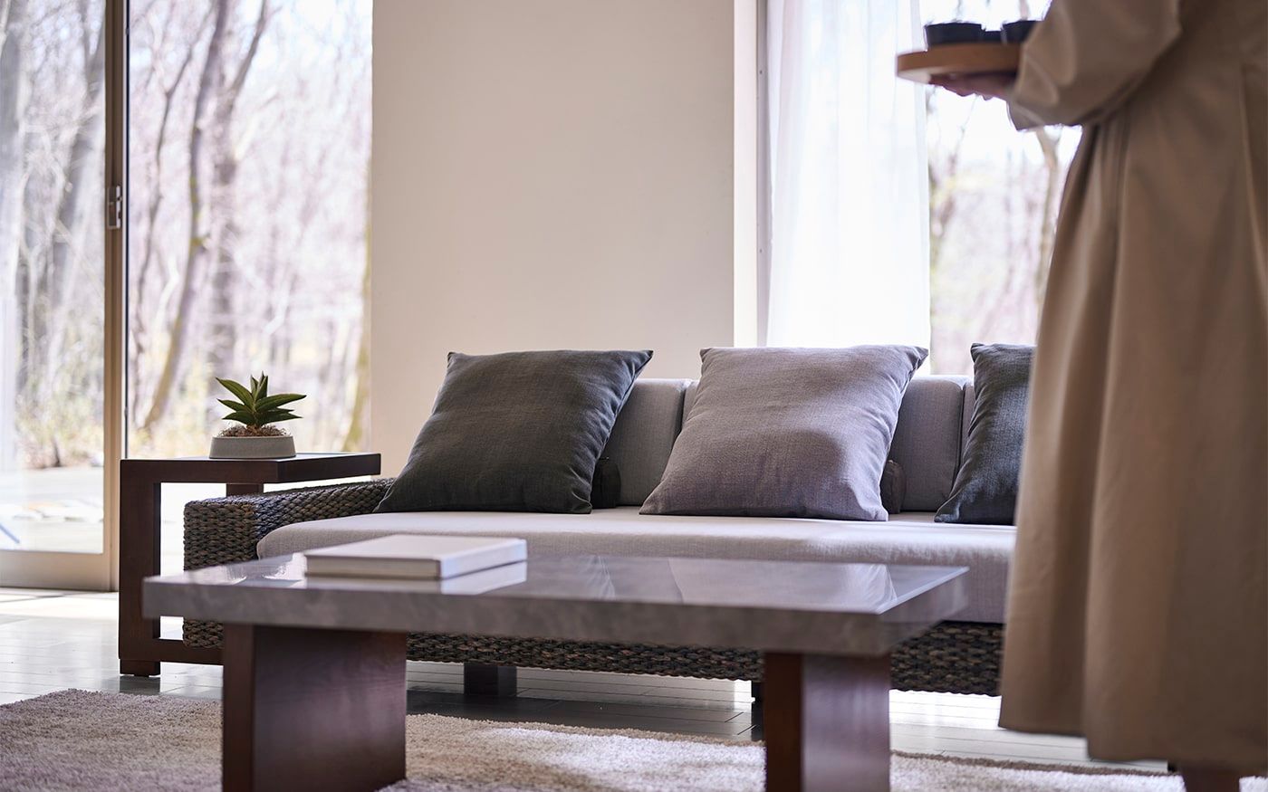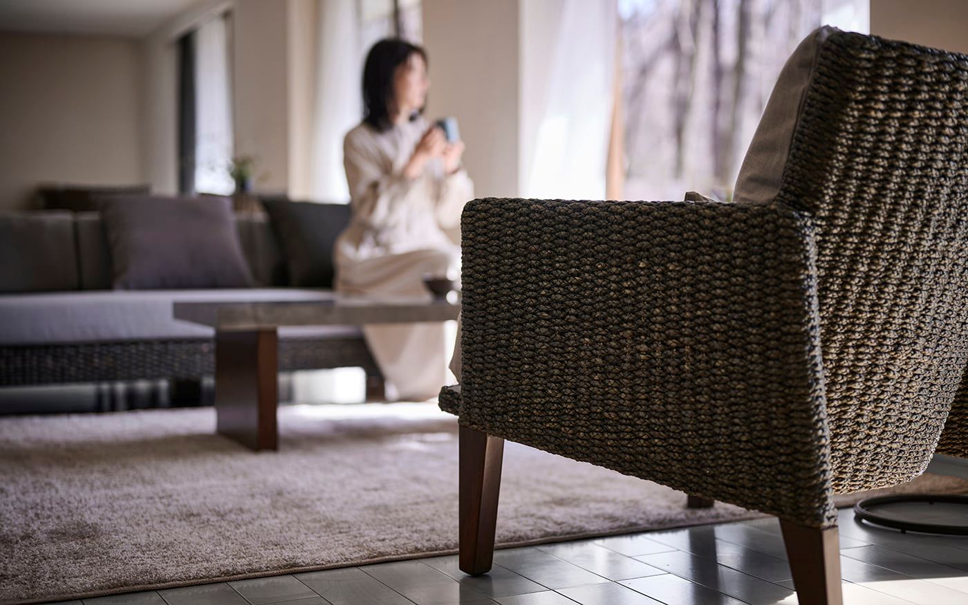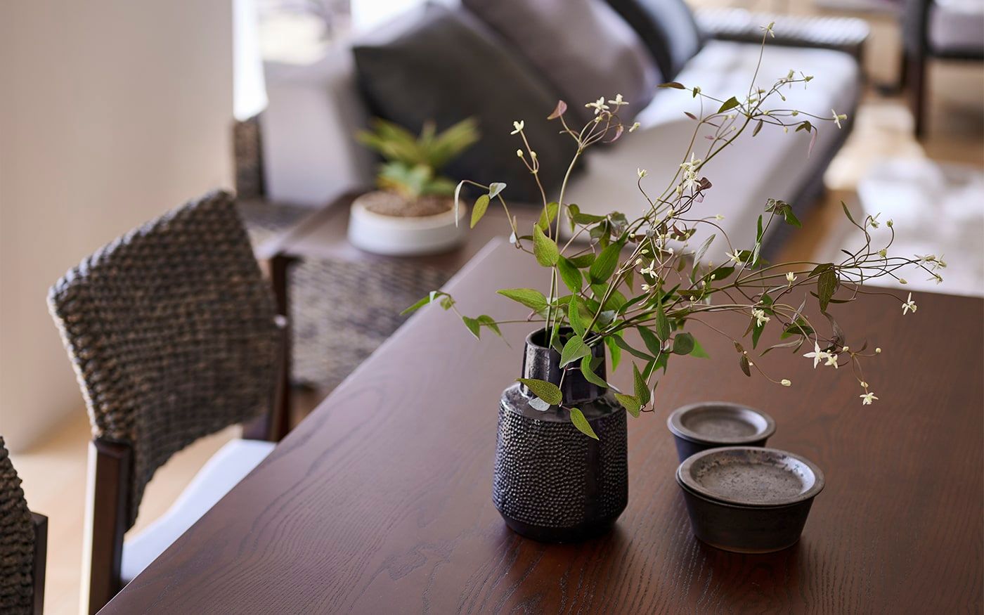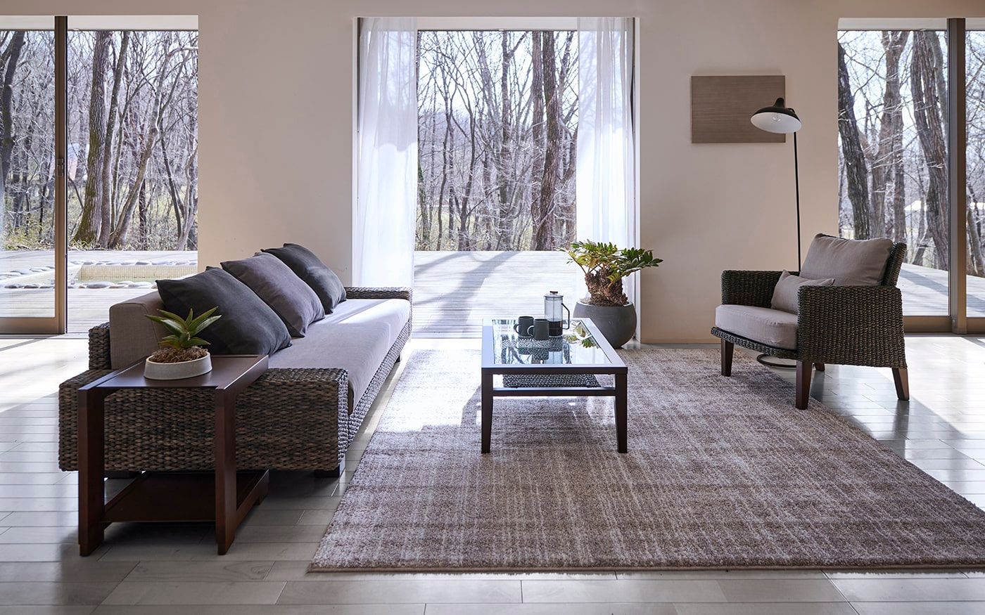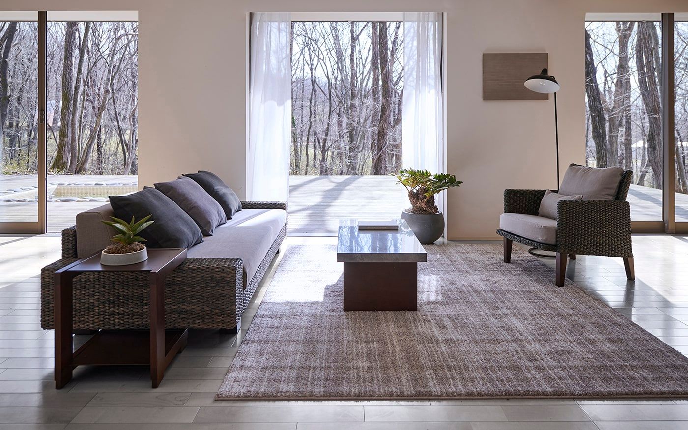 グレーに美しく染め上げたローソファや石のテーブルが主役のリビング。様々な自然素材をベースにしたグレーの家具とファブリックを用いて、モダンで優し気な空間に。雲霞を想わせるような、色とりどりのグレーで作り上げたカラーコーディネートに包まれて、心からリラックスできます。