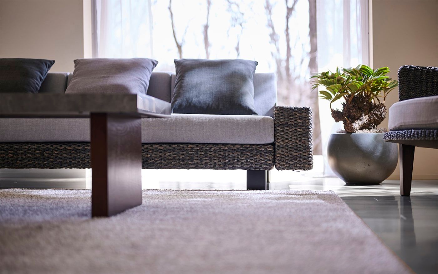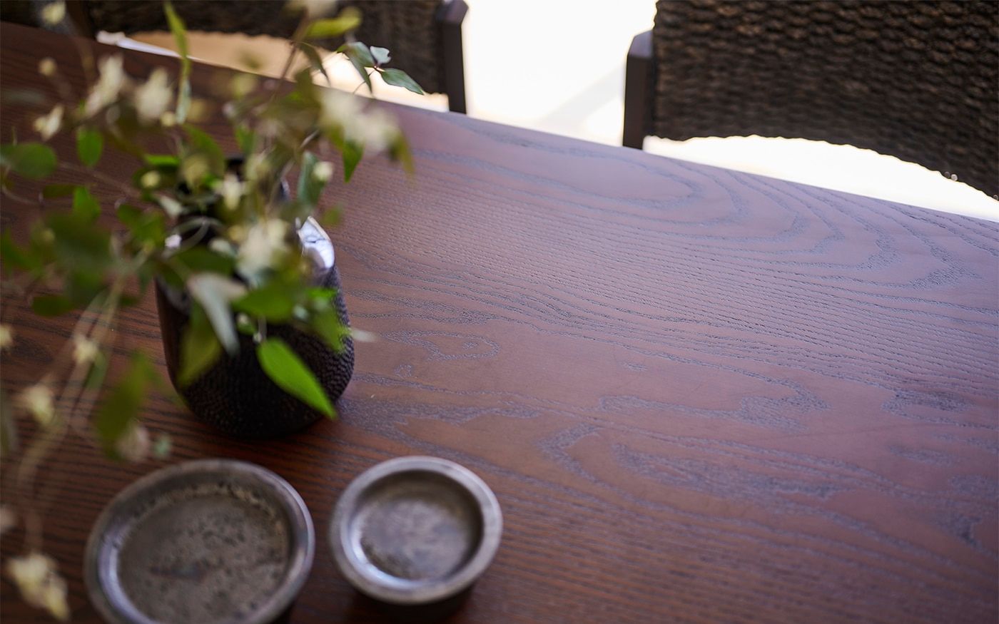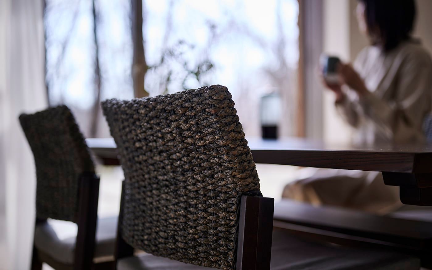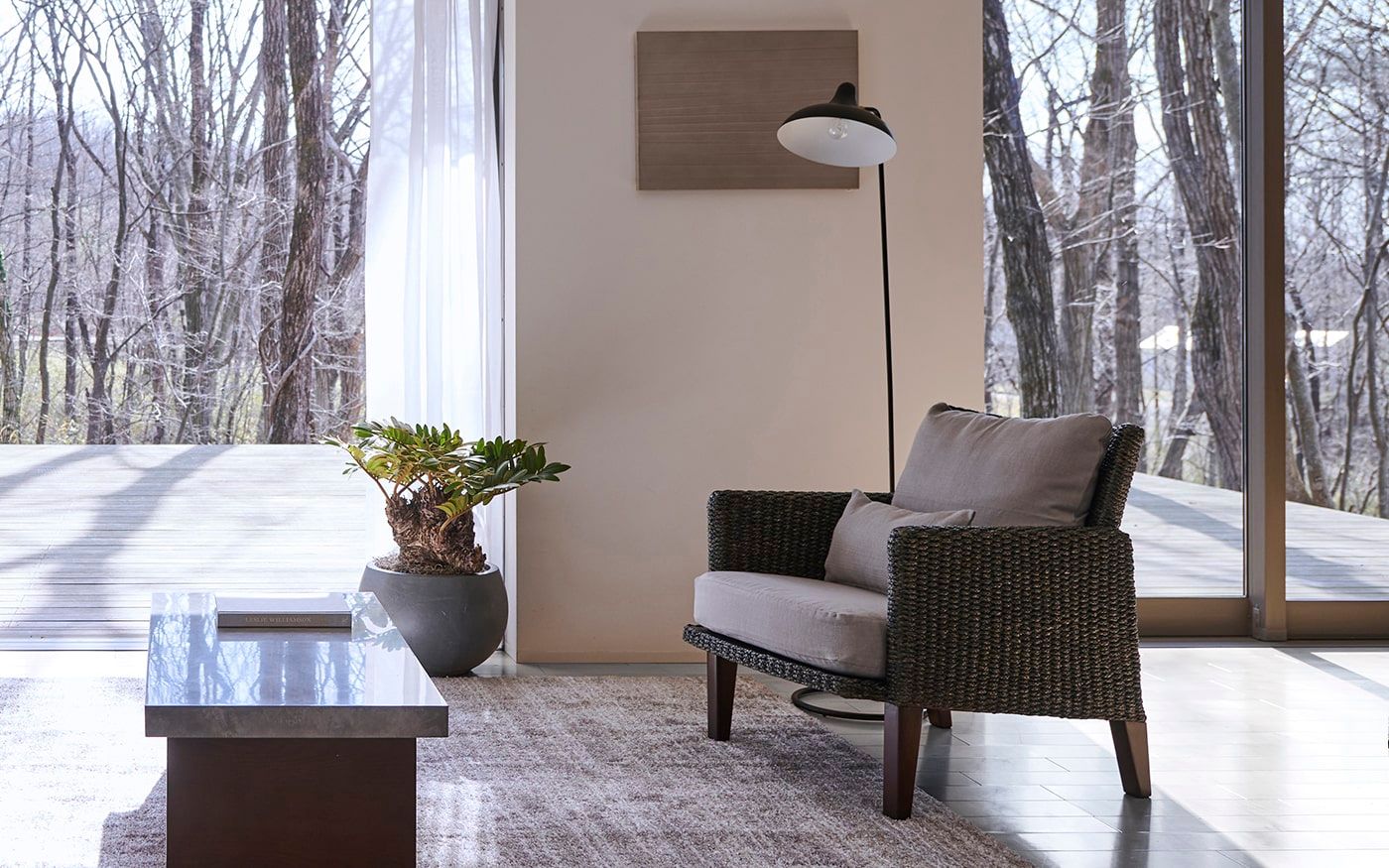 グレーに美しく染め上げたローソファや石のテーブルが主役のリビング。様々な自然素材をベースにしたグレーの家具とファブリックを用いて、モダンで優し気な空間に。雲霞を想わせるような、色とりどりのグレーで作り上げたカラーコーディネートに包まれて、心からリラックスできます。