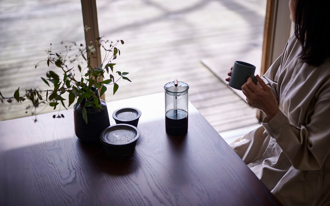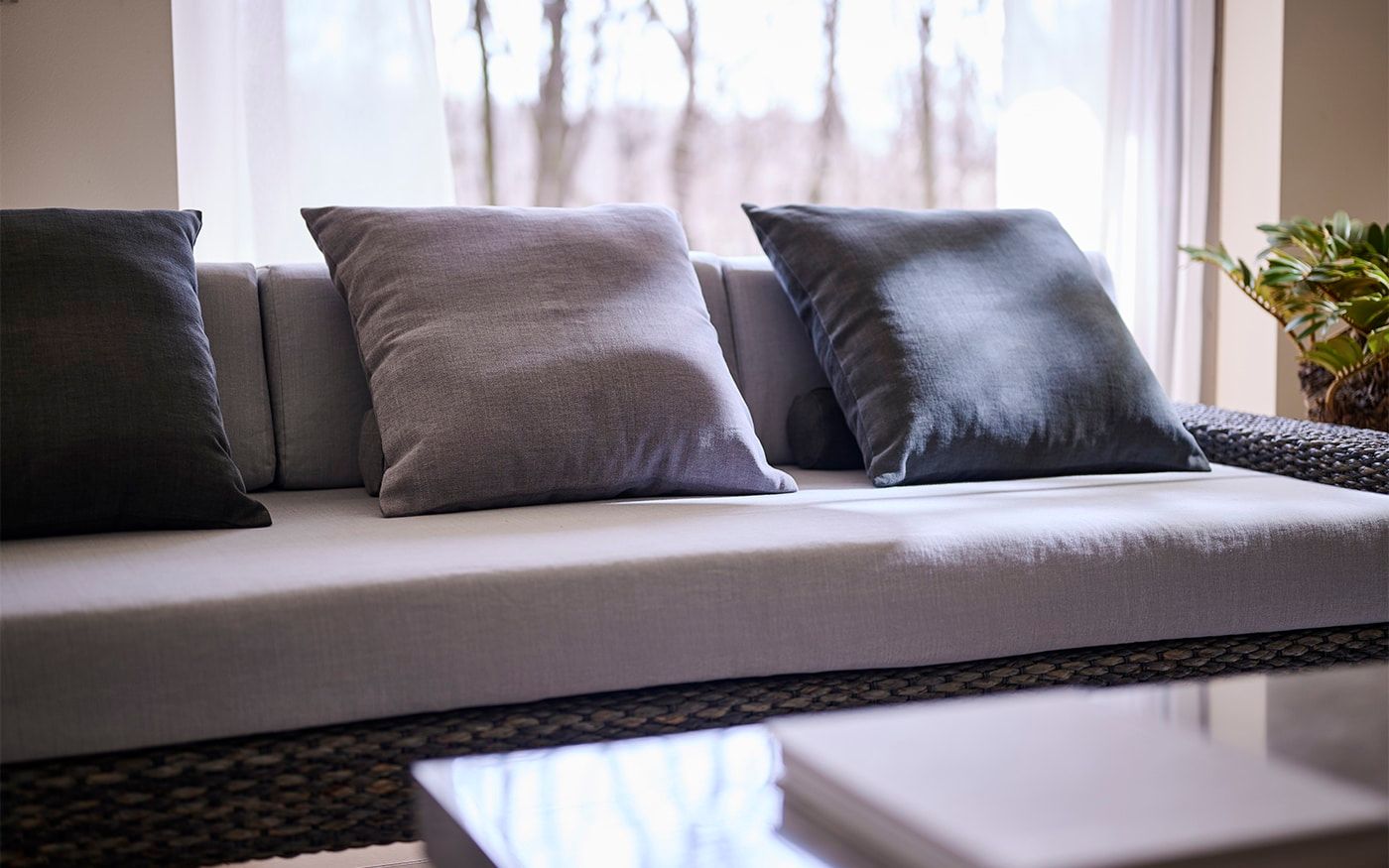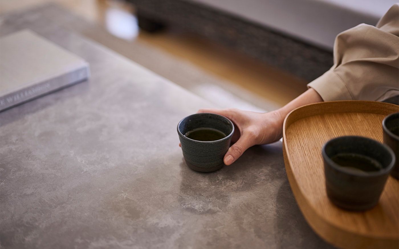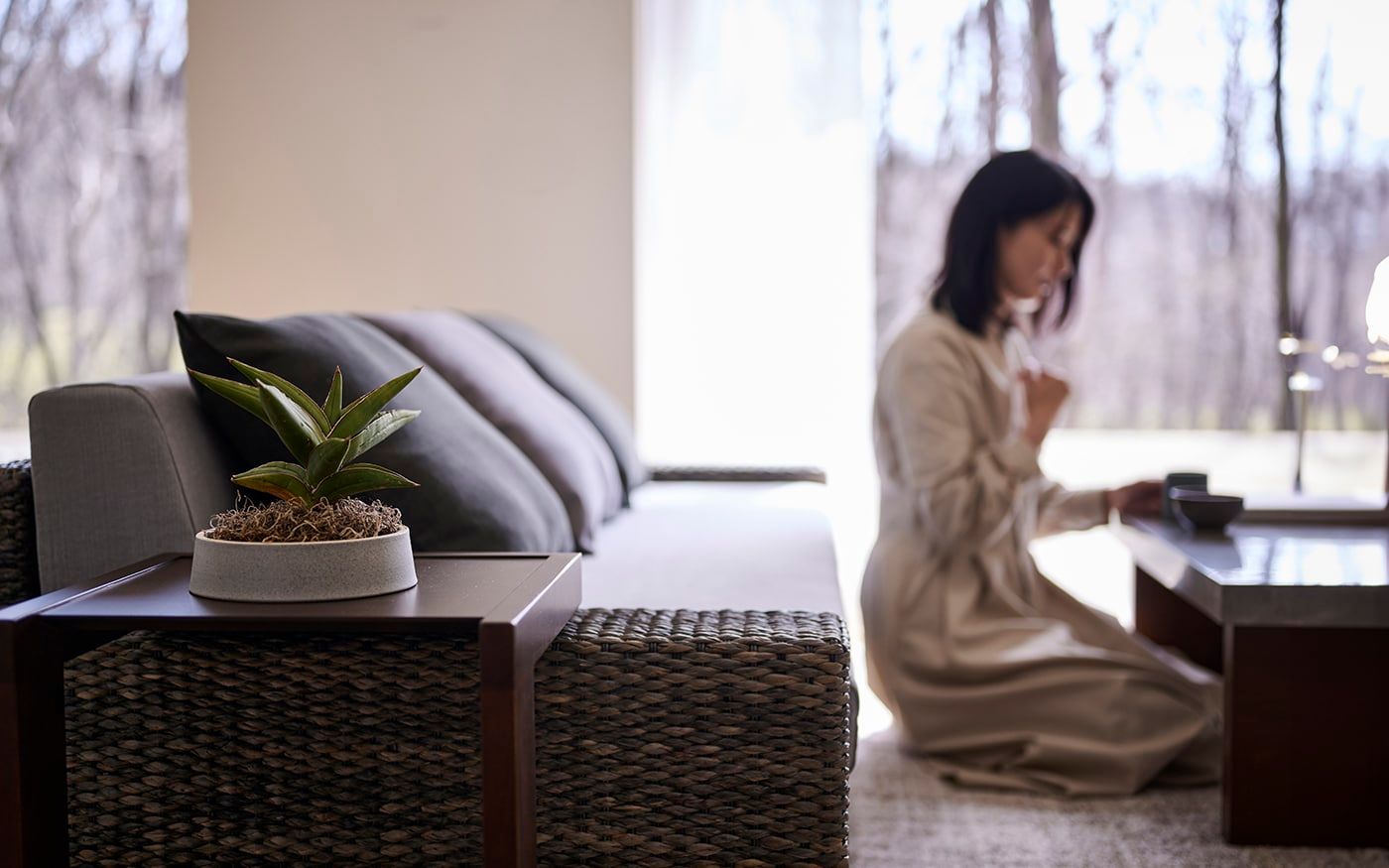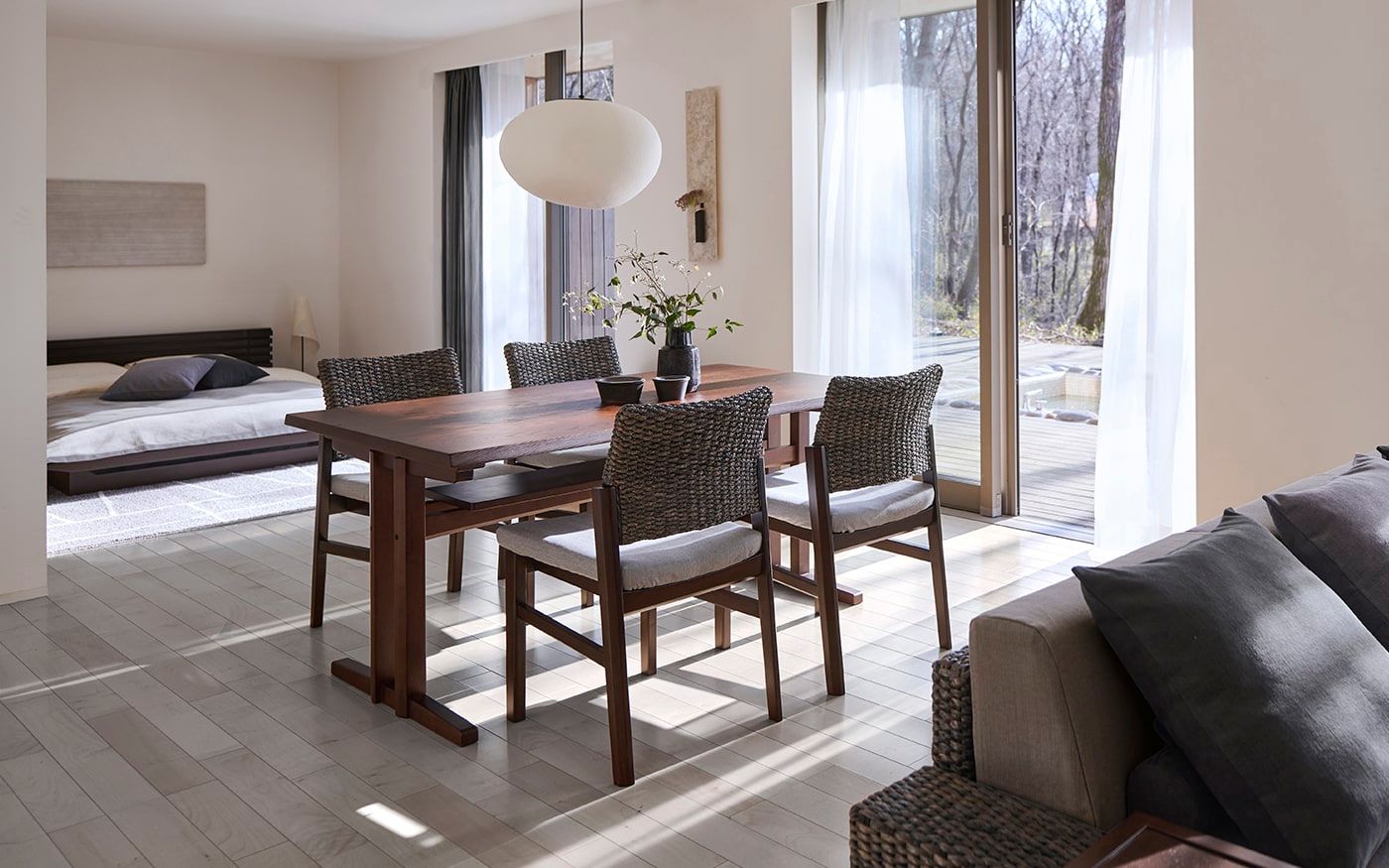 グレーに美しく染め上げたローソファや石のテーブルが主役のリビング。様々な自然素材をベースにしたグレーの家具とファブリックを用いて、モダンで優し気な空間に。雲霞を想わせるような、色とりどりのグレーで作り上げたカラーコーディネートに包まれて、心からリラックスできます。