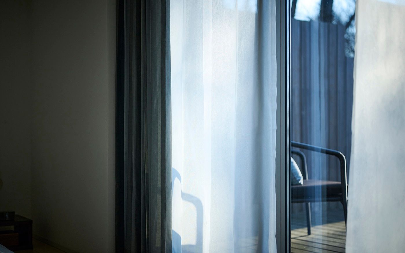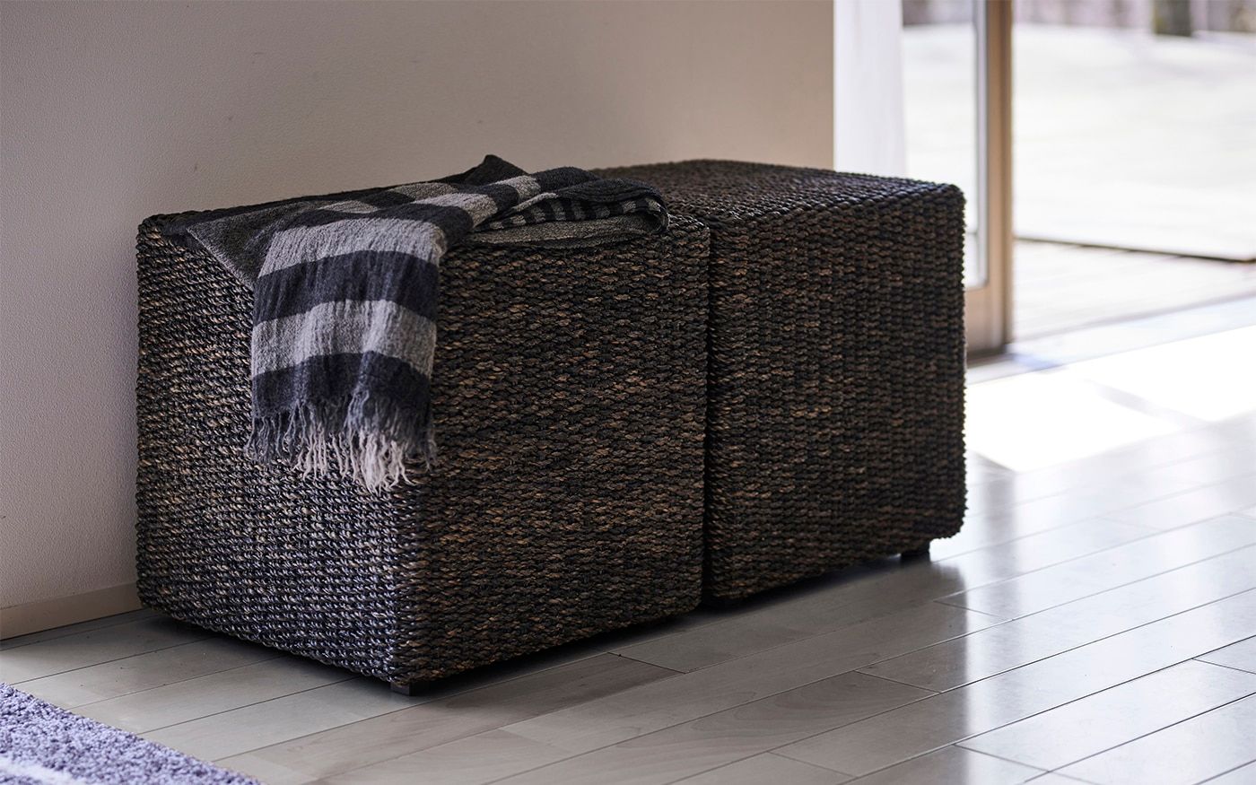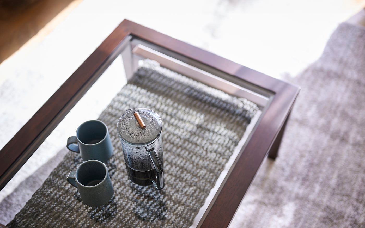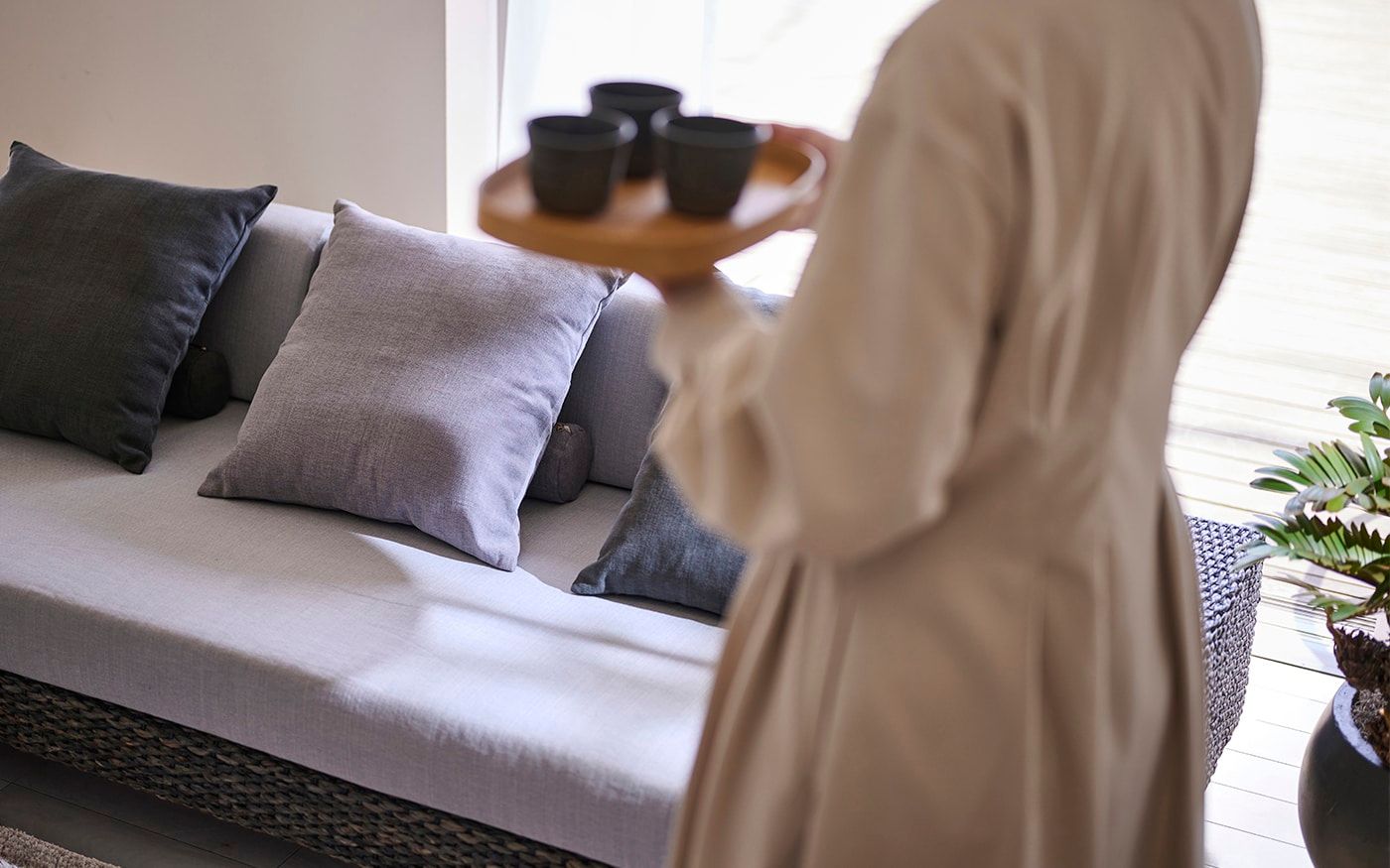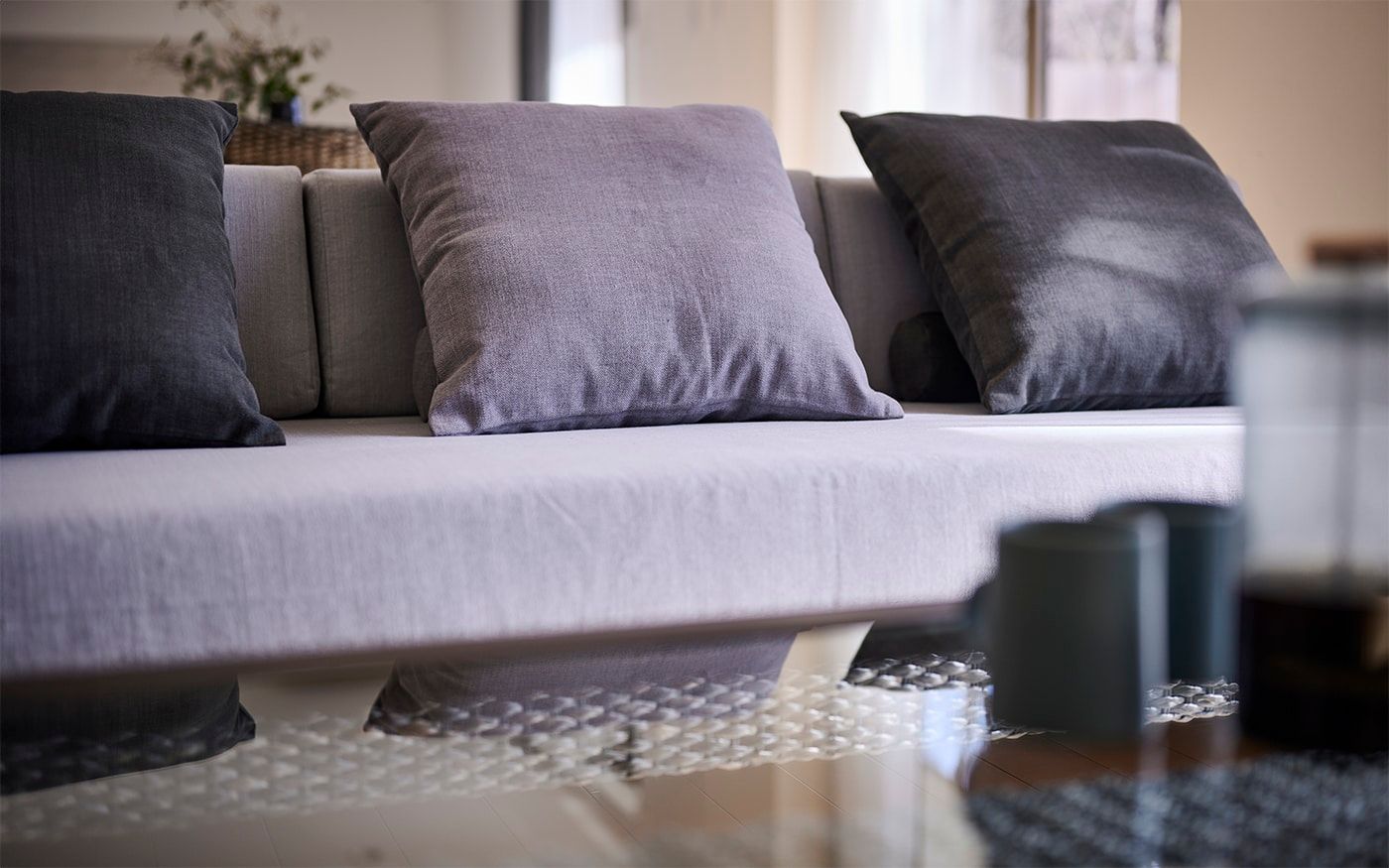 グレーに美しく染め上げたローソファや石のテーブルが主役のリビング。様々な自然素材をベースにしたグレーの家具とファブリックを用いて、モダンで優し気な空間に。雲霞を想わせるような、色とりどりのグレーで作り上げたカラーコーディネートに包まれて、心からリラックスできます。
