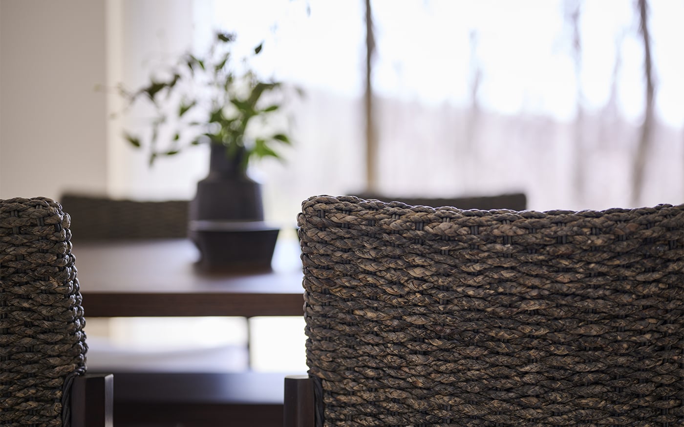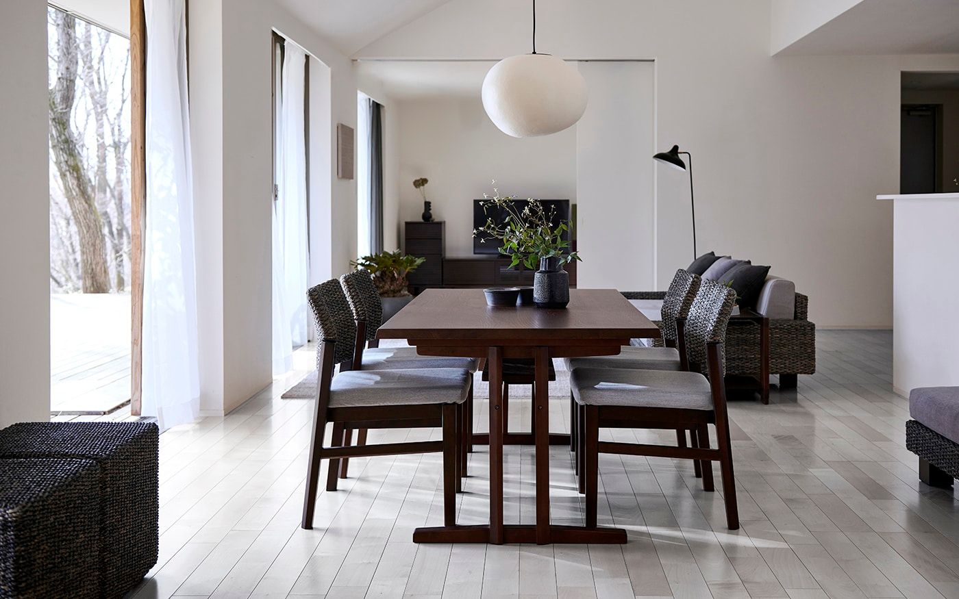 リビングのローソファと同じ自然素材のチェアを取り入れたダイニング。モダングレーのカラーコーディネートと、ダークブラウンの無垢材ダイニングテーブルの相性は抜群で、大人っぽさのあるおしゃれな食卓を楽しめるでしょう。