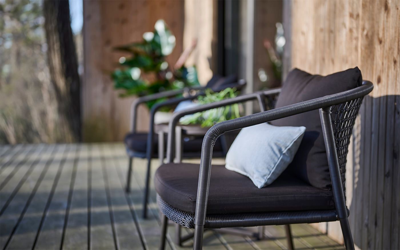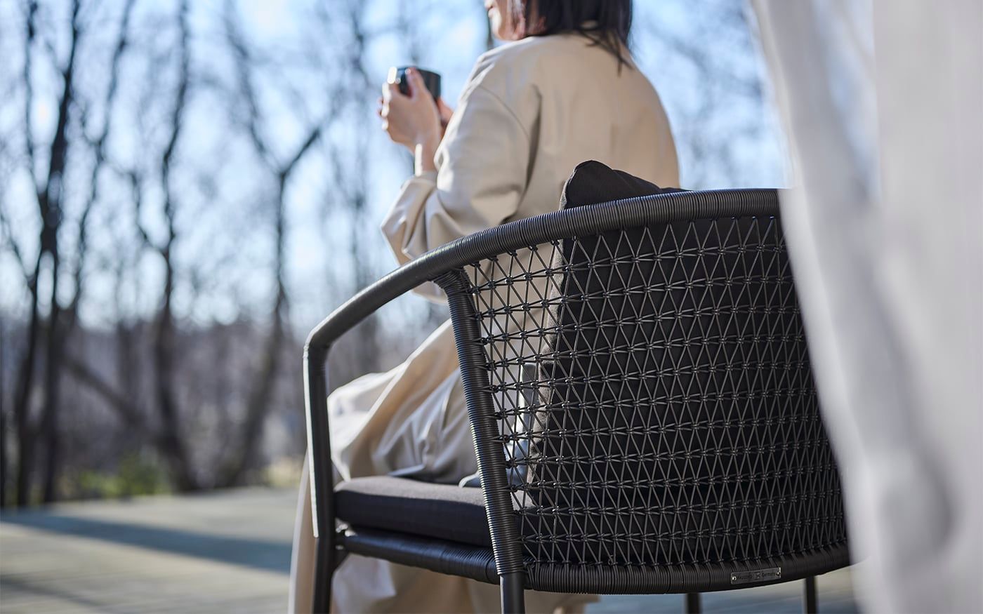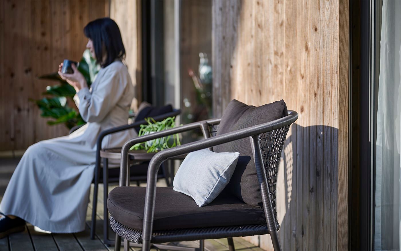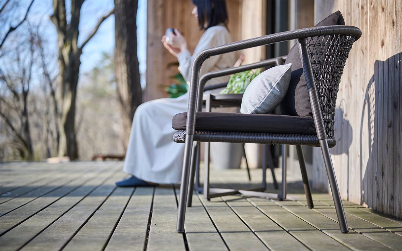 心地よい木々の木漏れ日を感じながら寛げるウッドテラス。編み込みタイプで自然な雰囲気も感じさせる屋外用家具をレイアウトして、モダンなグレーコーディネートを屋外空間にも取り入れました。