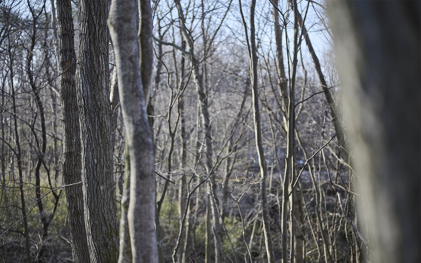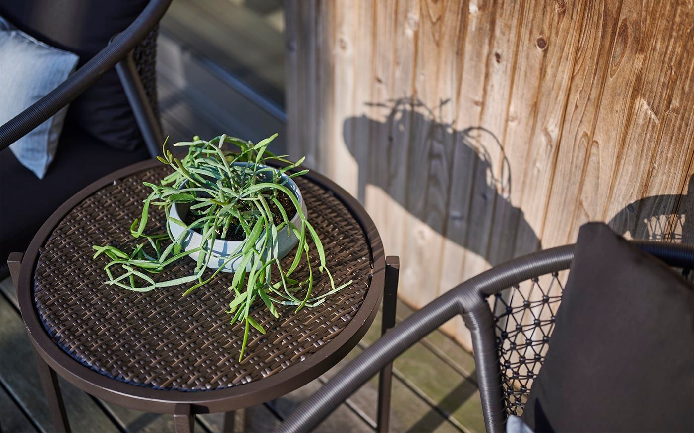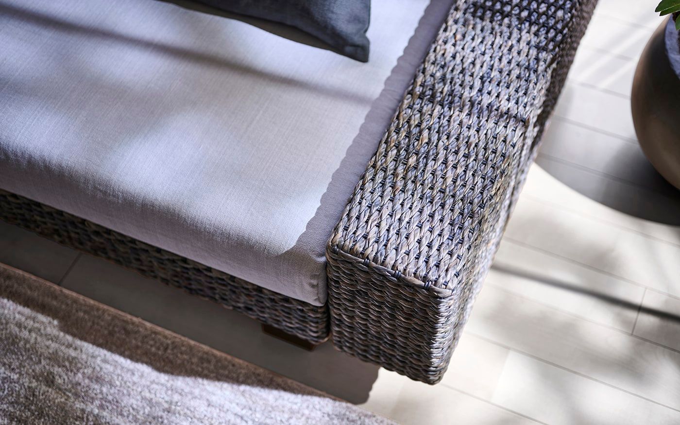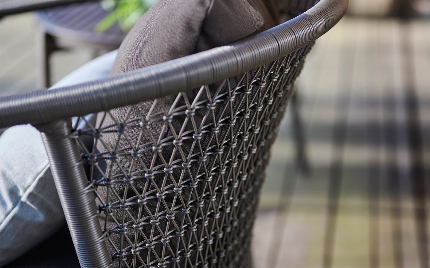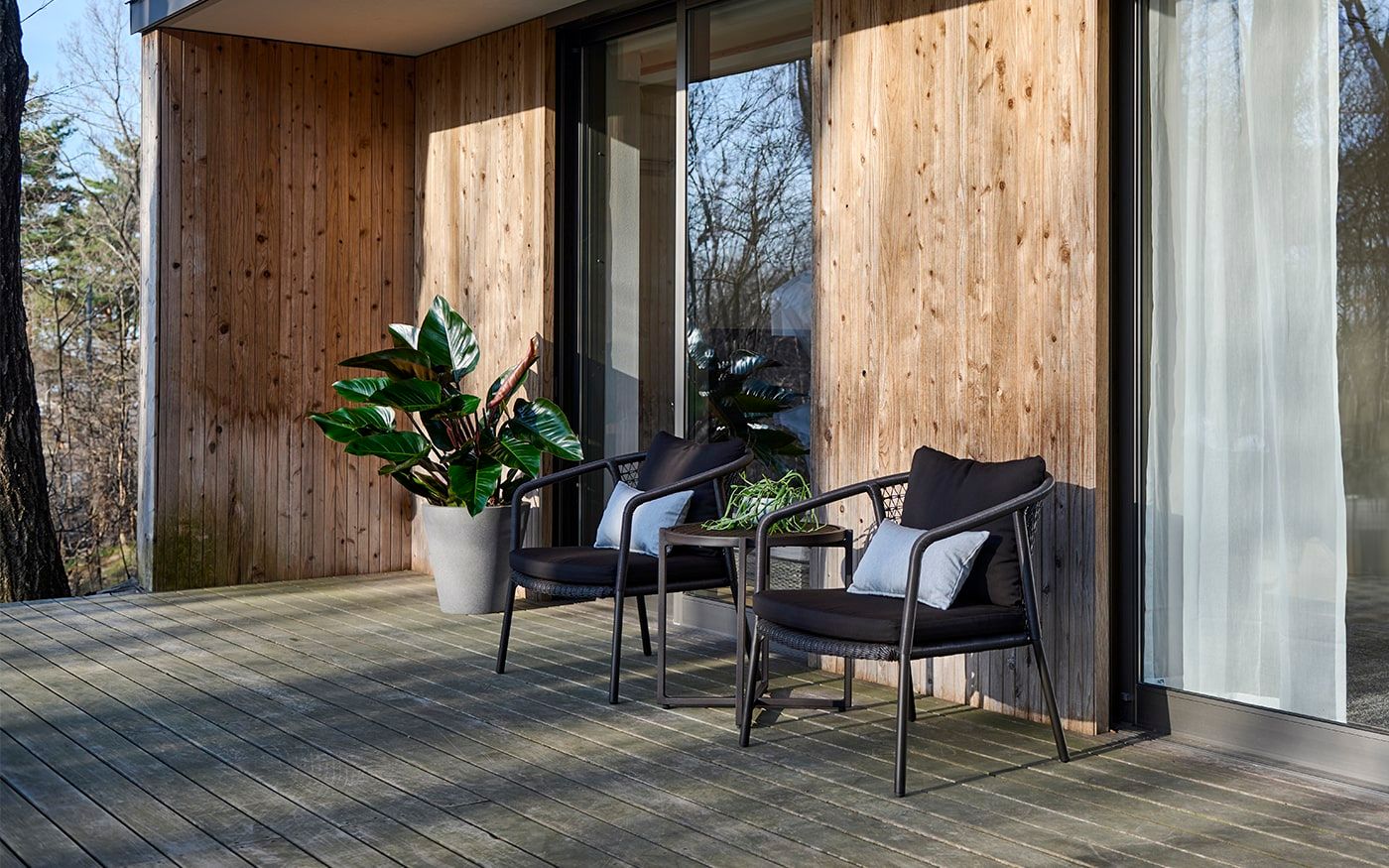 心地よい木々の木漏れ日を感じながら寛げるウッドテラス。編み込みタイプで自然な雰囲気も感じさせる屋外用家具をレイアウトして、モダンなグレーコーディネートを屋外空間にも取り入れました。