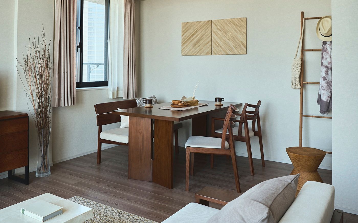 空気感を生み出す自然素材の家具に合わせて、柔らかなアースカラーのコーディネートをすることで、より一層心地良い部屋に仕上がります。内装と横浜の街並みが調和するファブリックコーデを取り入れました。