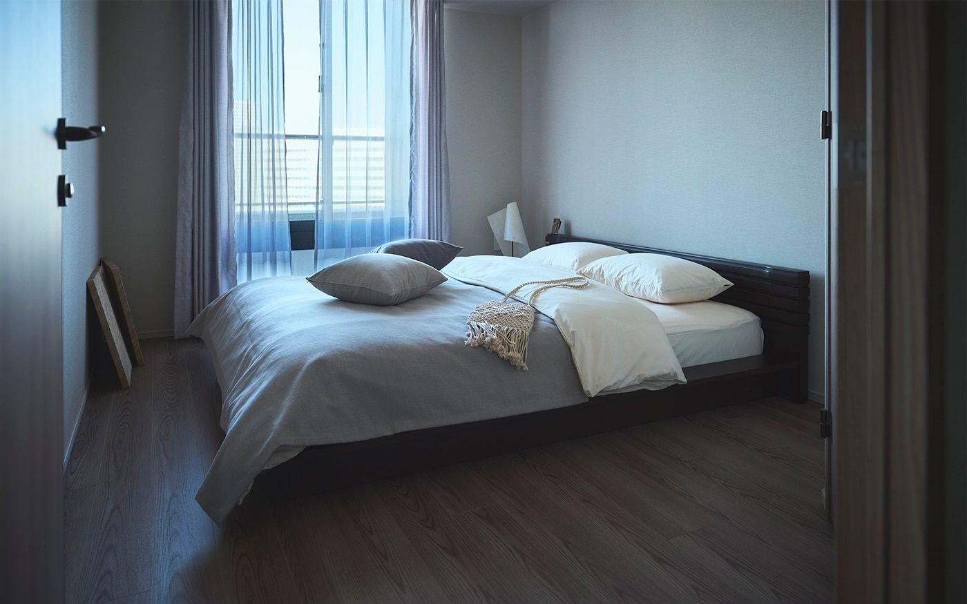 アースカラーの内装に合わせて、穏やかな空気感を演出した優しいグレーが奏でるモダンなベッドルーム。グレーの持つ洗練された雰囲気と心が落ち着く寝室作りが魅力的です。ローベッドを取り入れたことで、開放的なムードに包まれています。