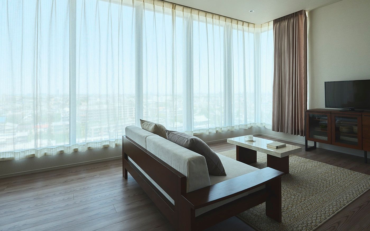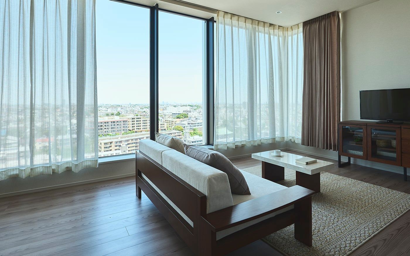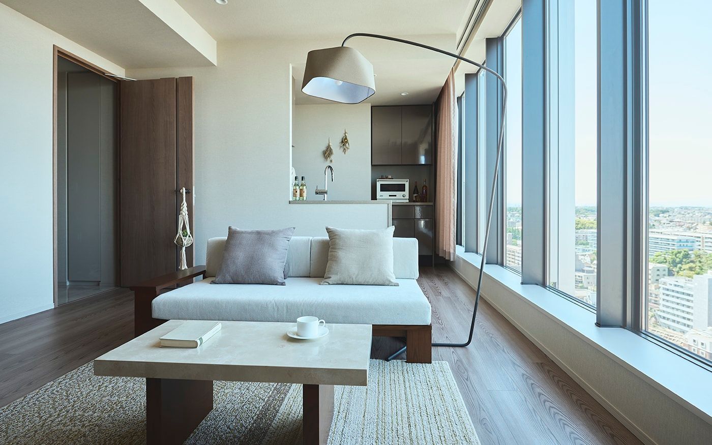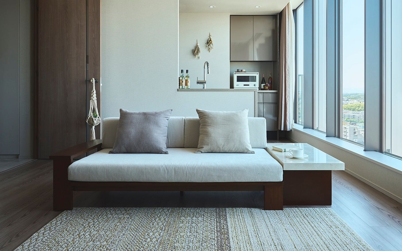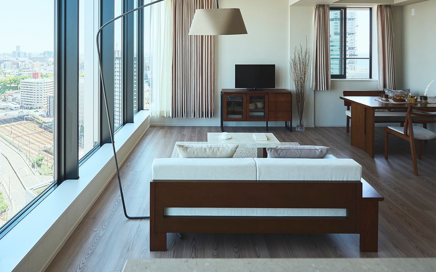 空気感を生み出す自然素材の家具に合わせて、柔らかなアースカラーのコーディネートをすることで、より一層心地良い部屋に仕上がります。内装と横浜の街並みが調和するファブリックコーデを取り入れました。