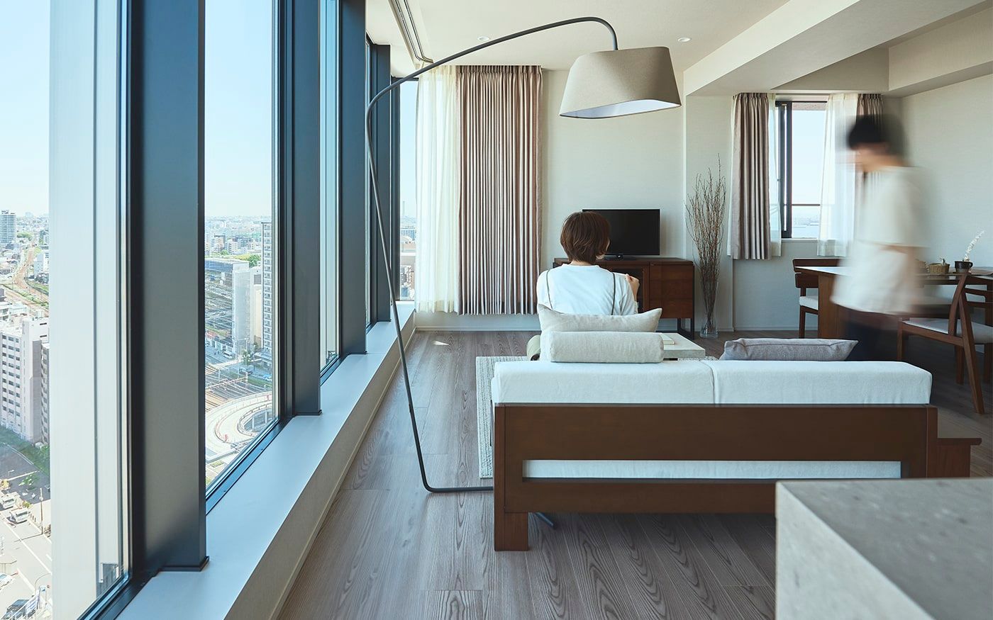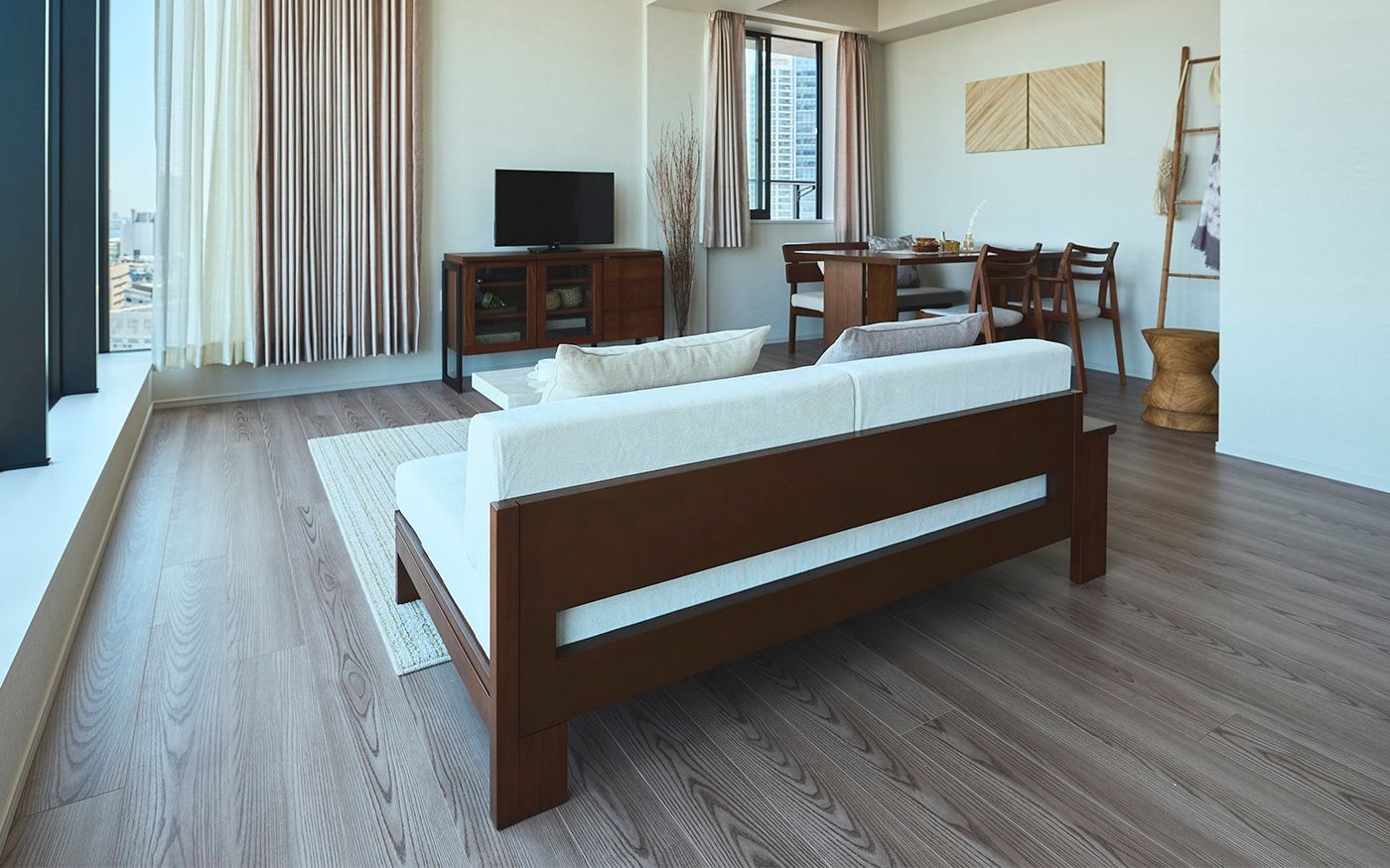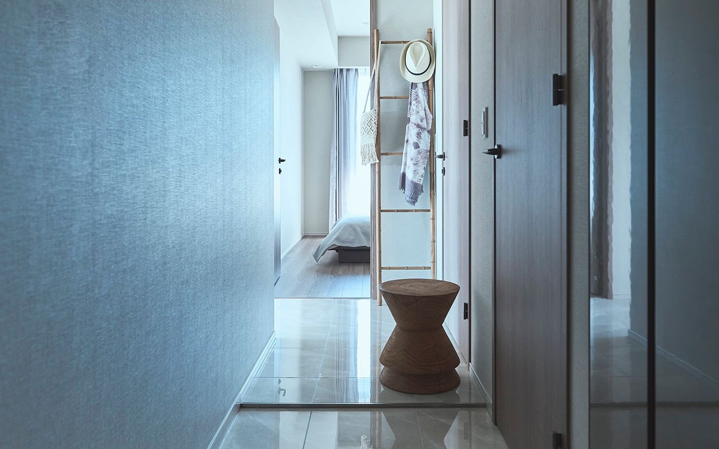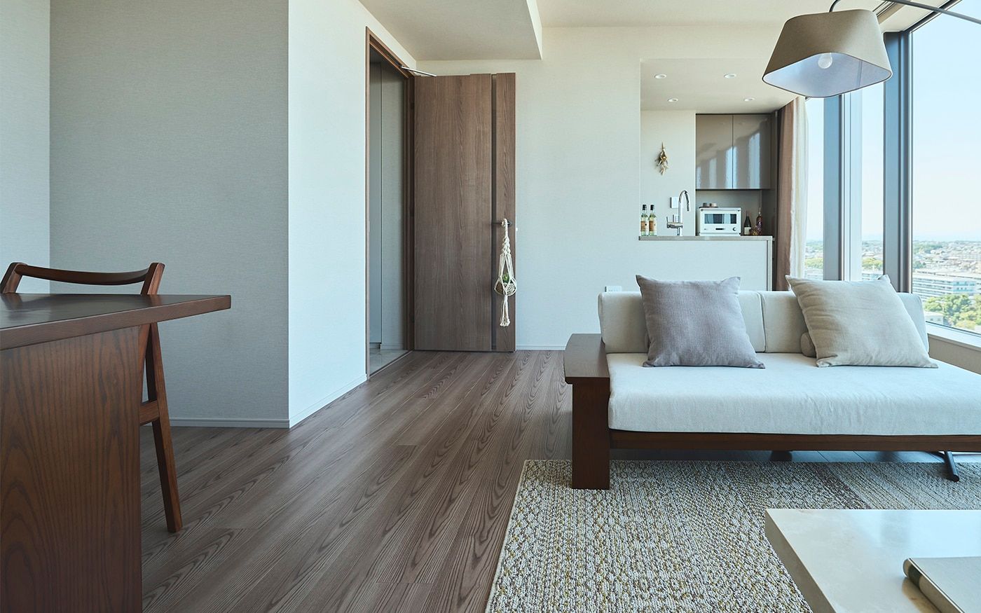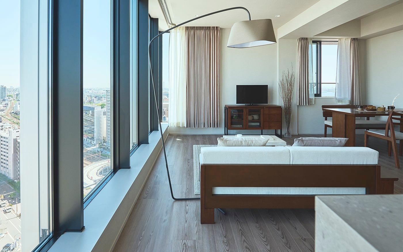 空気感を生み出す自然素材の家具に合わせて、柔らかなアースカラーのコーディネートをすることで、より一層心地良い部屋に仕上がります。内装と横浜の街並みが調和するファブリックコーデを取り入れました。