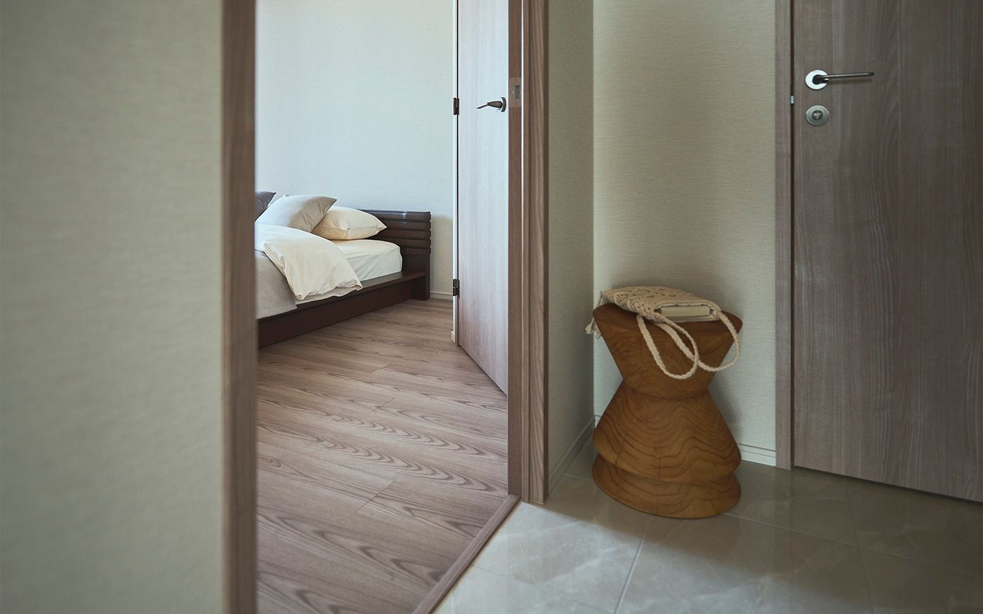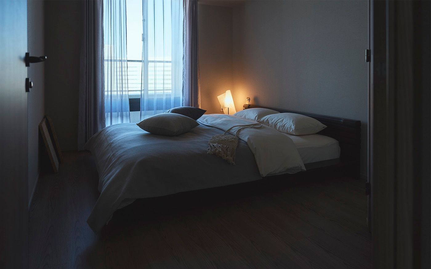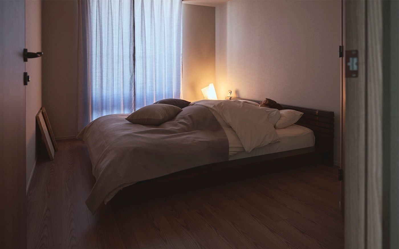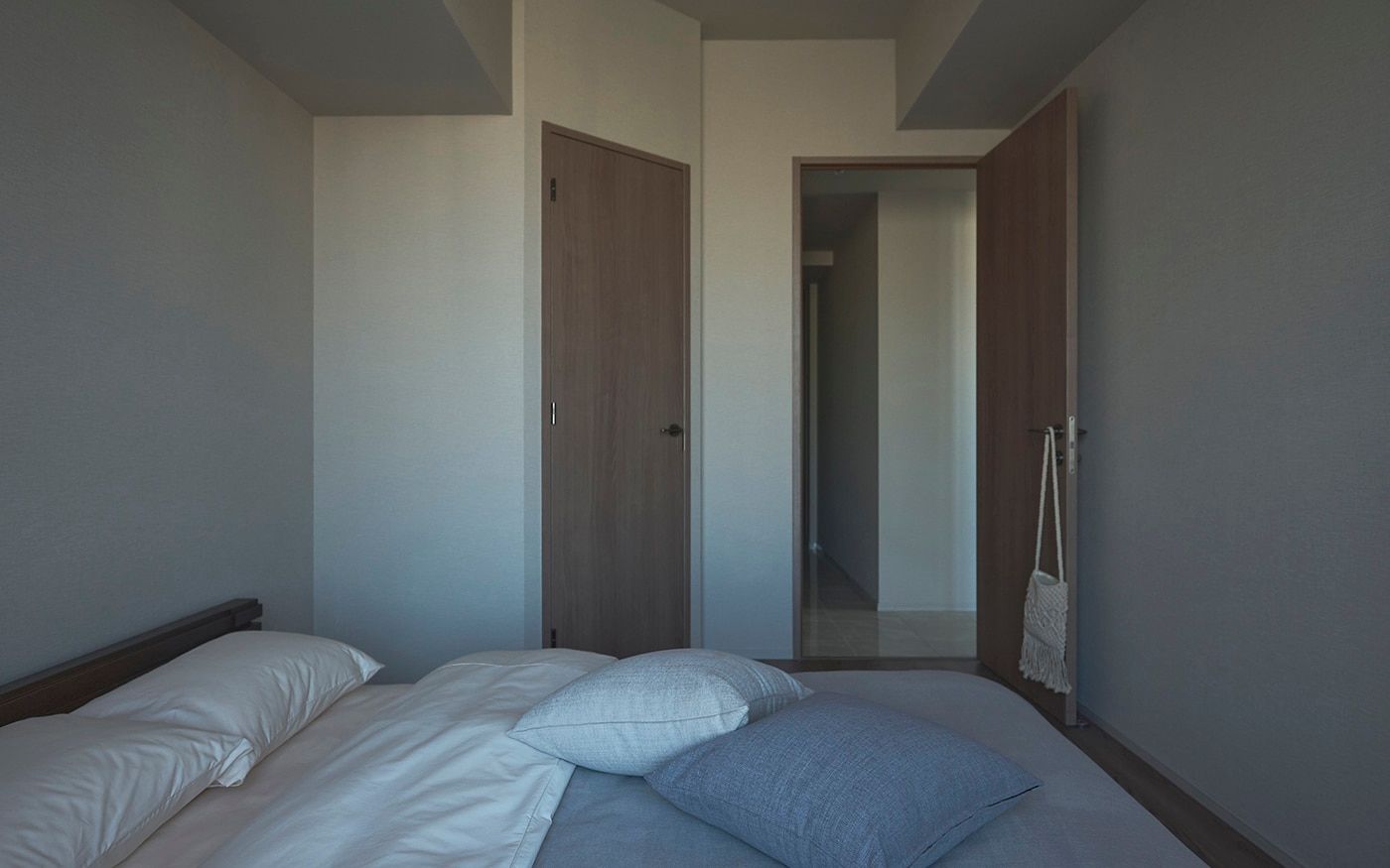アースカラーの内装に合わせて、穏やかな空気感を演出した優しいグレーが奏でるモダンなベッドルーム。グレーの持つ洗練された雰囲気と心が落ち着く寝室作りが魅力的です。ローベッドを取り入れたことで、開放的なムードに包まれています。