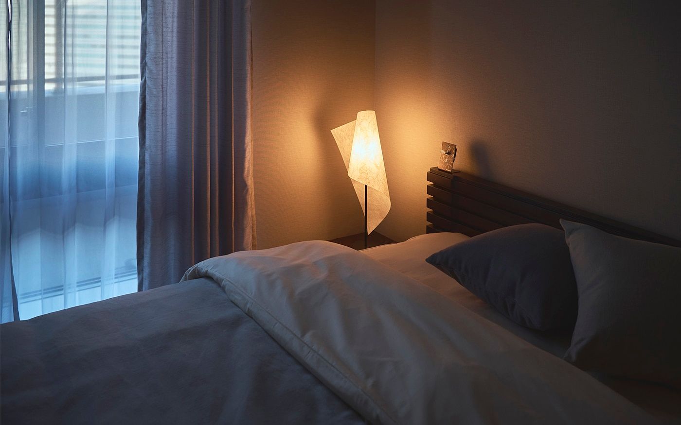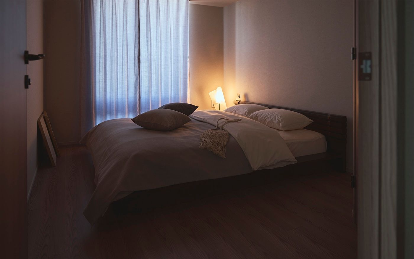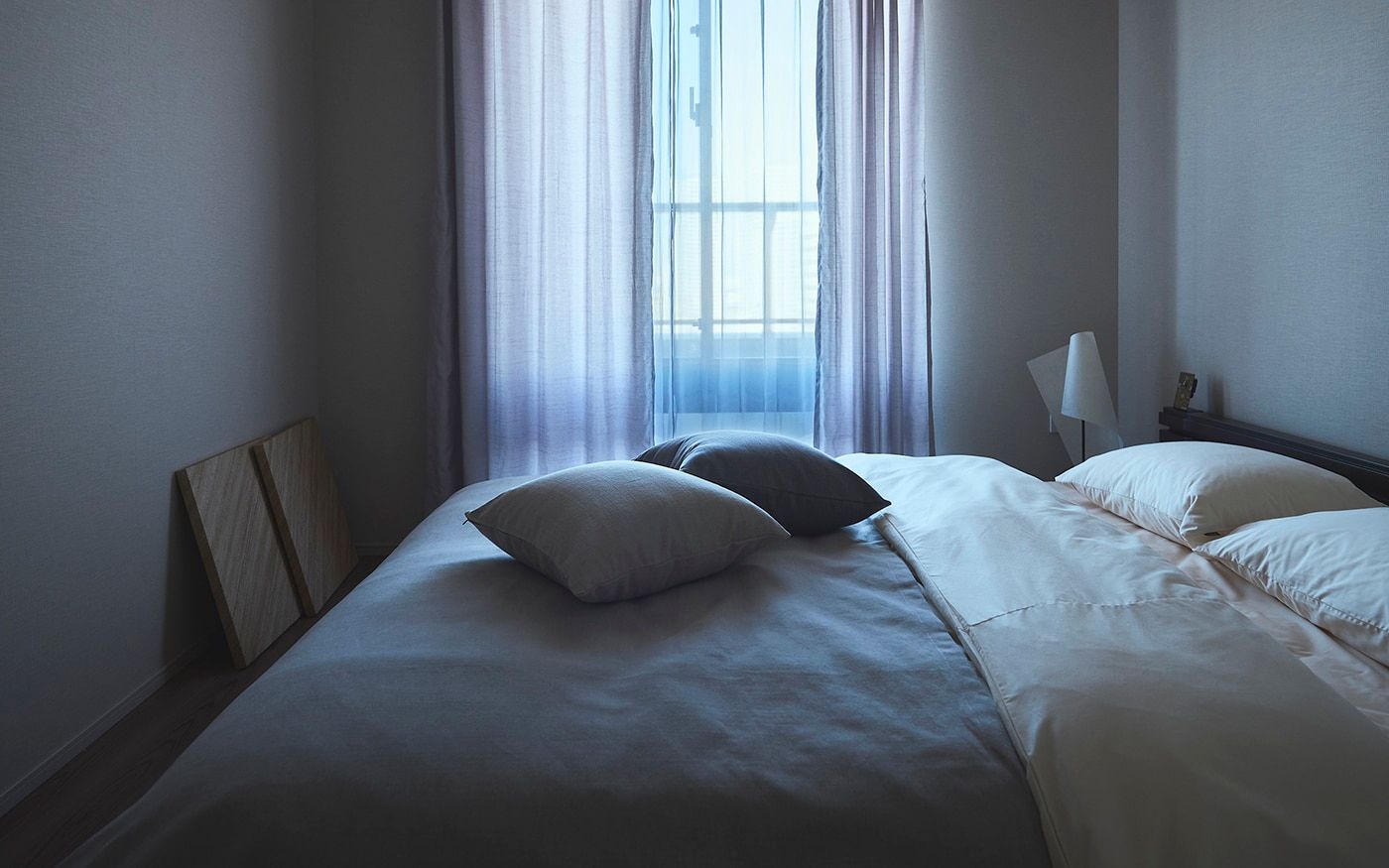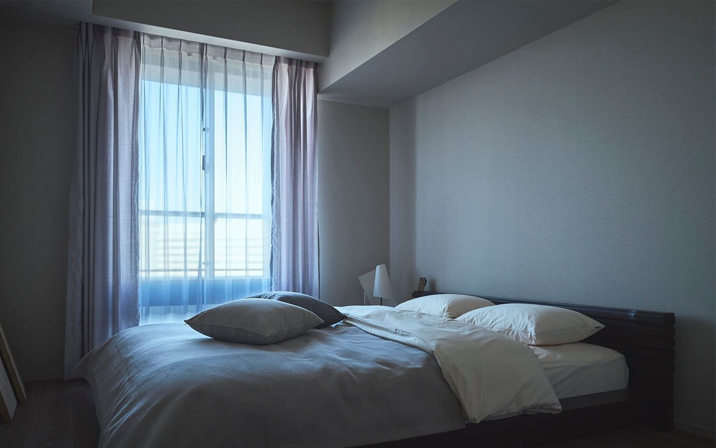 アースカラーの内装に合わせて、穏やかな空気感を演出した優しいグレーが奏でるモダンなベッドルーム。グレーの持つ洗練された雰囲気と心が落ち着く寝室作りが魅力的です。ローベッドを取り入れたことで、開放的なムードに包まれています。