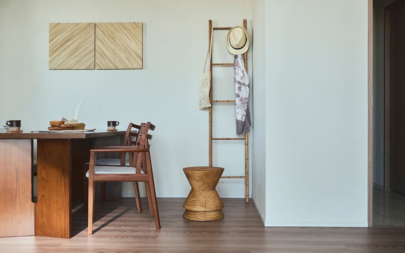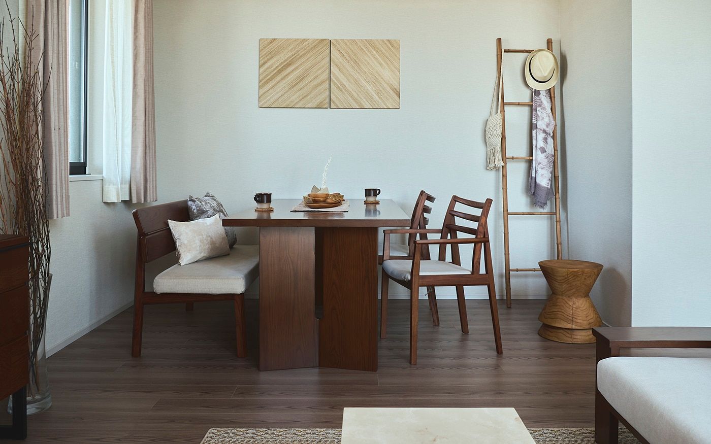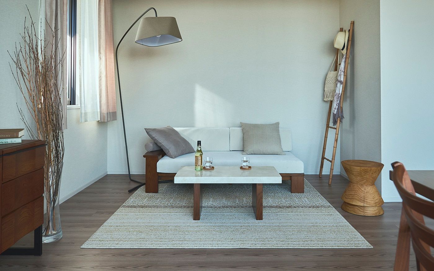 雄大な大地の色合いからインスピレーションを得た、アースカラーズ・スタイルのコーディネート。優しいベージュやアイボリーのファブリックを纏い、時間がゆっくり流れるような空間を作れます。