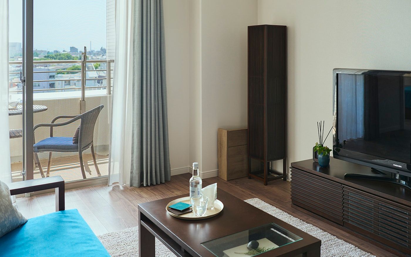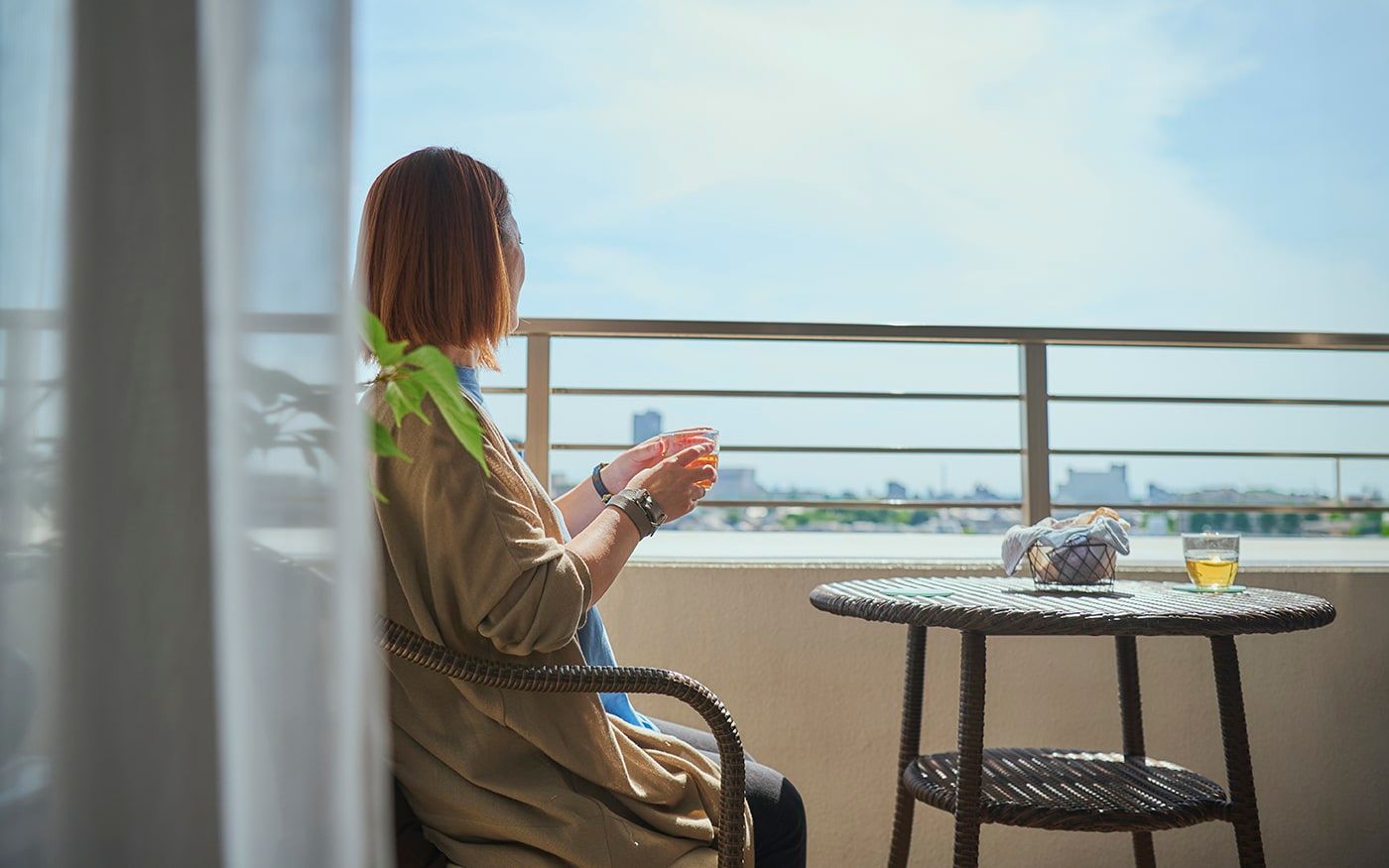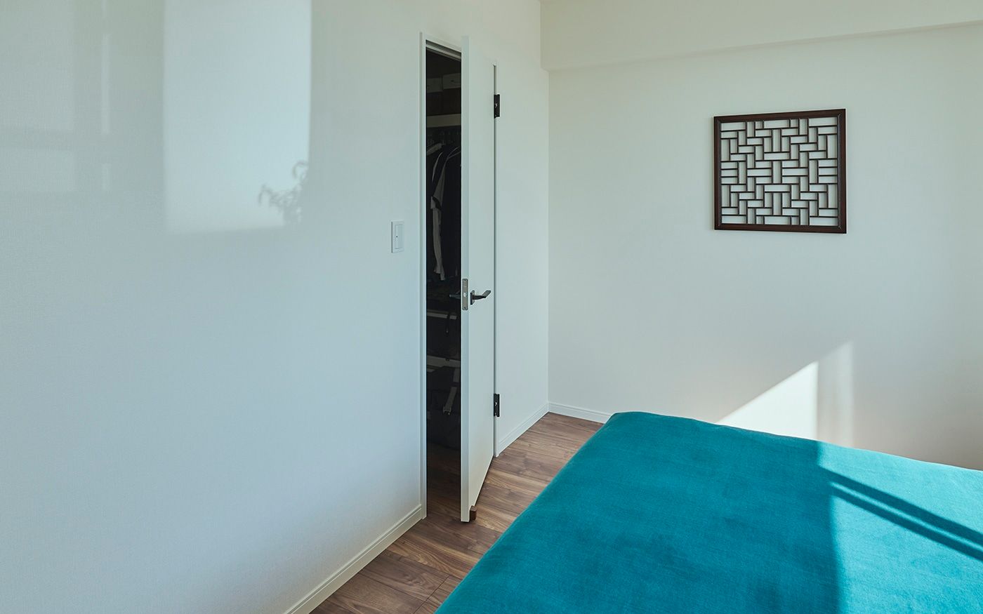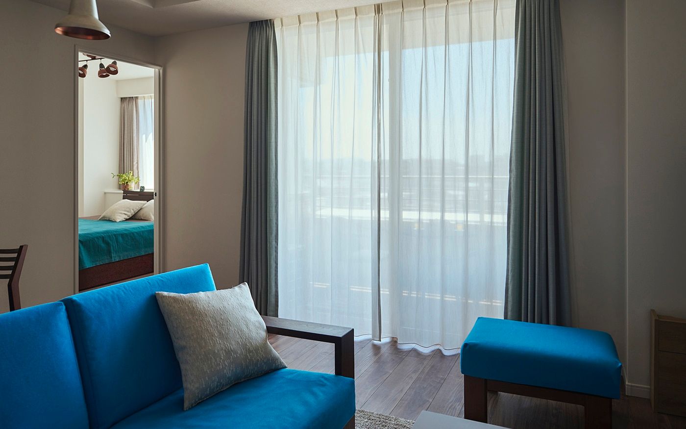お客様が快適な空間を実現されたポイントの一つが、インテリアとカラーコーディネートへのこだわりです。ラグやカーテンは柔らかな色を選び、リラックスできる雰囲気を演出。また、アクセントとして景色とマッチするベッドカバーやクッションを加えることで、お部屋に明るさと個性を与えています。