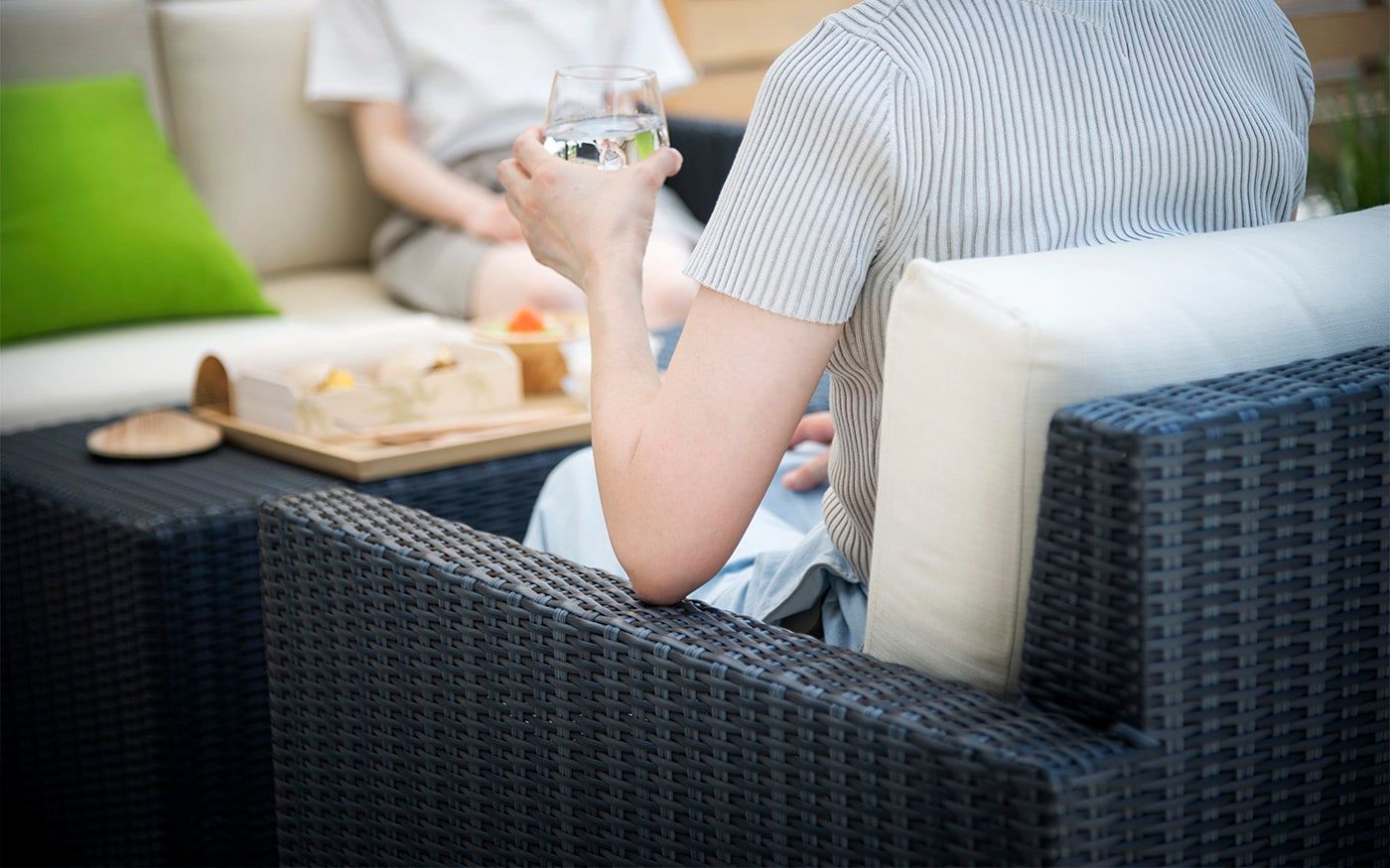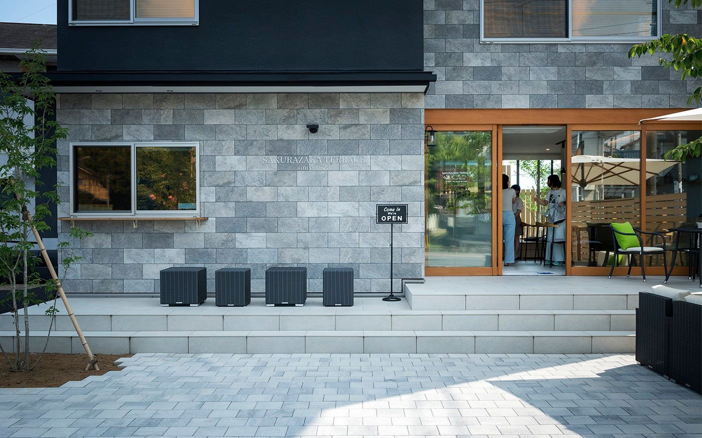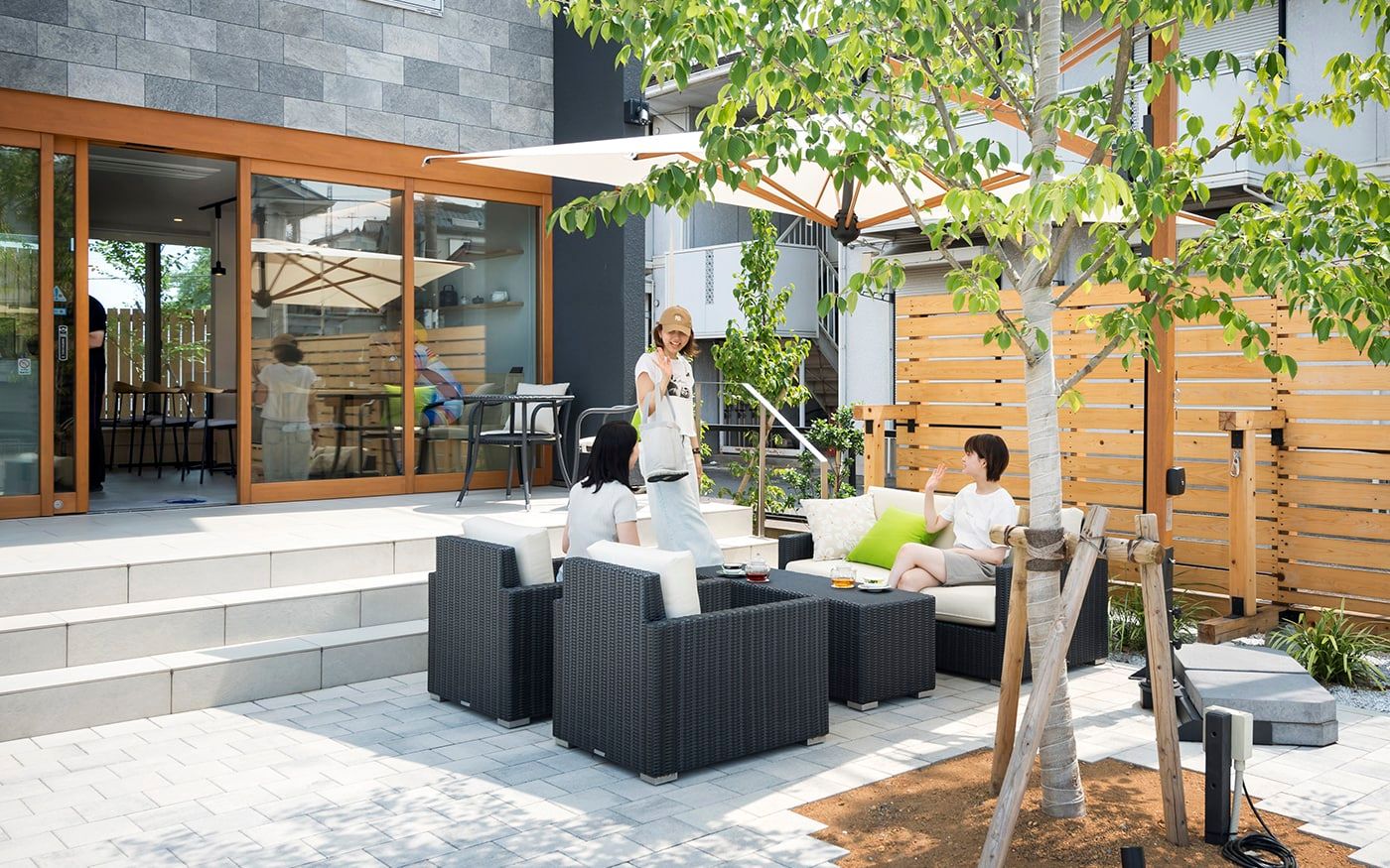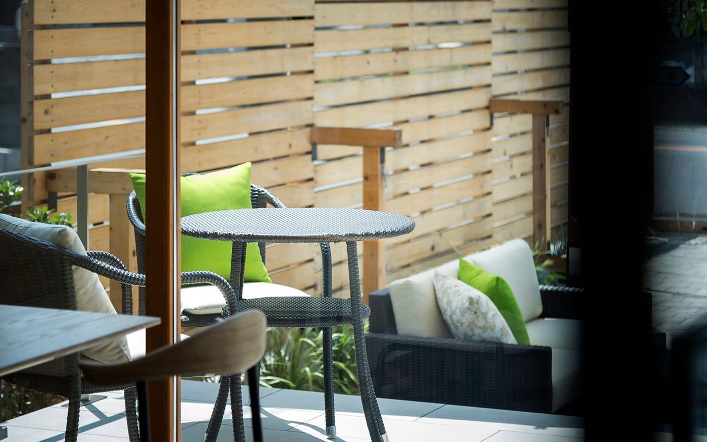 開放的なインターロッキングスペースでは、チャコールグレーのモダンなテラス席がお出迎え。ソファ席とテーブル席をサポートするスツールも小粋な演出に。くつろぎ度を増す色鮮やかなライムグリーンのクッションが桜の季節を一層盛り上げてくれるでしょう。