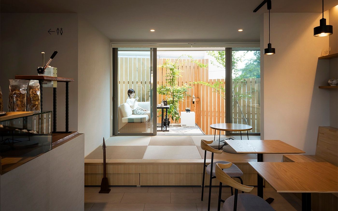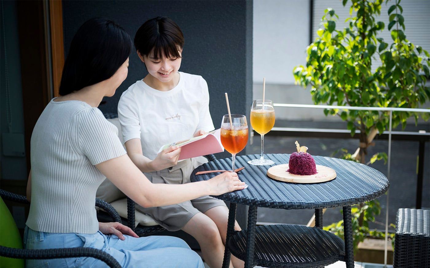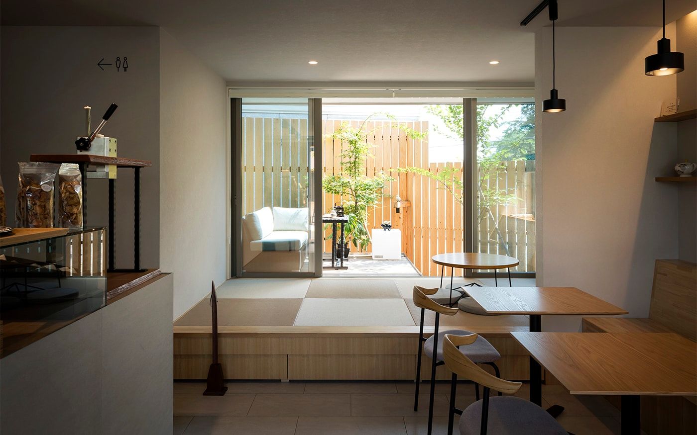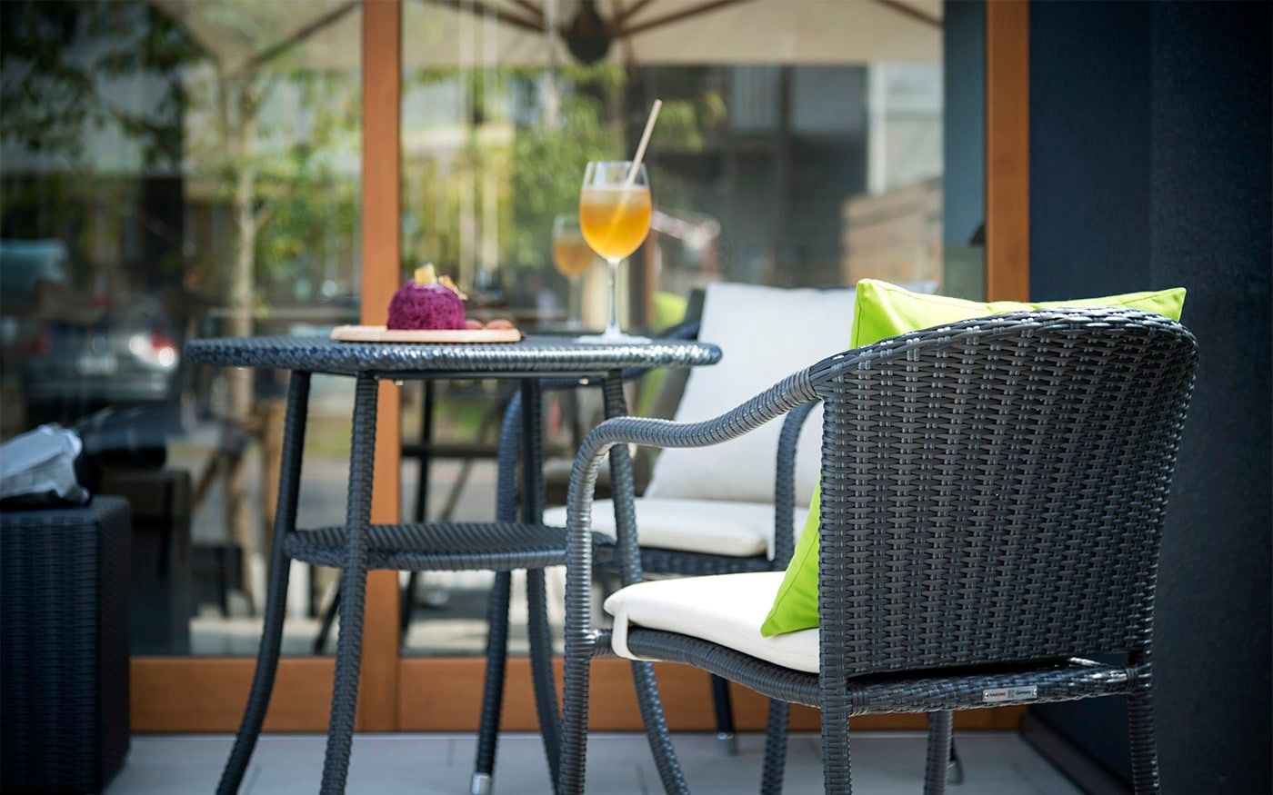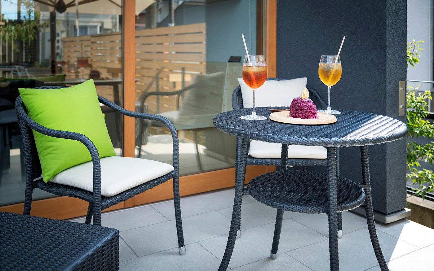 開放的なインターロッキングスペースでは、チャコールグレーのモダンなテラス席がお出迎え。ソファ席とテーブル席をサポートするスツールも小粋な演出に。くつろぎ度を増す色鮮やかなライムグリーンのクッションが桜の季節を一層盛り上げてくれるでしょう。