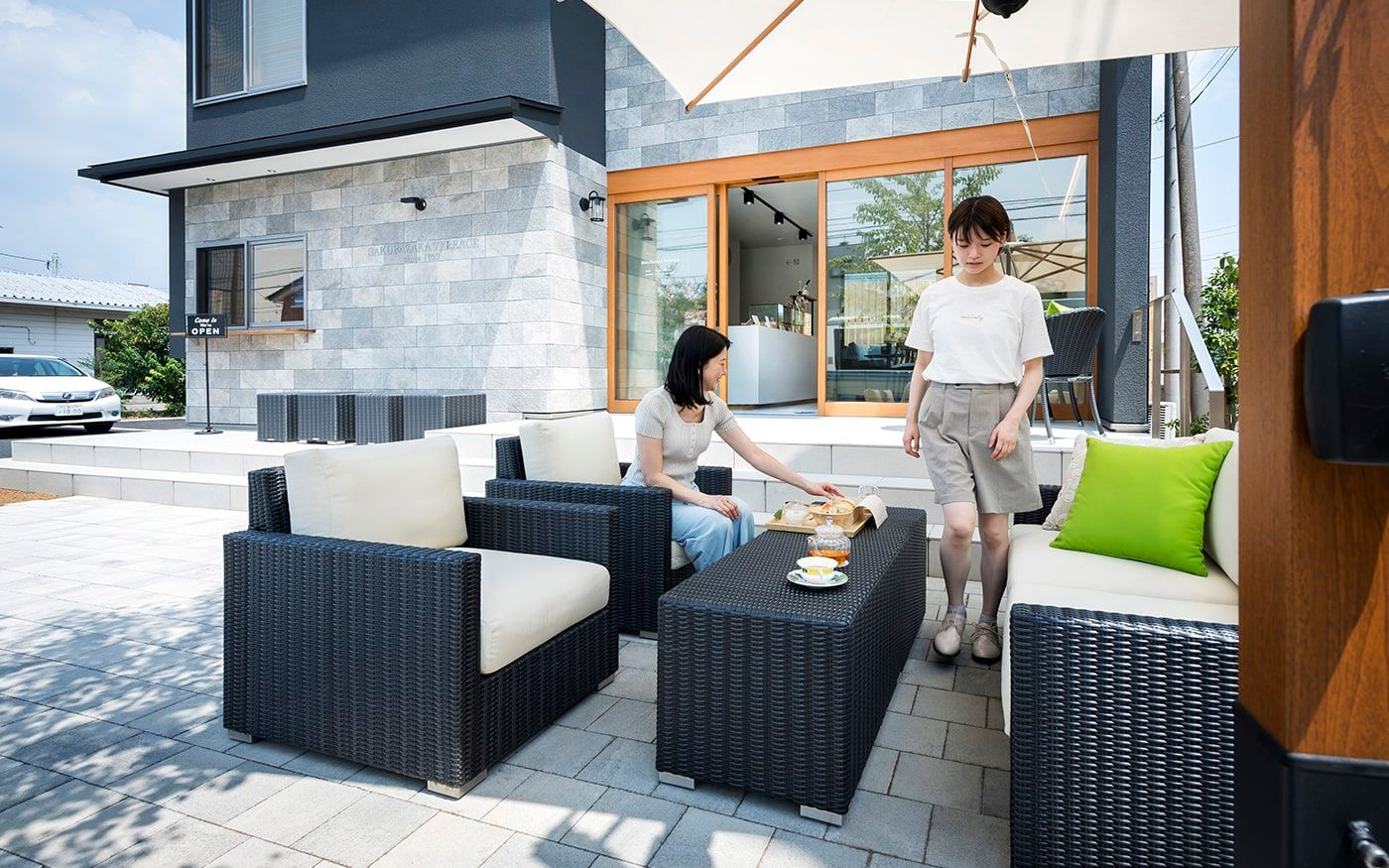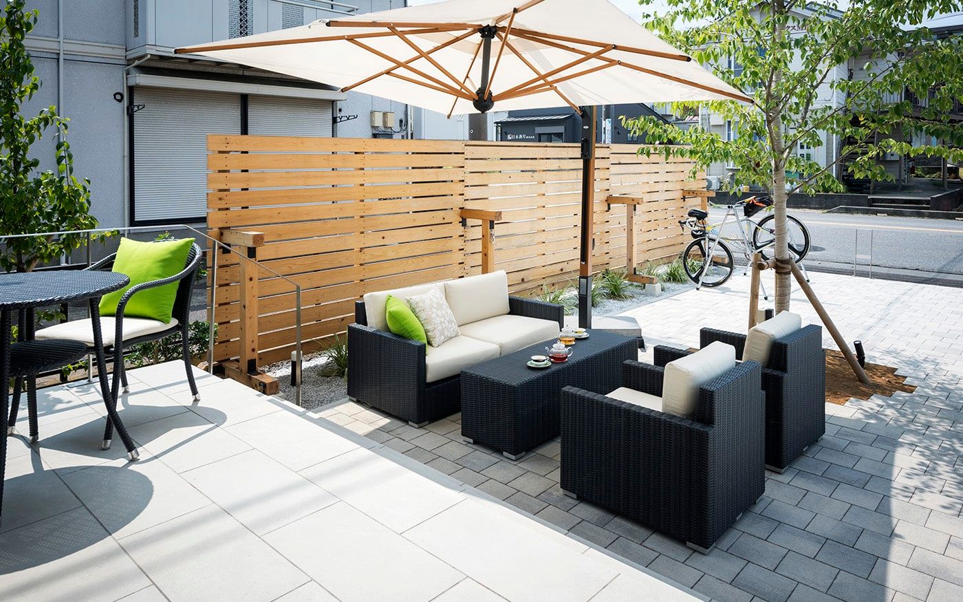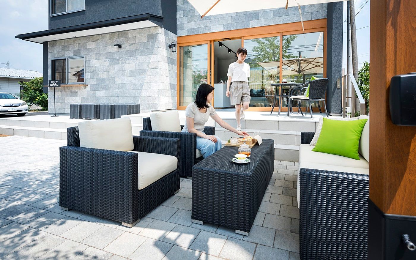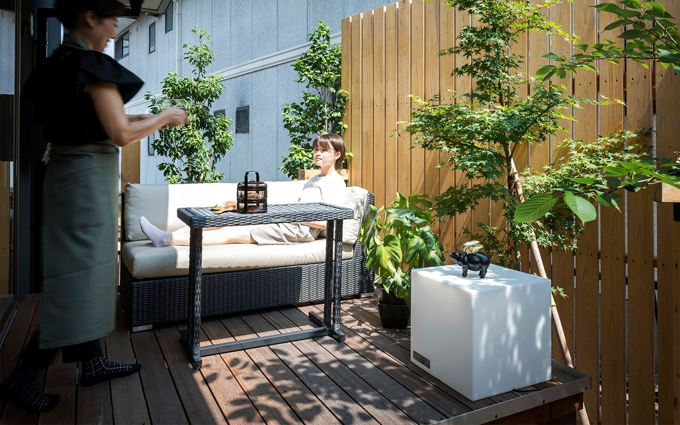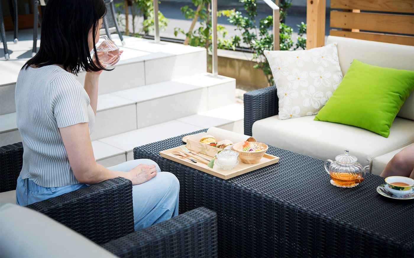 趣を感じる中庭では肩肘ソファ&コンパクトテーブルで一息つくこともでき、快適な屋外用ソファと絶品フードで素敵な時間をお過ごし頂けます。個室のように屋外空間でもプライベートタイムを満喫できる贅沢スペースに仕上げました。