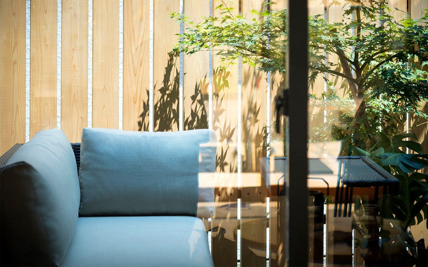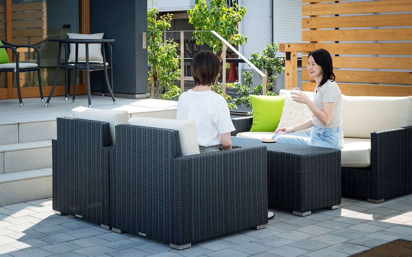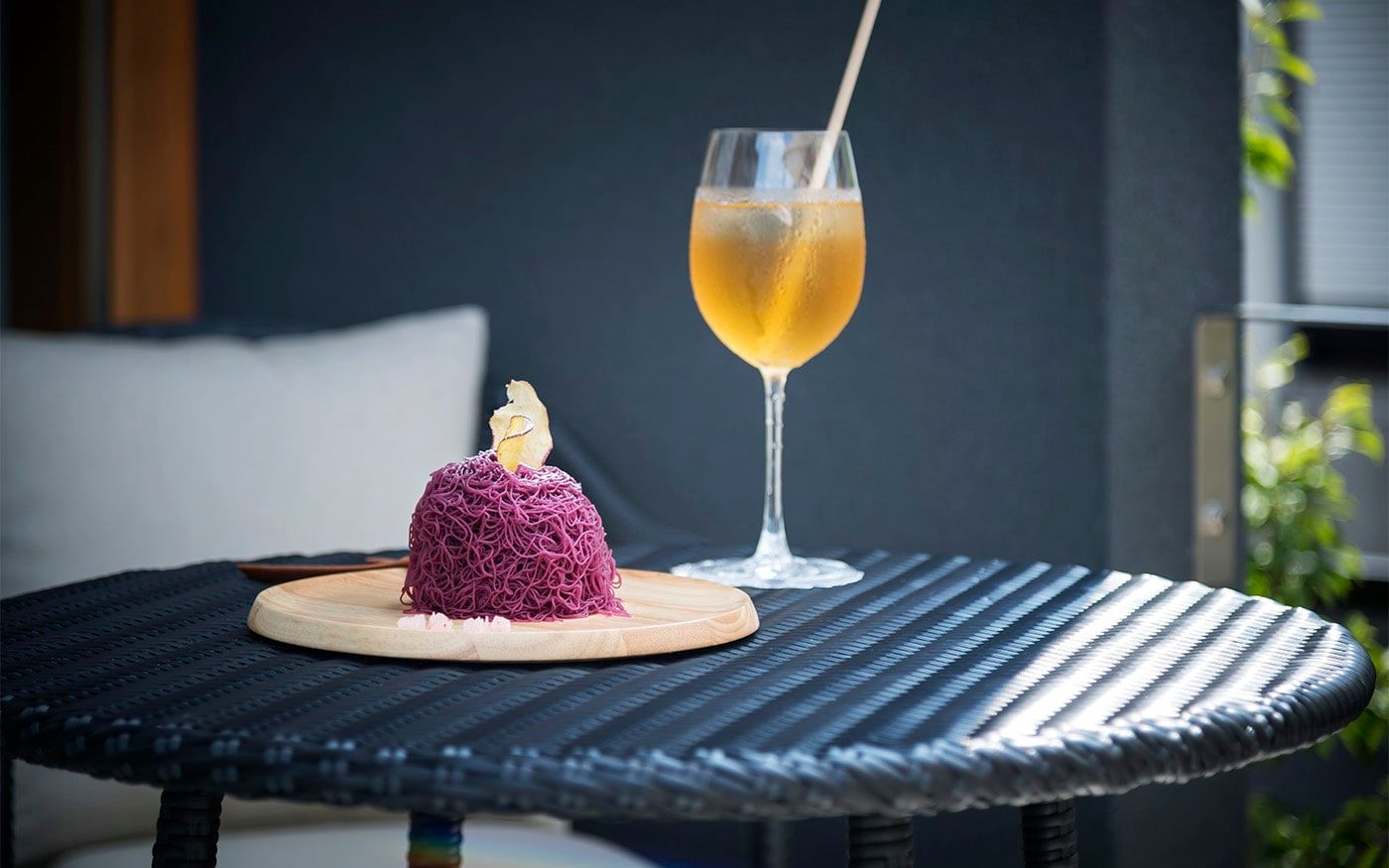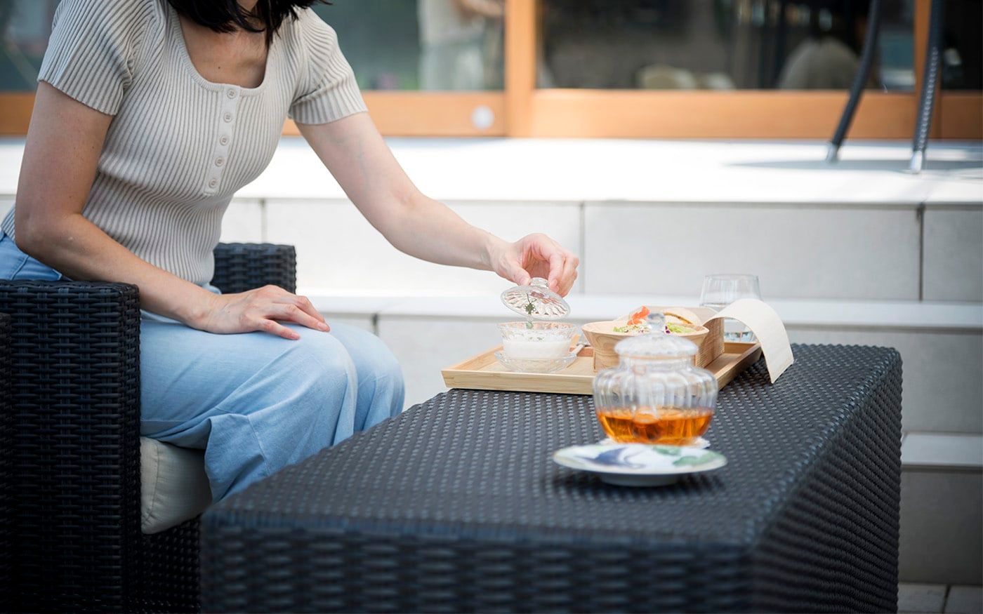 趣を感じる中庭では肩肘ソファ&コンパクトテーブルで一息つくこともでき、快適な屋外用ソファと絶品フードで素敵な時間をお過ごし頂けます。個室のように屋外空間でもプライベートタイムを満喫できる贅沢スペースに仕上げました。