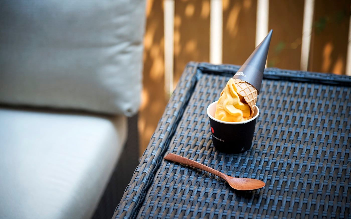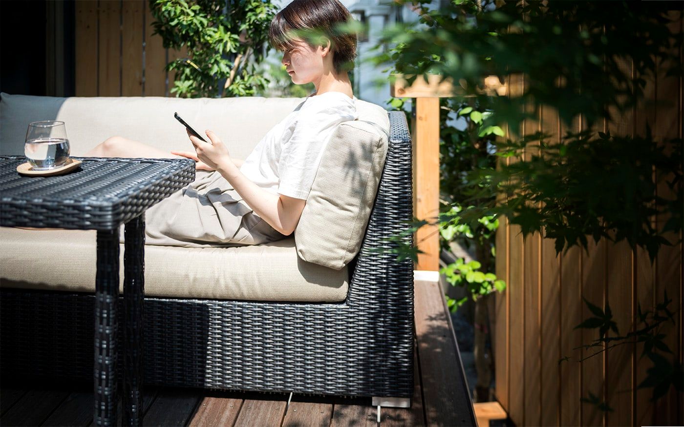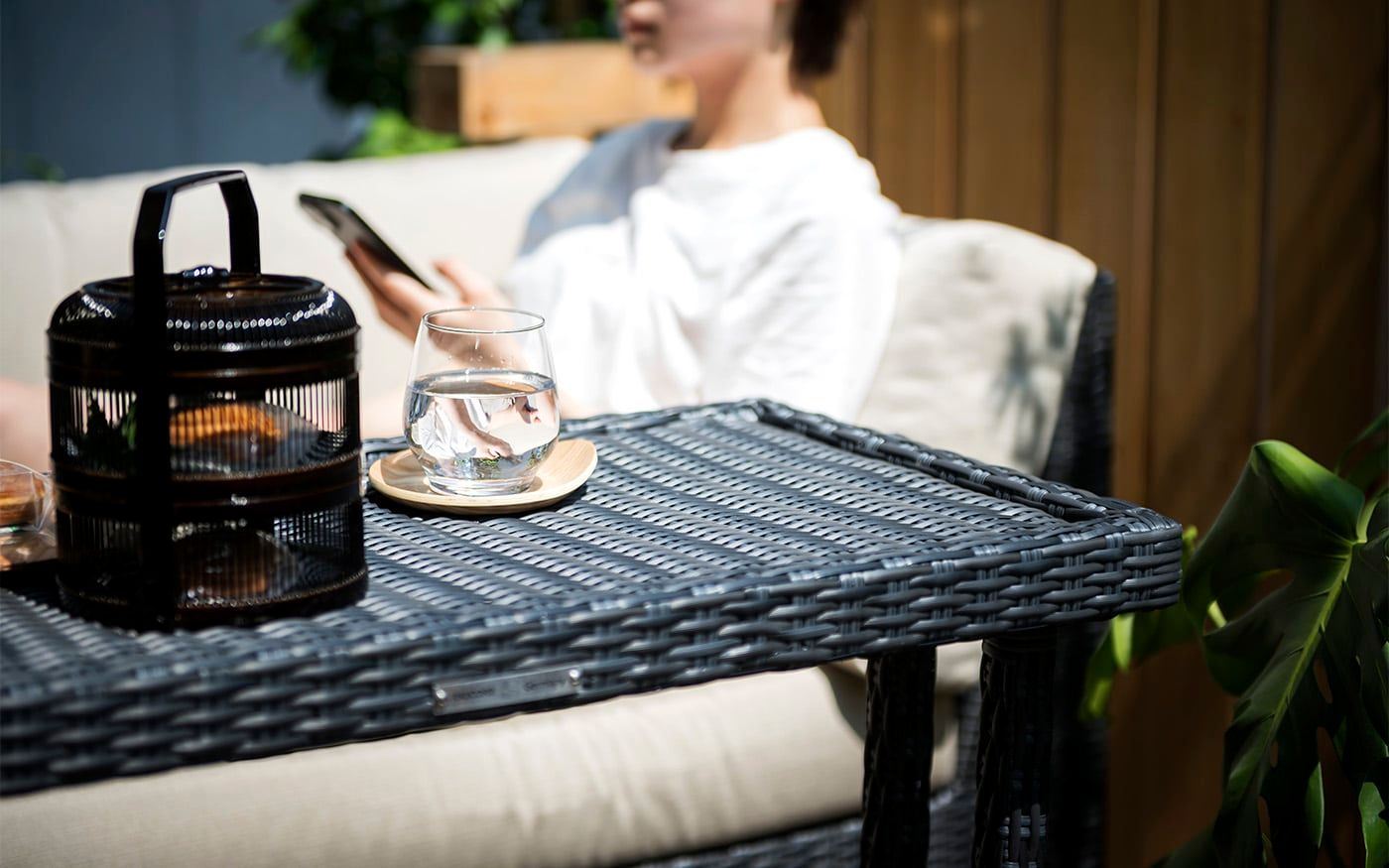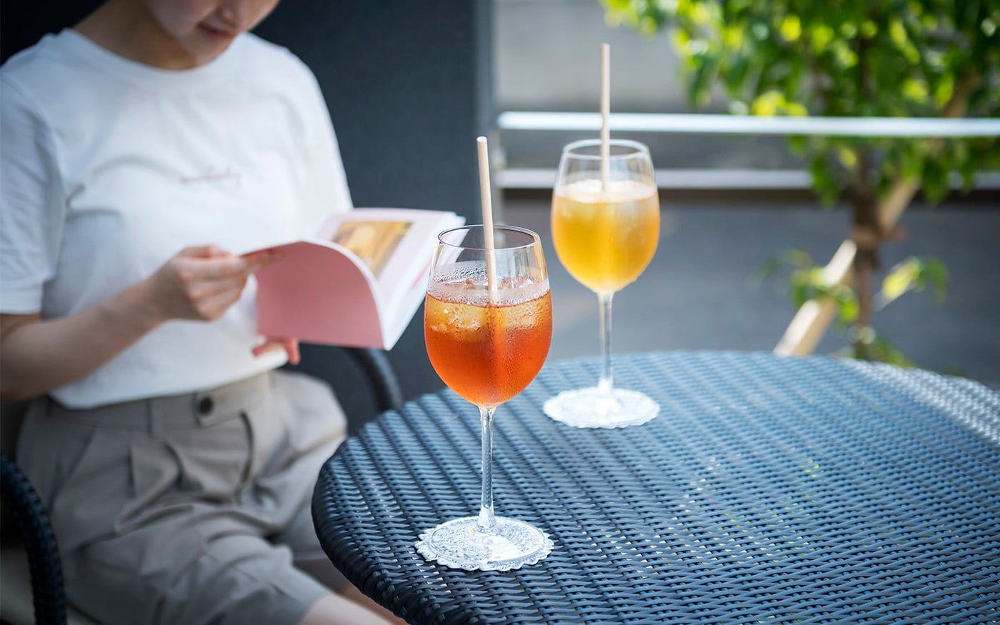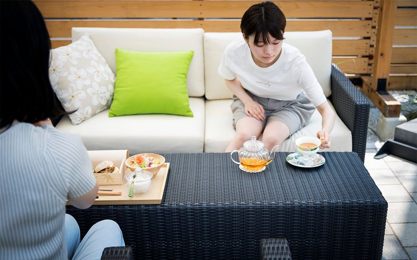 趣を感じる中庭では肩肘ソファ&コンパクトテーブルで一息つくこともでき、快適な屋外用ソファと絶品フードで素敵な時間をお過ごし頂けます。個室のように屋外空間でもプライベートタイムを満喫できる贅沢スペースに仕上げました。