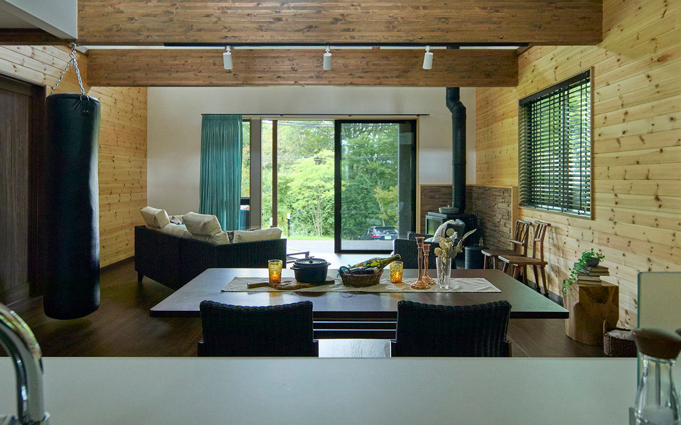 軽井沢の別荘にふさわしい、ウッド調の内装や建具、暖炉のダークカラーに映えるシックな家具でコーディネート。広い窓に映し出される、グリーンの自然と調和する色や柄のインテリアも取り入れて、借景との一体感を演出しました。