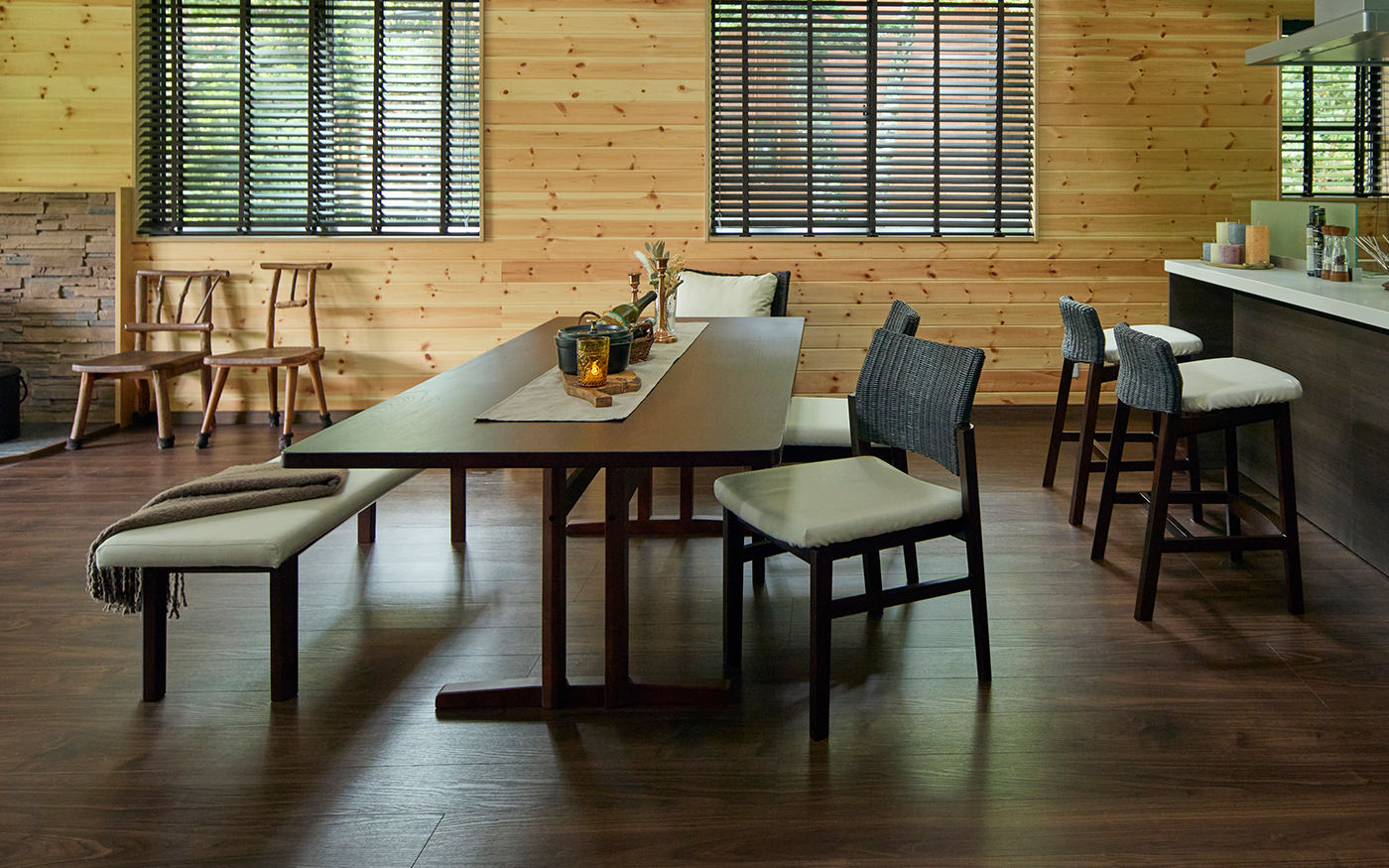 別荘のダイニングで日常とは異なる寛ぎを楽しめるスペースを作るにはチェア選びが大事に。異なるダイニングチェアやラウンジチェア、ベンチ、カウンターチェアを配置し、自由なスタイルで寛ぎの別荘ライフを満喫できるでしょう。