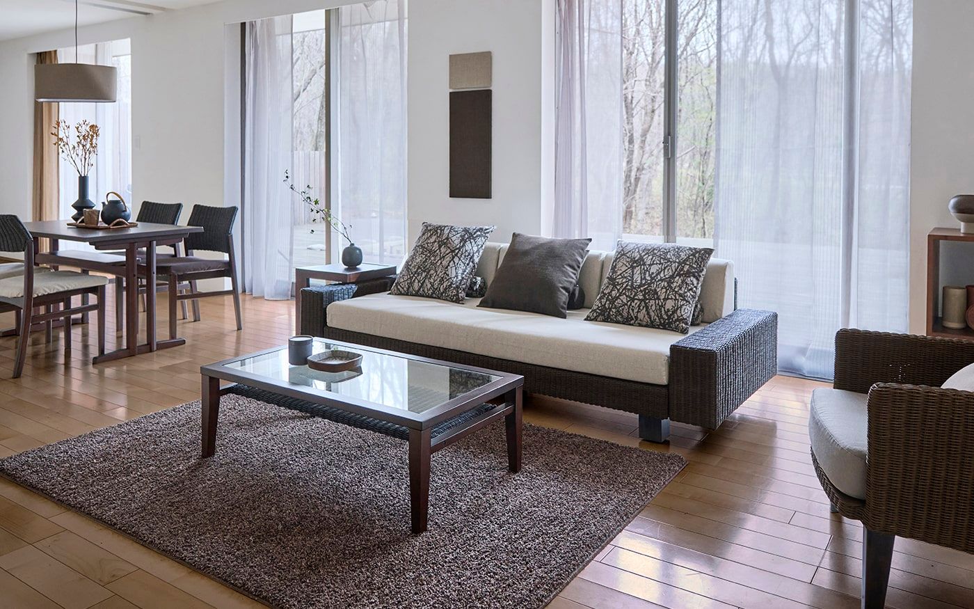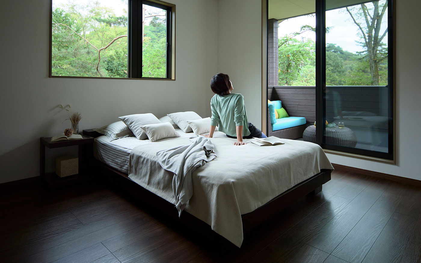軽井沢の美しい景色を借景に取り入れて、ローベッドとフットライトの優しい光で演出された寝室です。別荘での一日を過ごした後、穏やかな空間で心ゆくまで休息できるでしょう。自然のグリーンを活かして、室内はアイボリーのシンプルなカラーを採用。