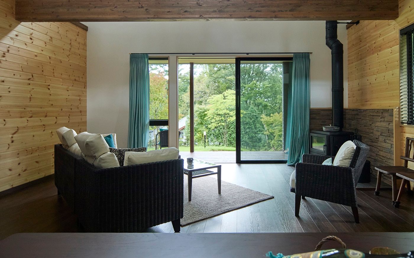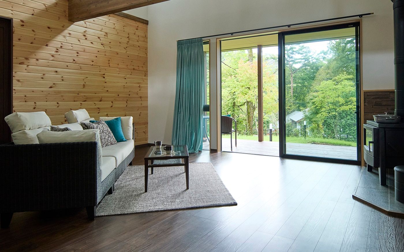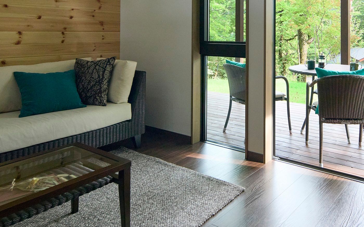 軽井沢の別荘にふさわしい、ウッド調の内装や建具、暖炉のダークカラーに映えるシックな家具でコーディネート。広い窓に映し出される、グリーンの自然と調和する色や柄のインテリアも取り入れて、借景との一体感を演出しました。