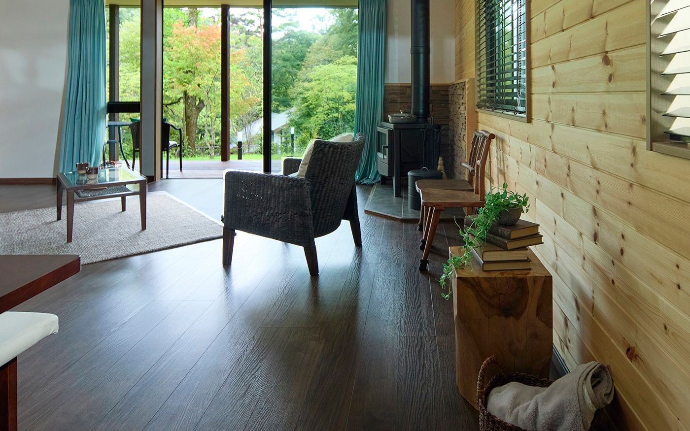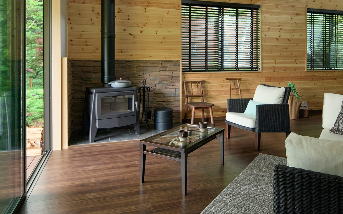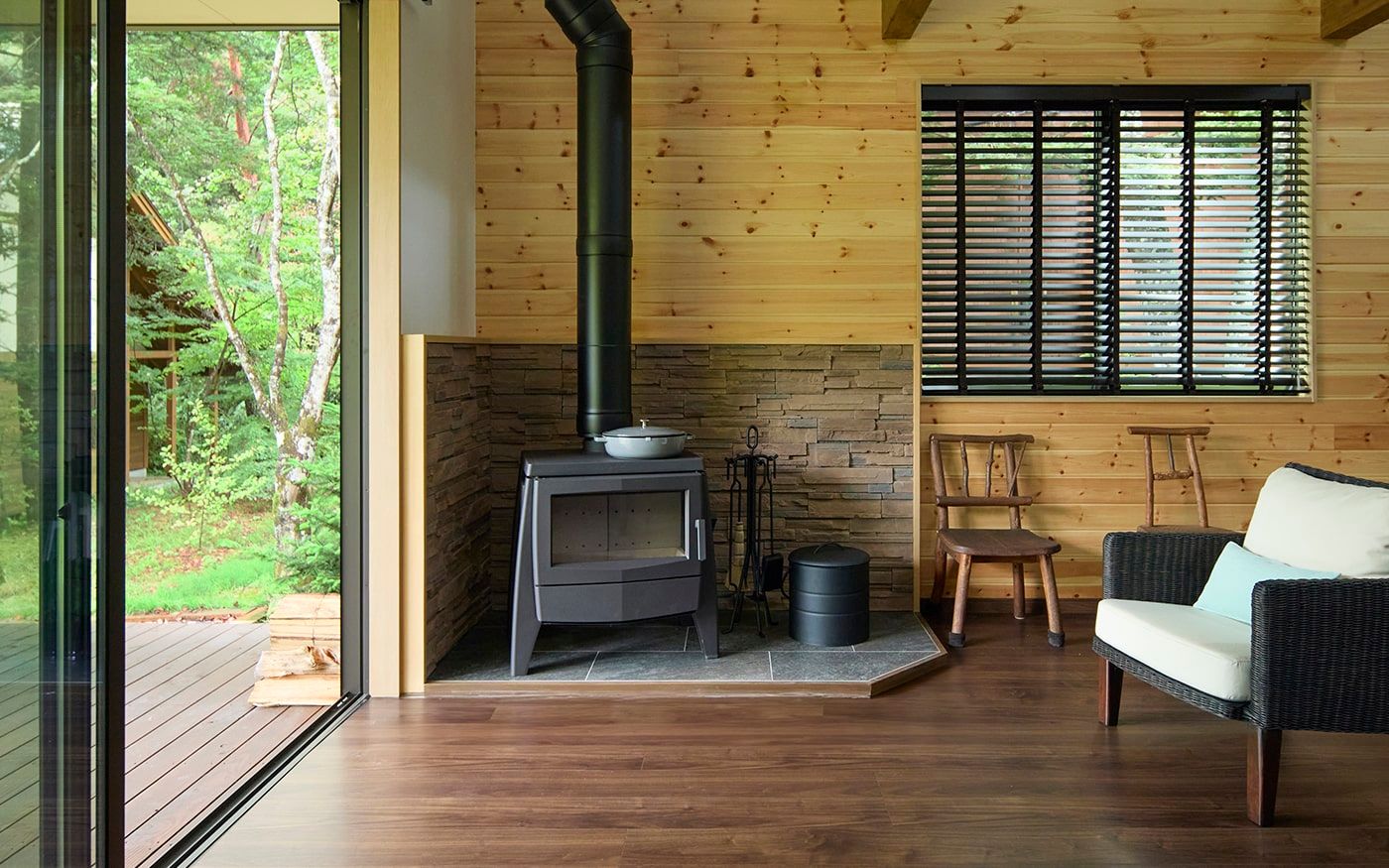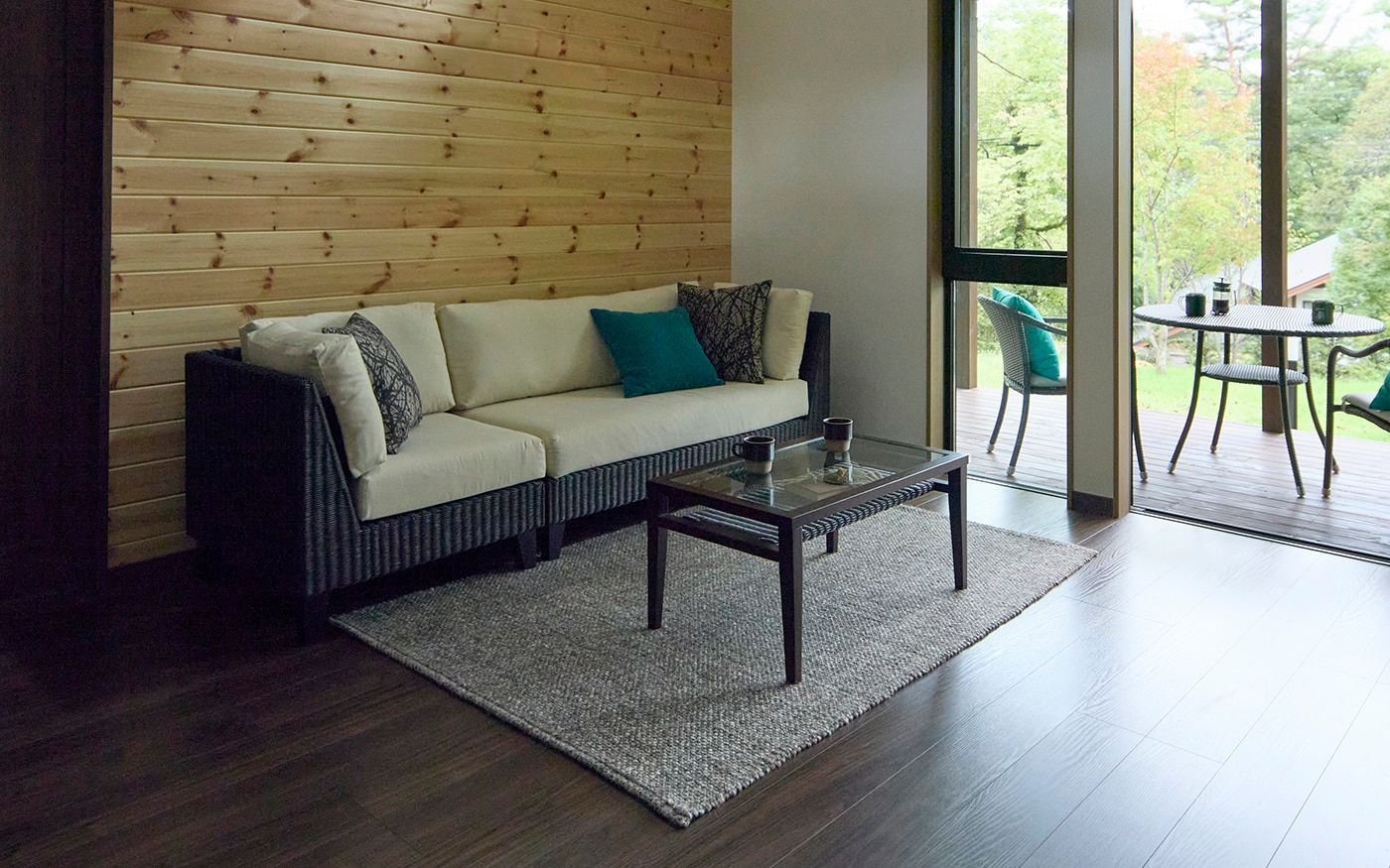 軽井沢の別荘にふさわしい、ウッド調の内装や建具、暖炉のダークカラーに映えるシックな家具でコーディネート。広い窓に映し出される、グリーンの自然と調和する色や柄のインテリアも取り入れて、借景との一体感を演出しました。