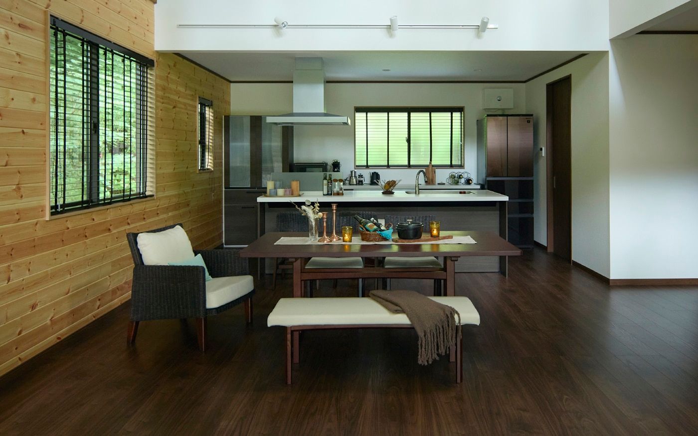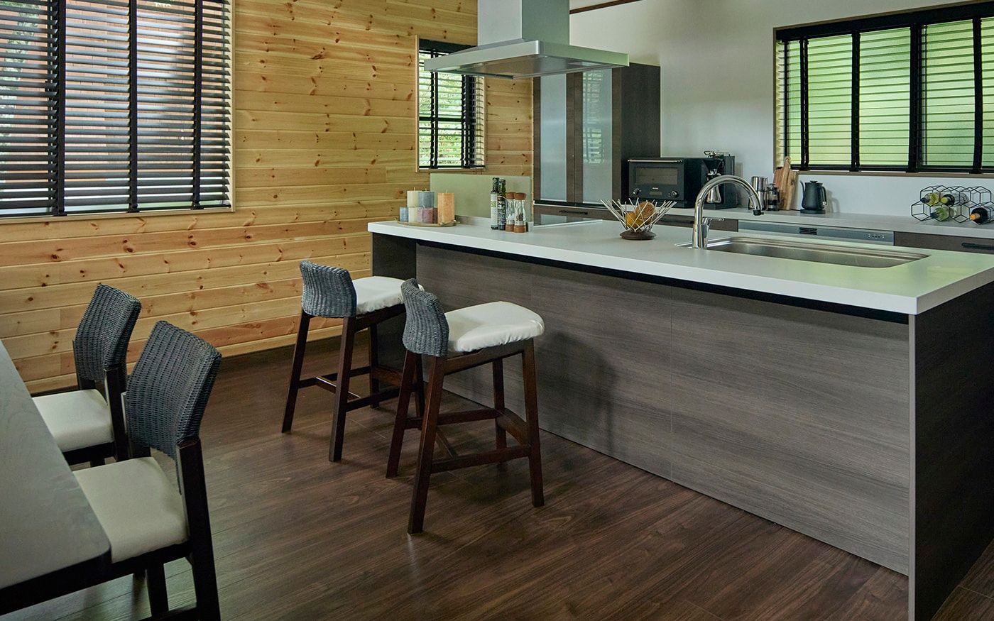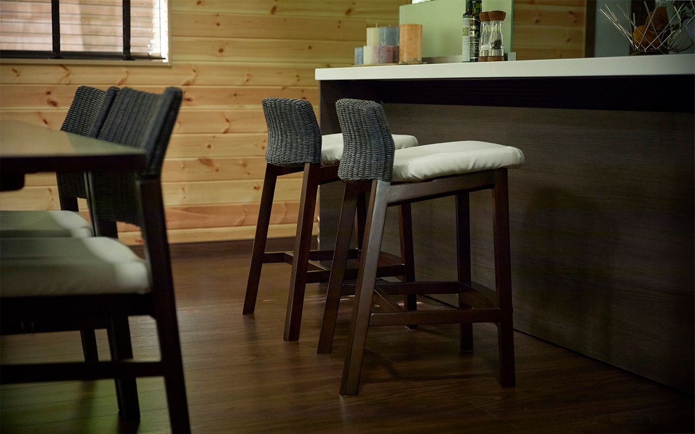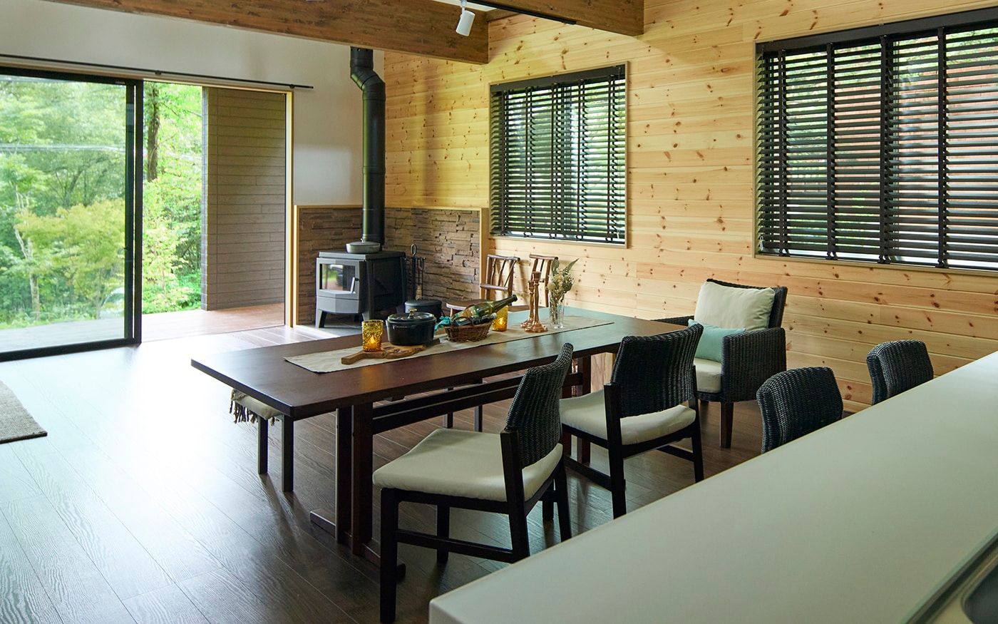別荘のダイニングで日常とは異なる寛ぎを楽しめるスペースを作るにはチェア選びが大事に。異なるダイニングチェアやラウンジチェア、ベンチ、カウンターチェアを配置し、自由なスタイルで寛ぎの別荘ライフを満喫できるでしょう。
