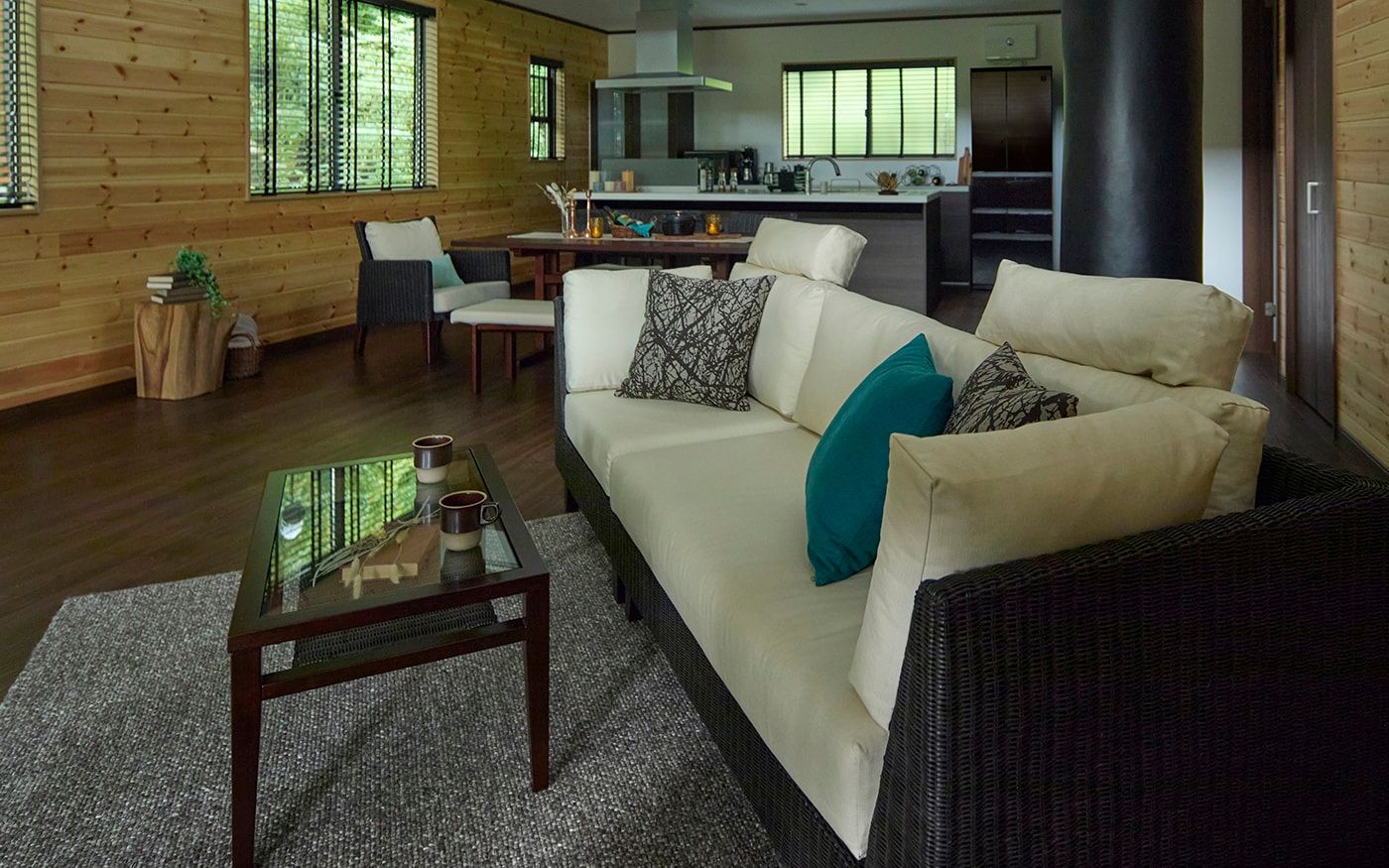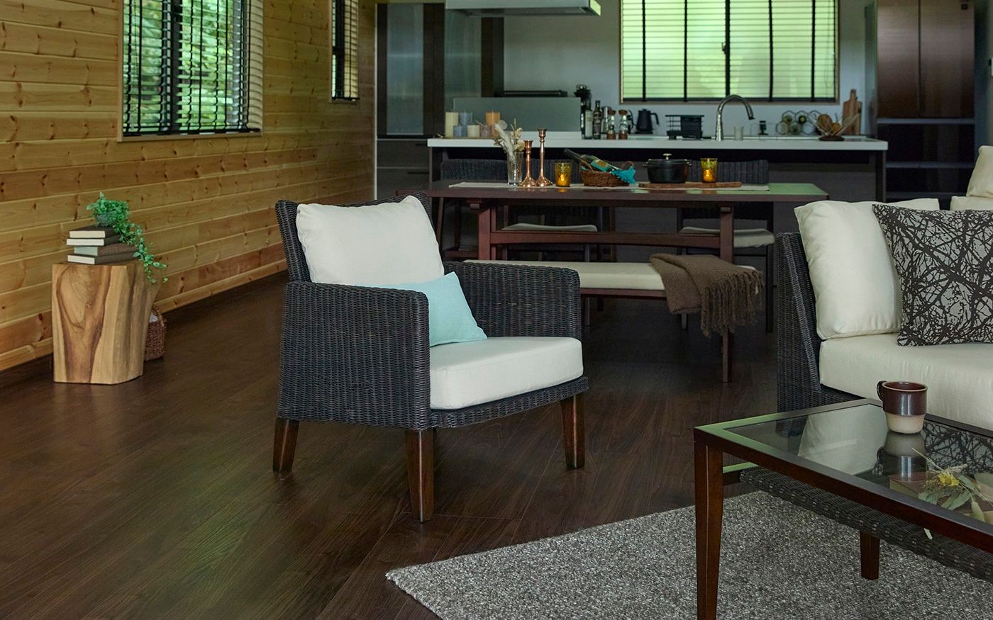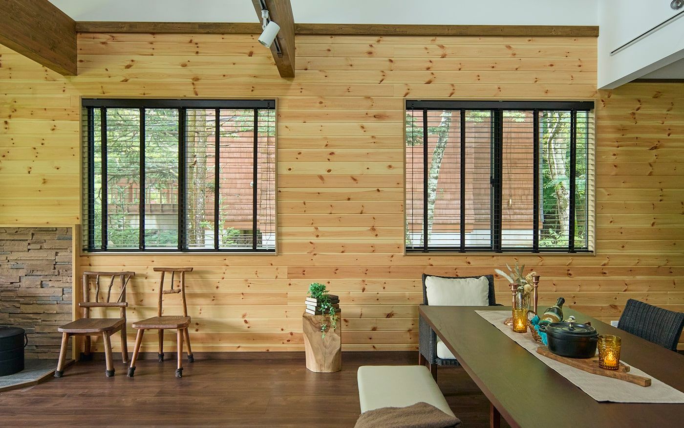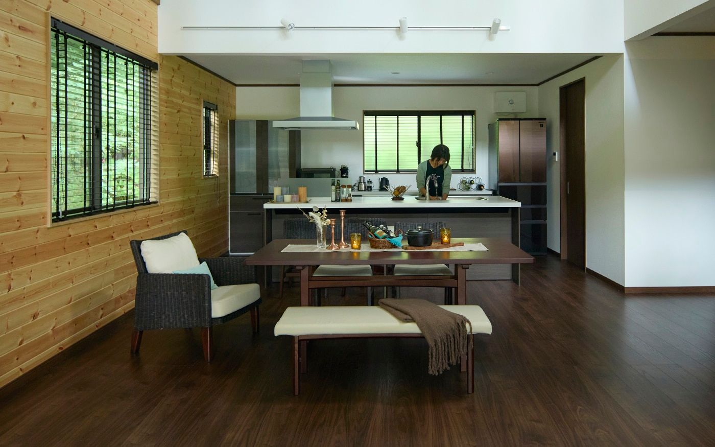 別荘のダイニングで日常とは異なる寛ぎを楽しめるスペースを作るにはチェア選びが大事に。異なるダイニングチェアやラウンジチェア、ベンチ、カウンターチェアを配置し、自由なスタイルで寛ぎの別荘ライフを満喫できるでしょう。