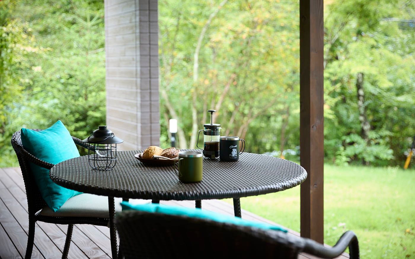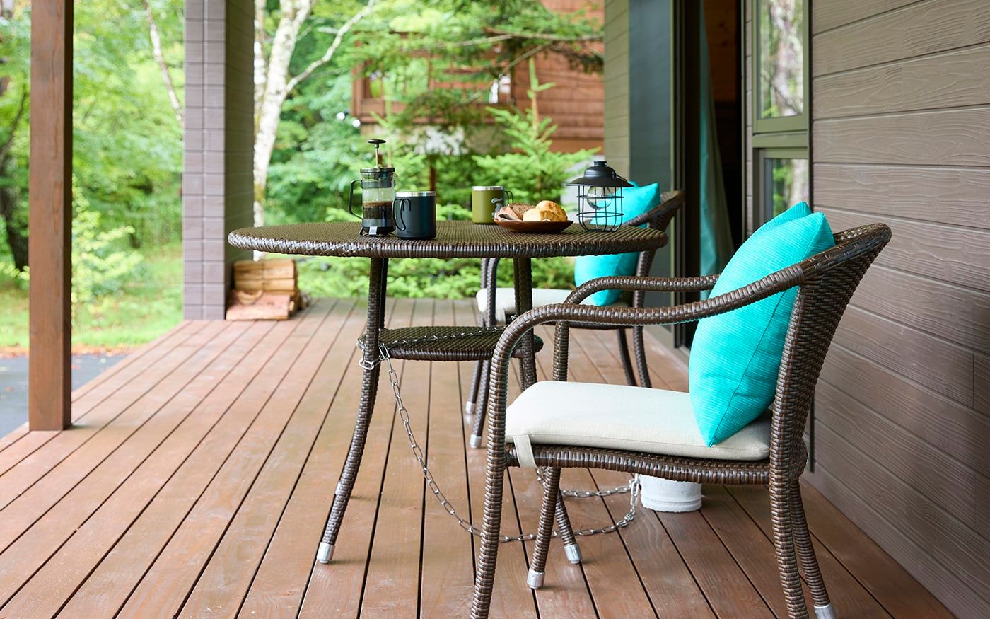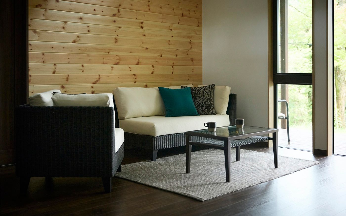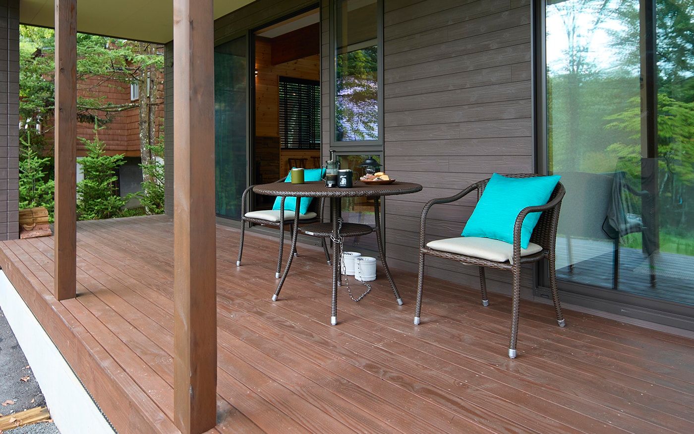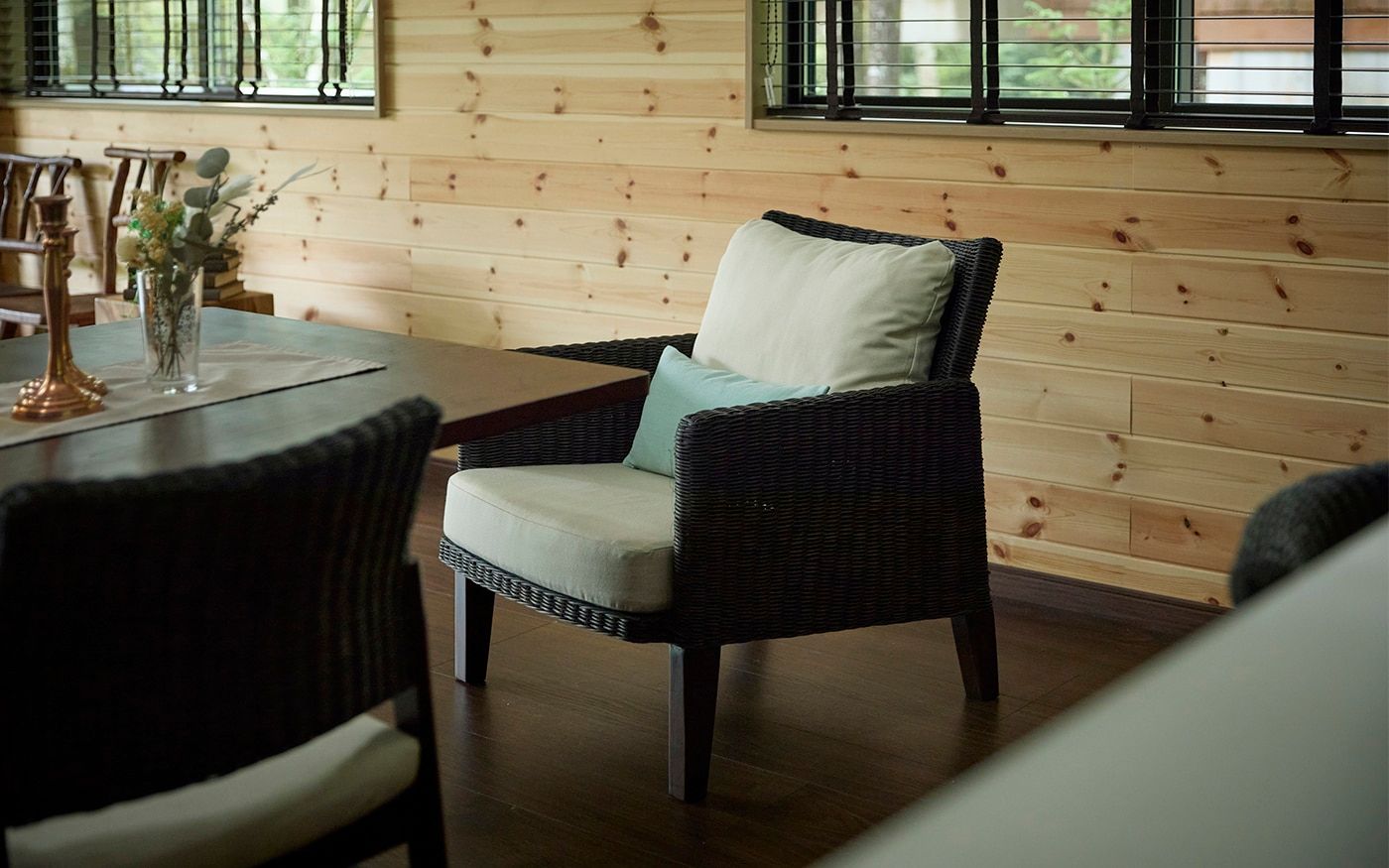 軽井沢の豊かな緑に溶け込むようなテラスを実現。洗練された編み込みデザインの屋外家具で、室内と一体感を持たせたテラス空間を演出しました。こだわりの別荘がまるでオープンカフェのような寛ぎの場に様変わりしています。
