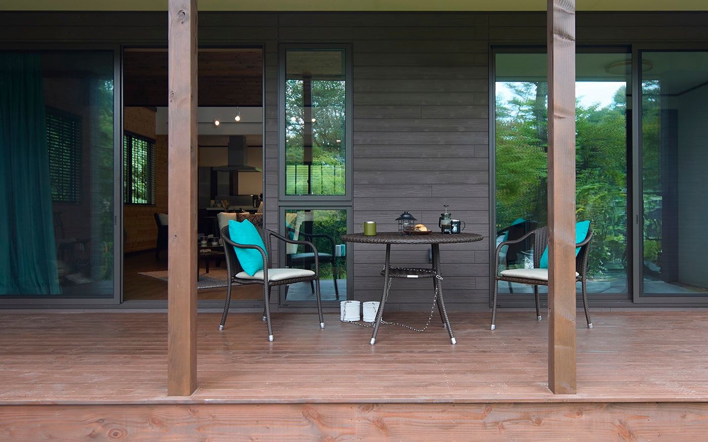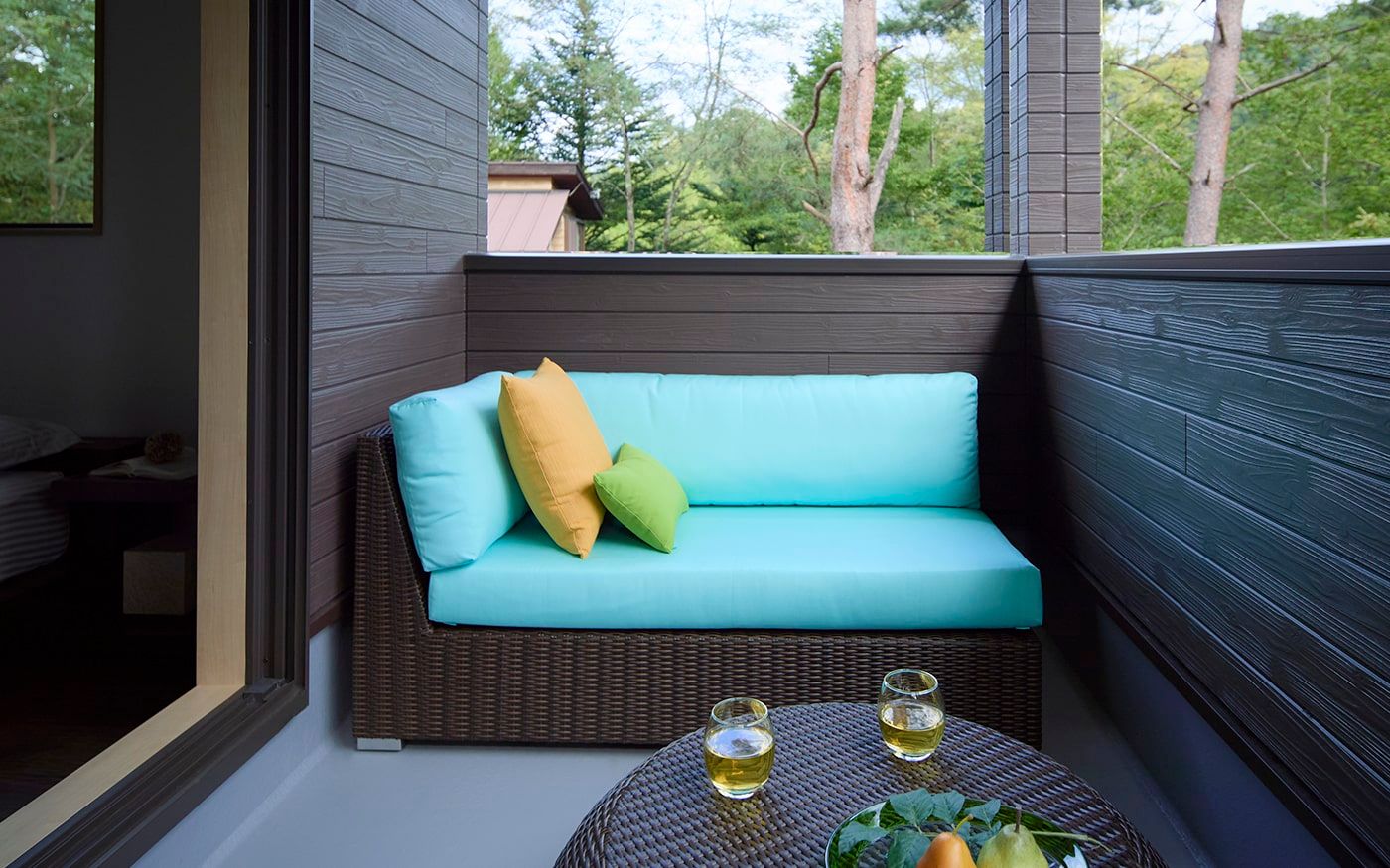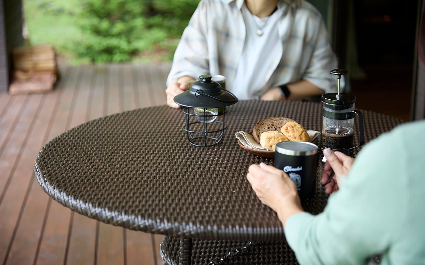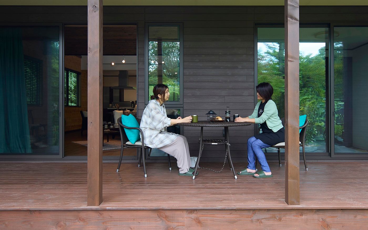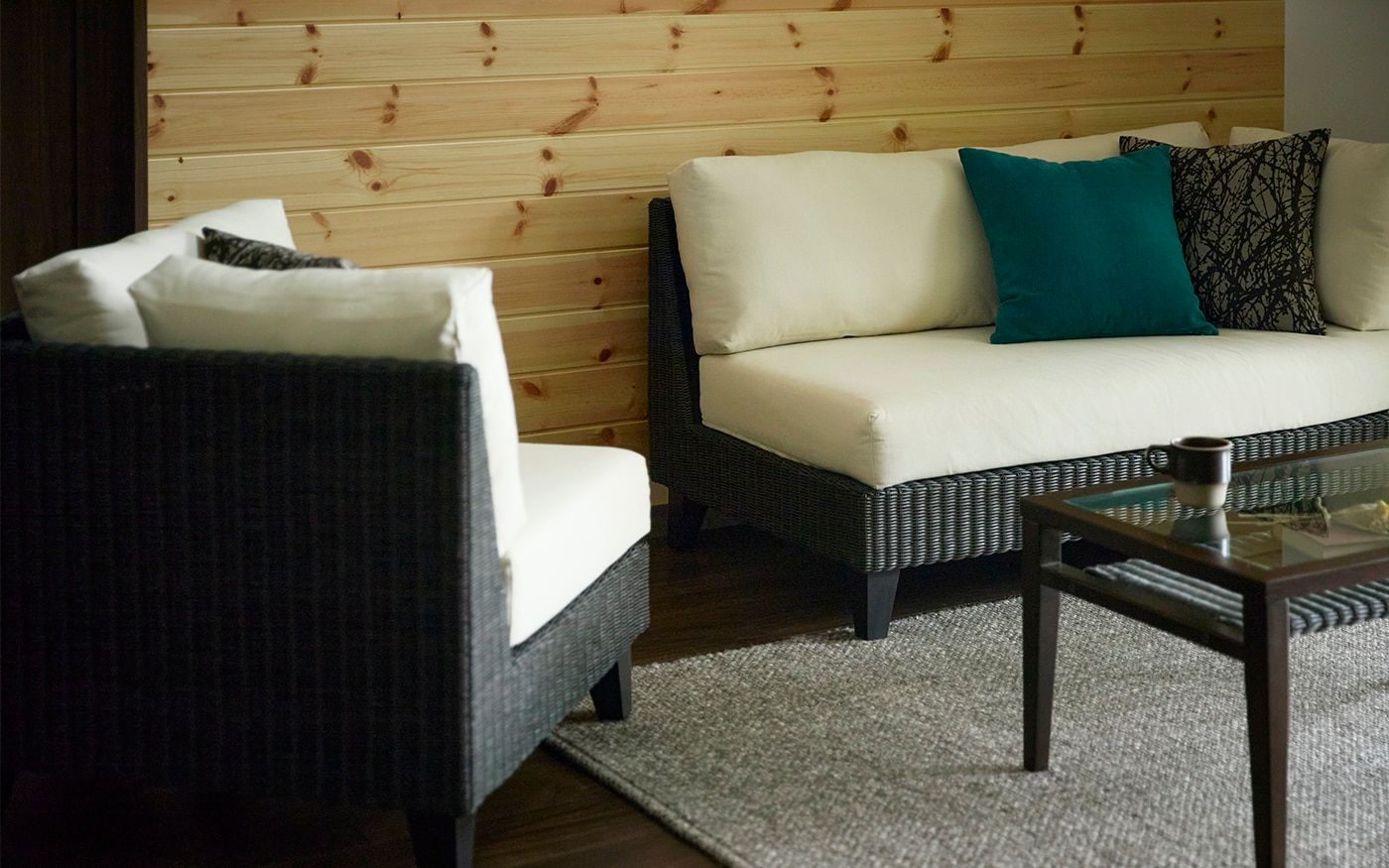 軽井沢の豊かな緑に溶け込むようなテラスを実現。洗練された編み込みデザインの屋外家具で、室内と一体感を持たせたテラス空間を演出しました。こだわりの別荘がまるでオープンカフェのような寛ぎの場に様変わりしています。