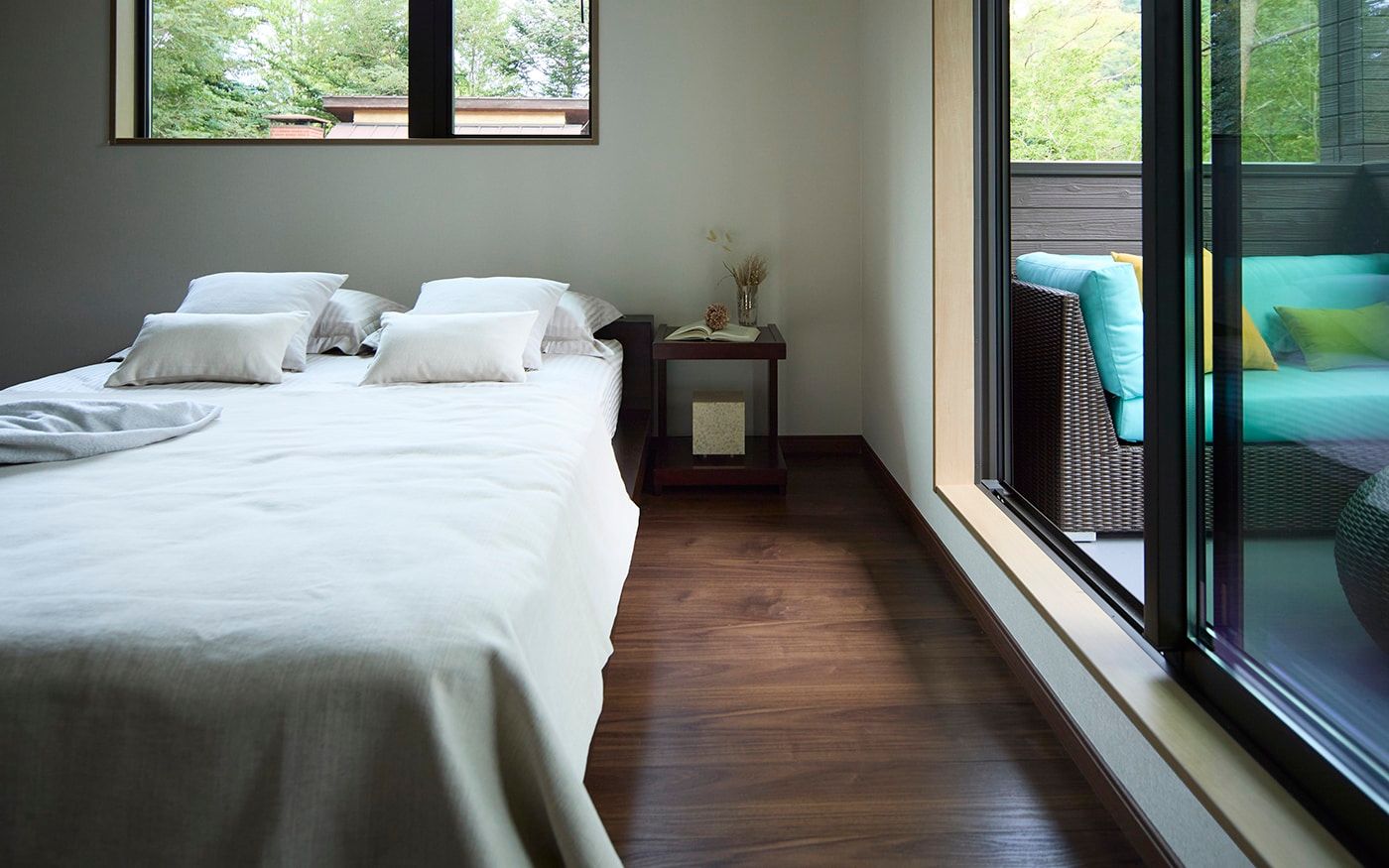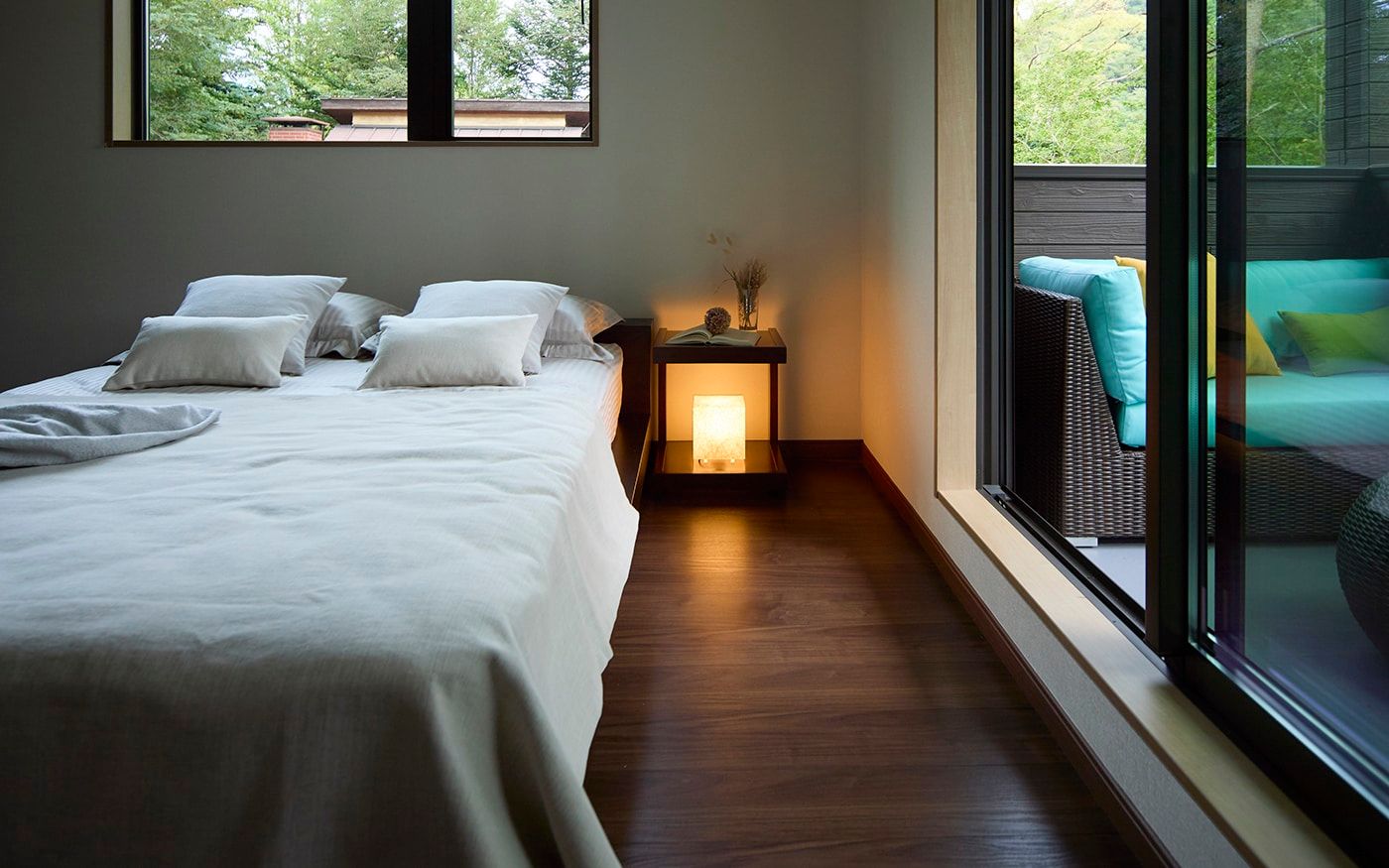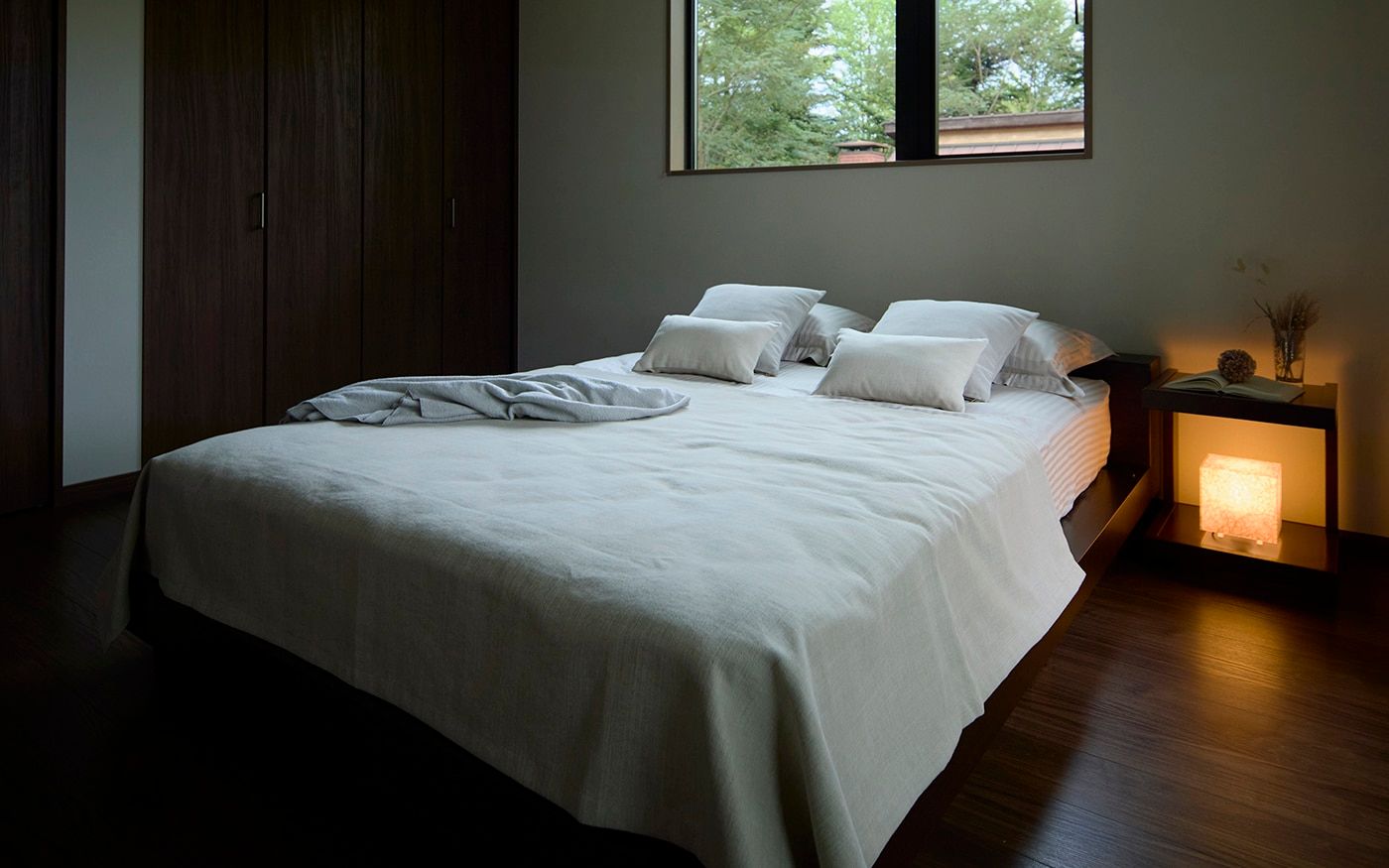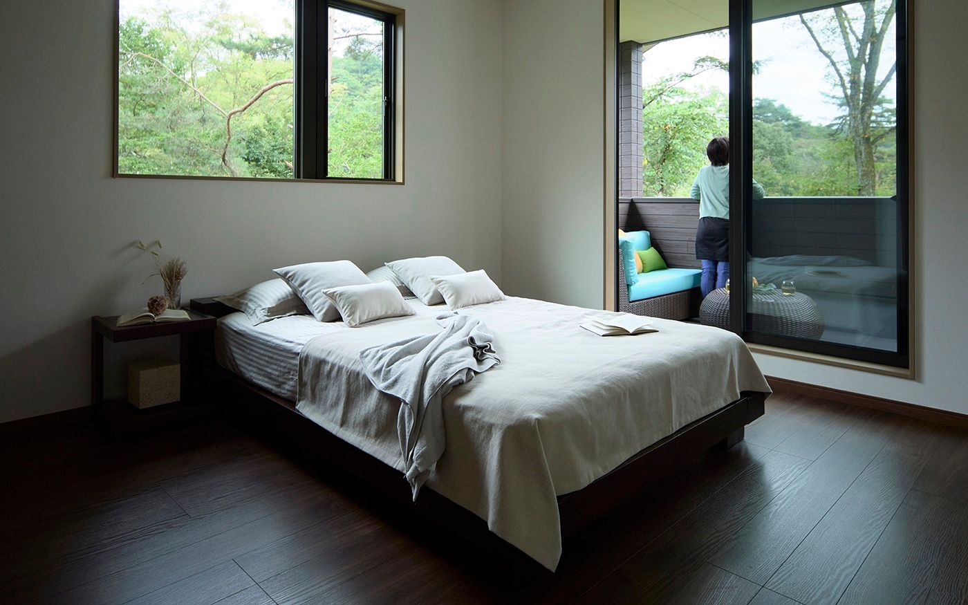 軽井沢の美しい景色を借景に取り入れて、ローベッドとフットライトの優しい光で演出された寝室です。別荘での一日を過ごした後、穏やかな空間で心ゆくまで休息できるでしょう。自然のグリーンを活かして、室内はアイボリーのシンプルなカラーを採用。