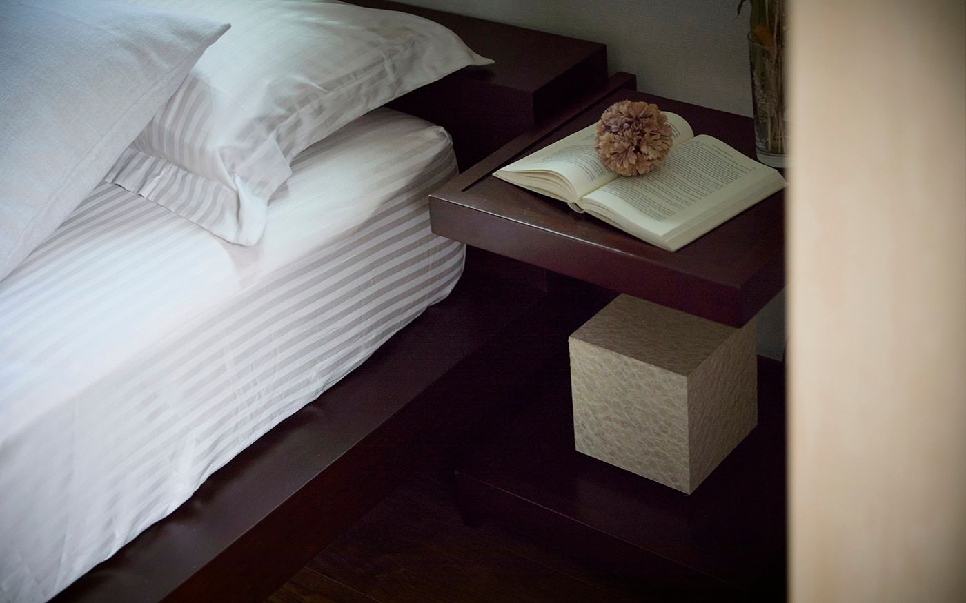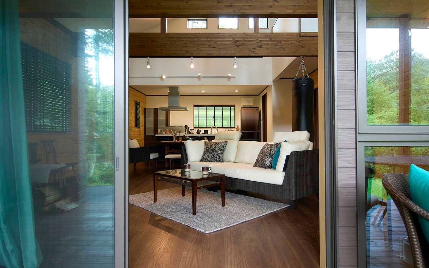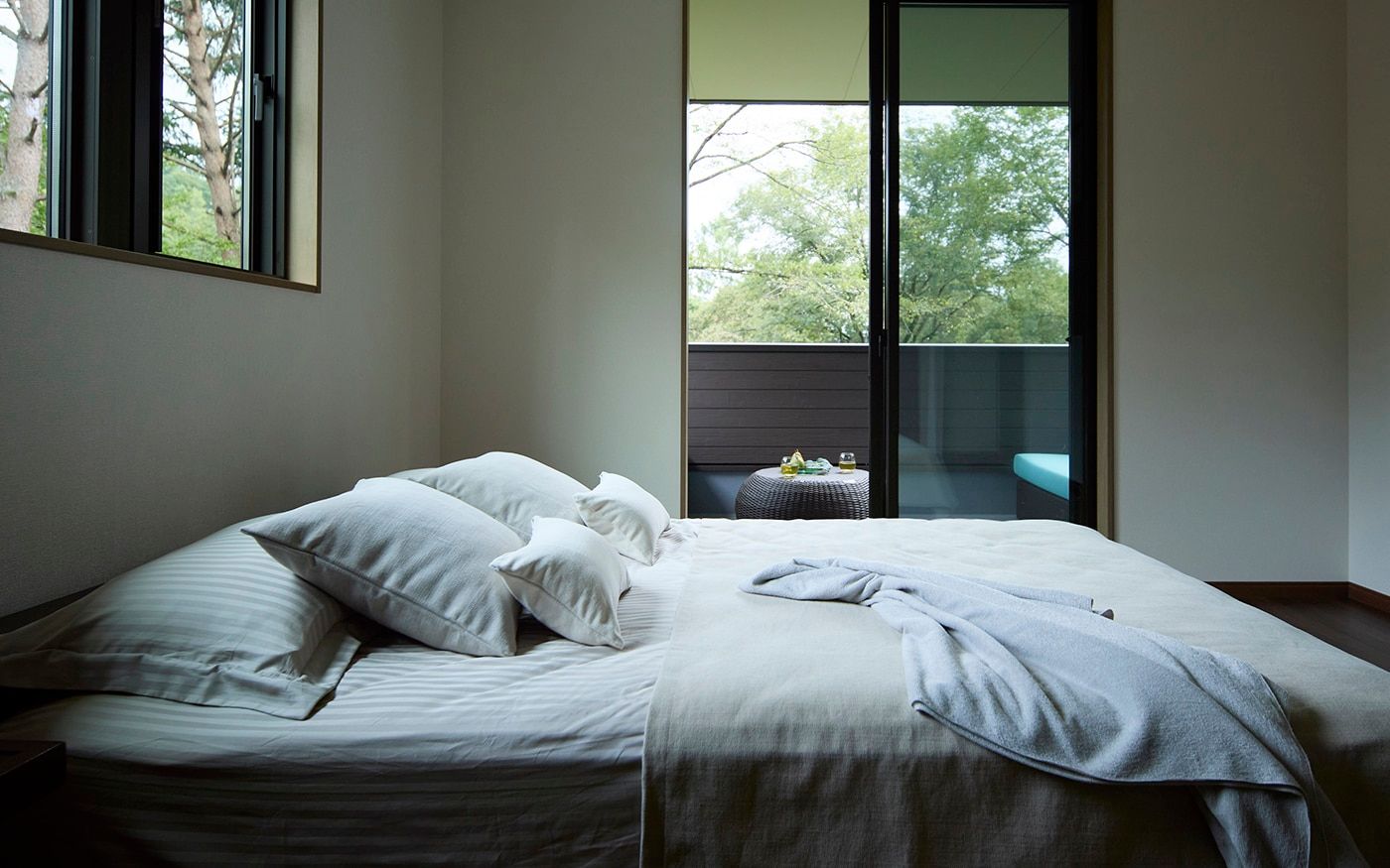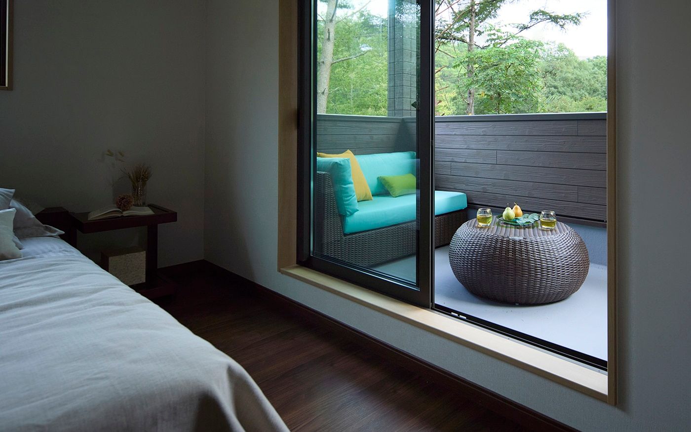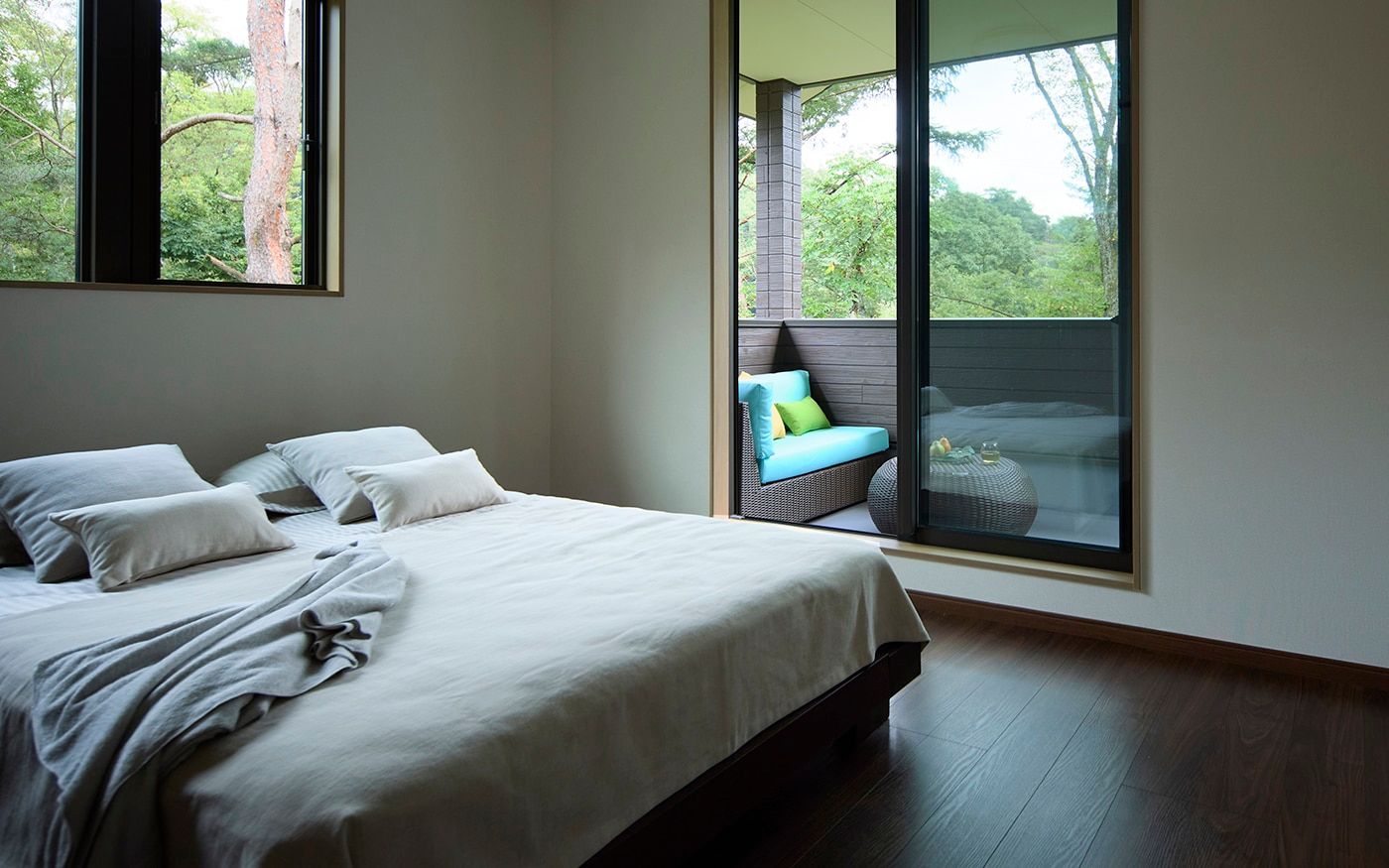 軽井沢の美しい景色を借景に取り入れて、ローベッドとフットライトの優しい光で演出された寝室です。別荘での一日を過ごした後、穏やかな空間で心ゆくまで休息できるでしょう。自然のグリーンを活かして、室内はアイボリーのシンプルなカラーを採用。