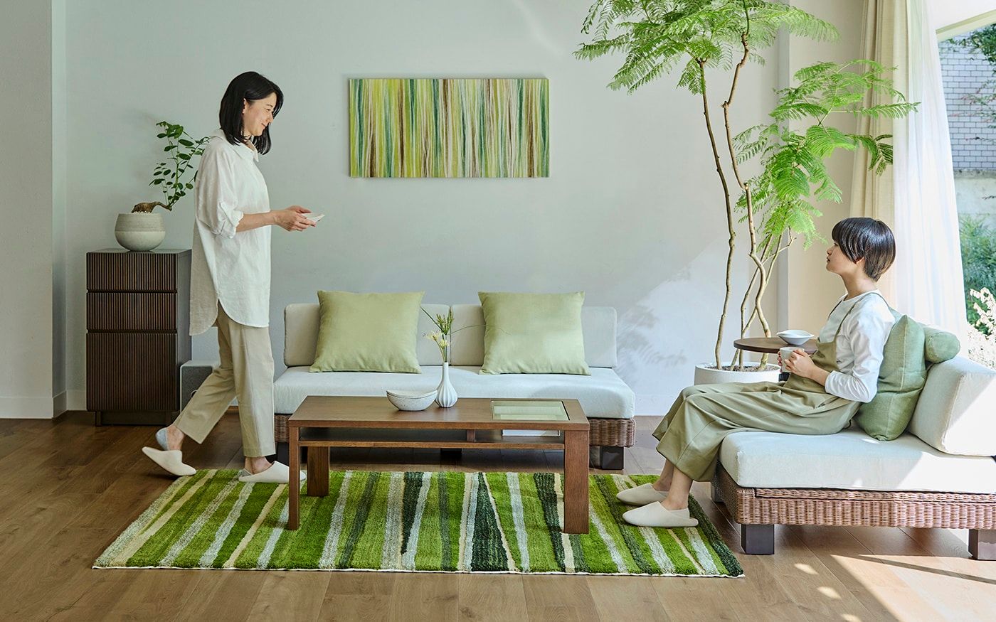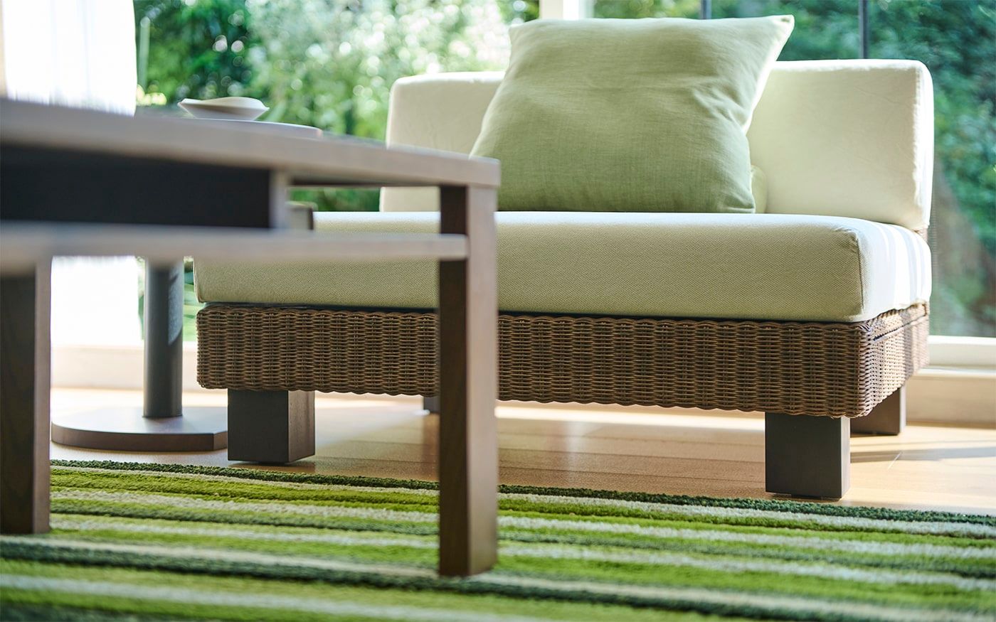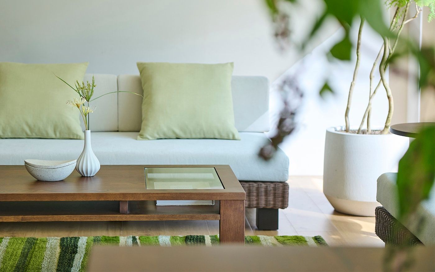 ブラウンラタンのローソファに映えるCLバジルやCLグローブのクッションを合わせて、安らぎ感のあるリビングに。多彩なグリーンを取り入れたストライプのラグと、アートパネルが織りなす自然のハーモニーが、お部屋に穏やかな息吹をもたらしています。