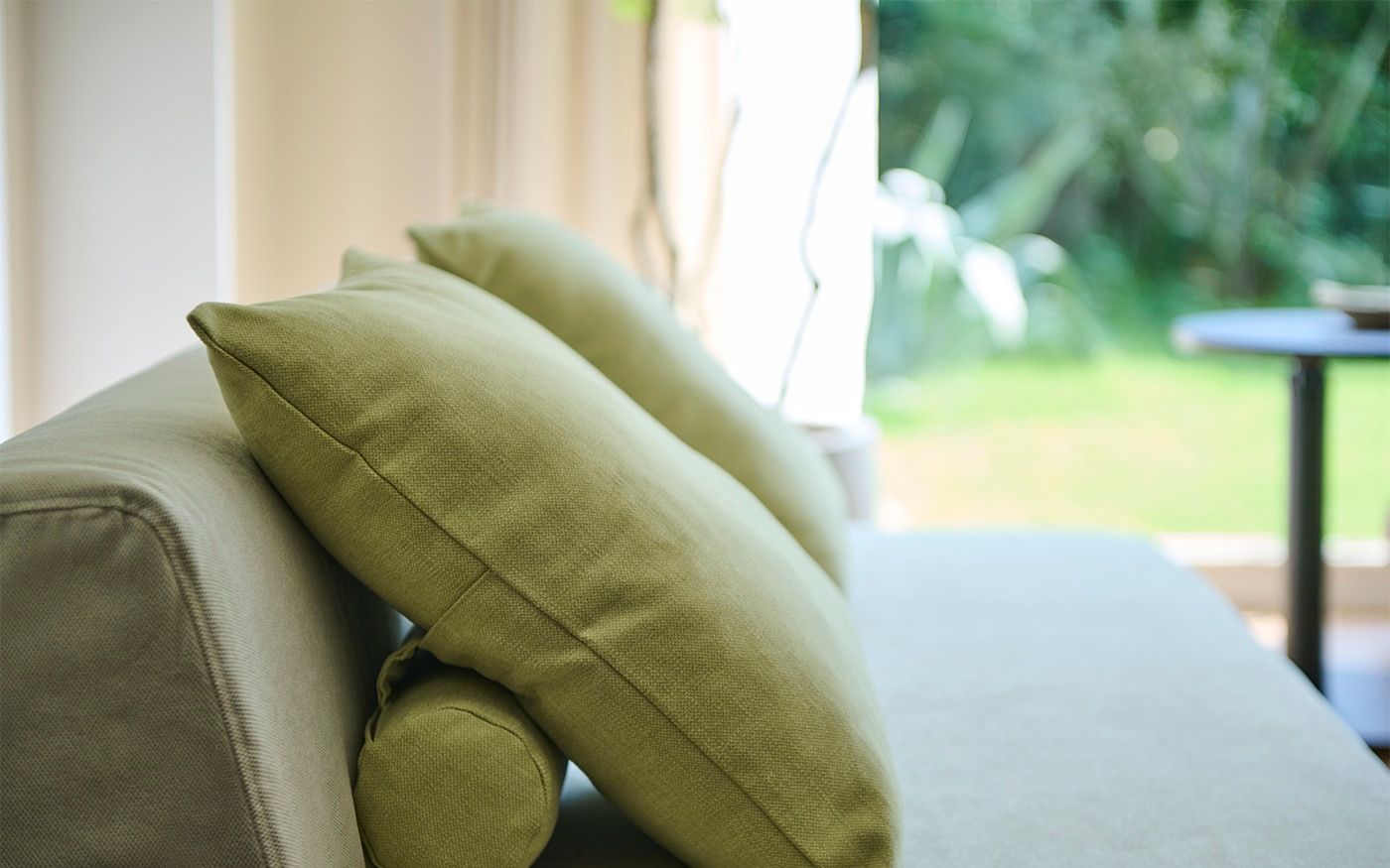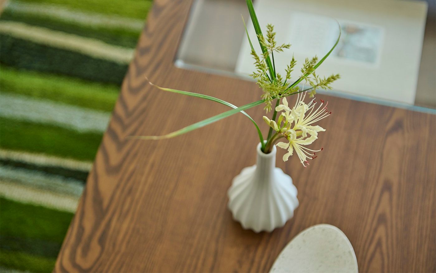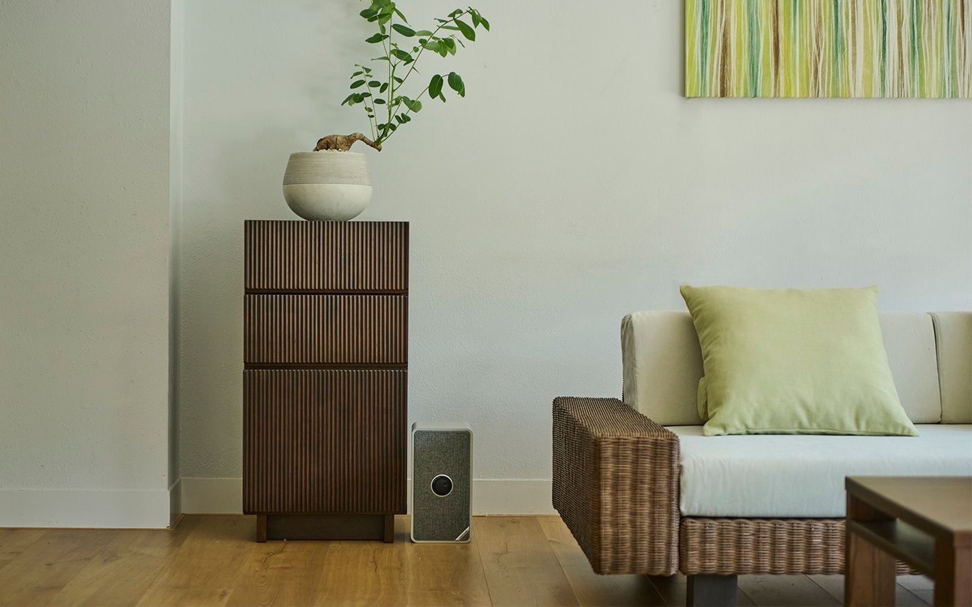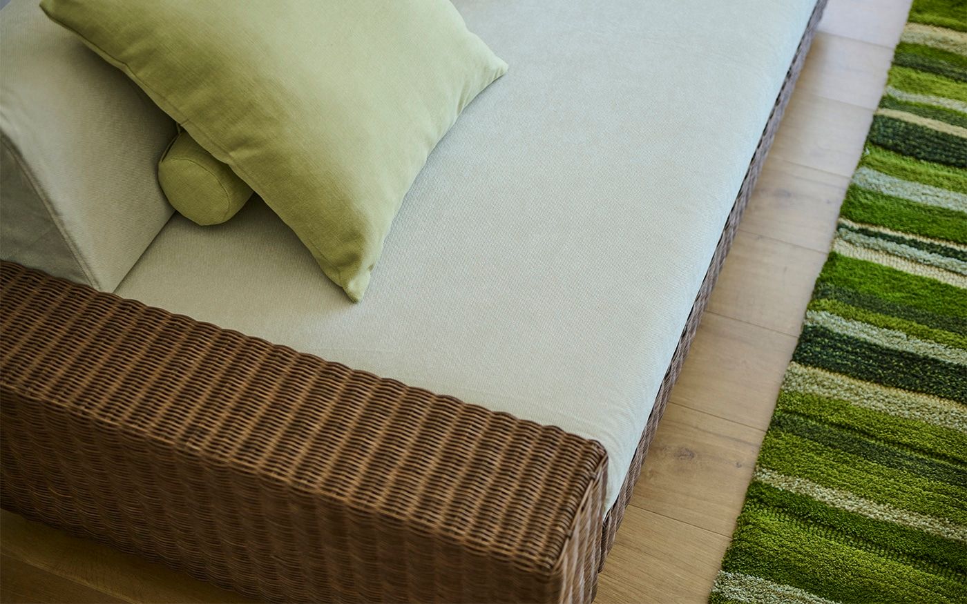 ブラウンラタンのローソファに映えるCLバジルやCLグローブのクッションを合わせて、安らぎ感のあるリビングに。多彩なグリーンを取り入れたストライプのラグと、アートパネルが織りなす自然のハーモニーが、お部屋に穏やかな息吹をもたらしています。