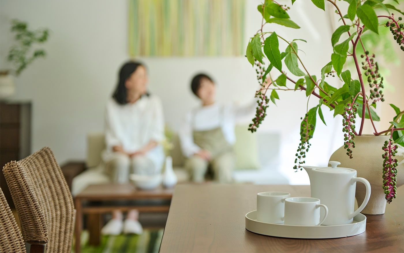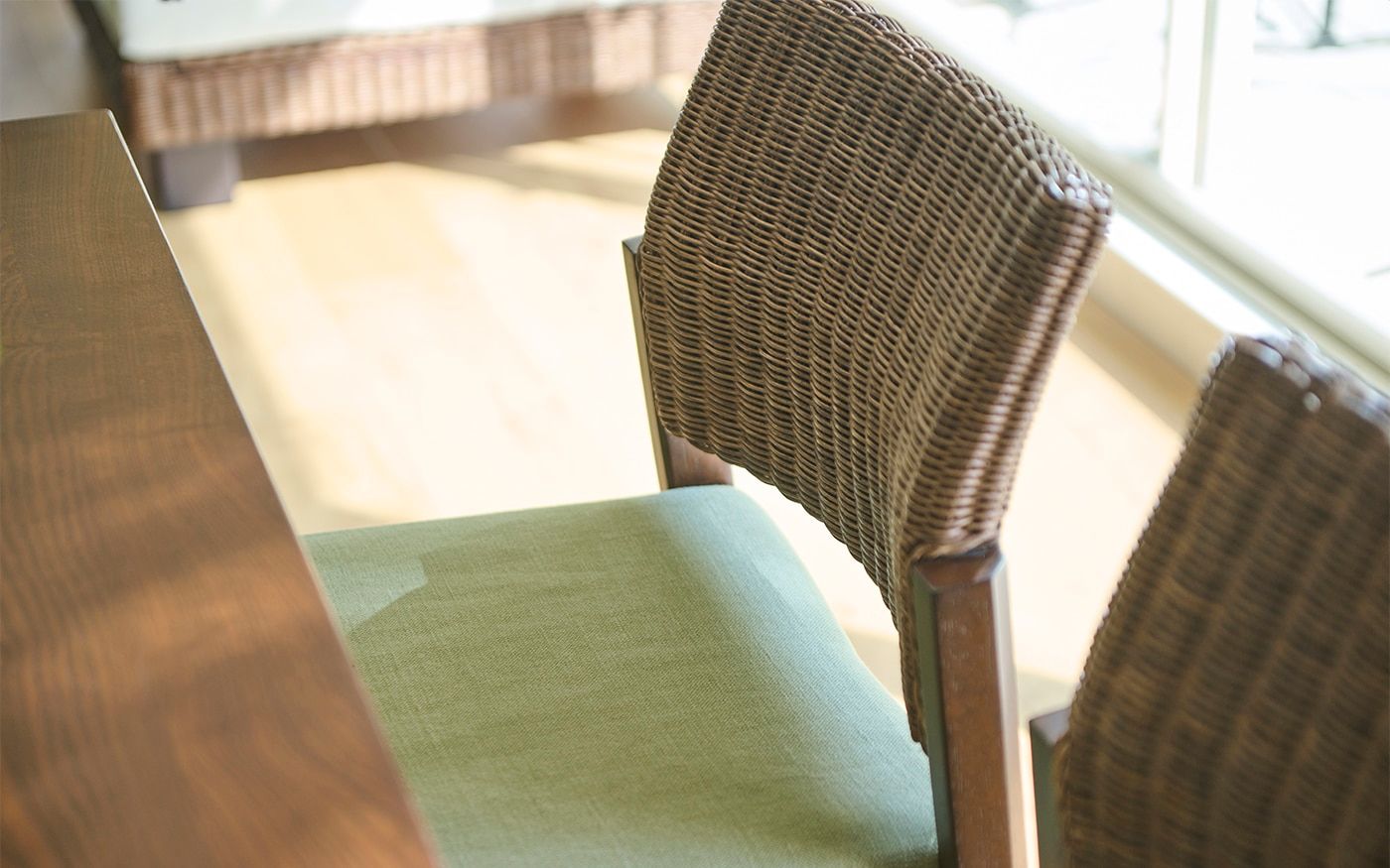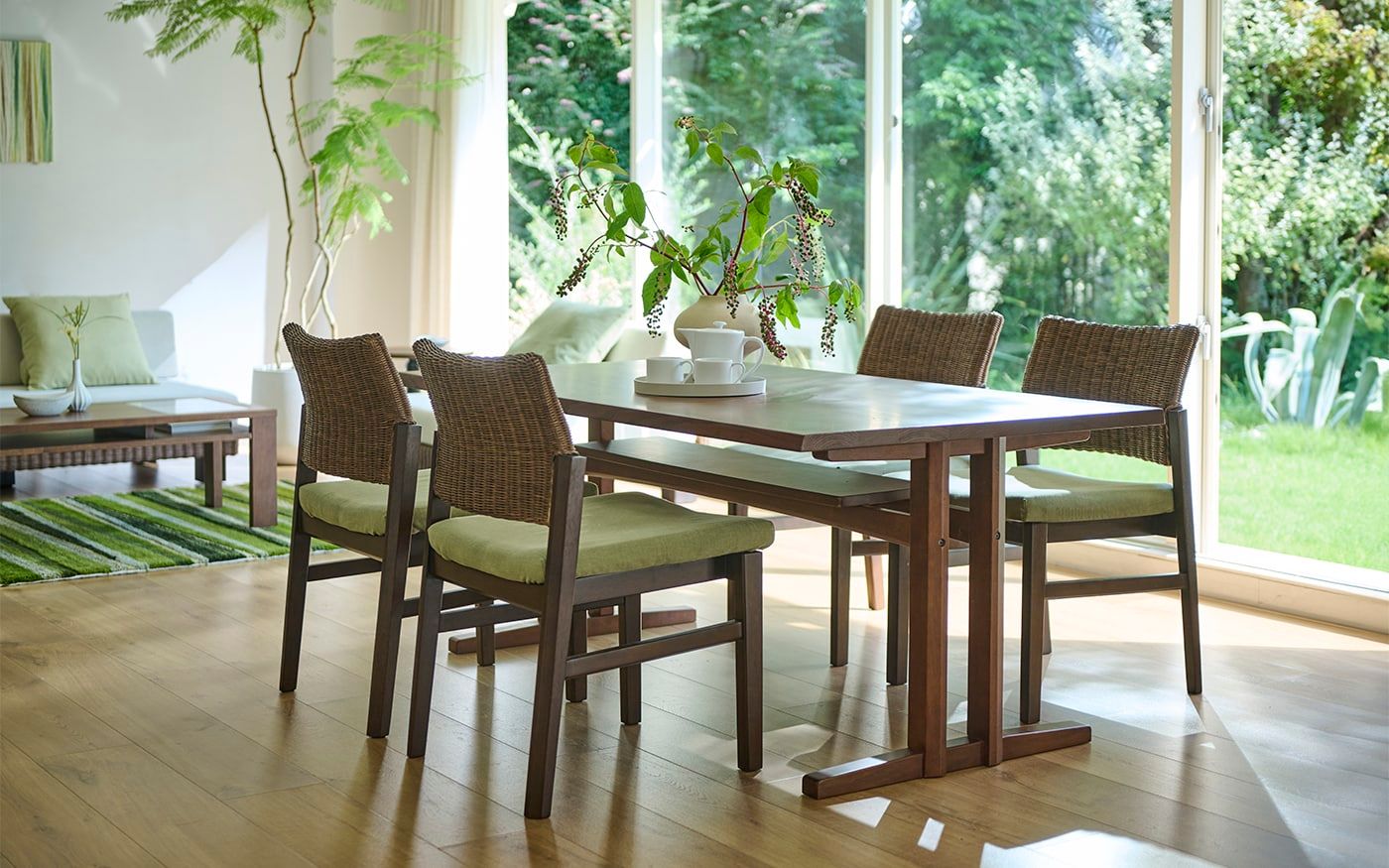 リビングと同じ素材のブラウンラタンチェアを採用したダイニング。無垢材のローダイニングテーブルには、バジルグリーンのチェアカバーを取り入れて、ソファとの統一感あるカラーコーディネートに仕上げています。リラックスしやすい食卓で心地よい食事の時間を楽しんでみましょう。