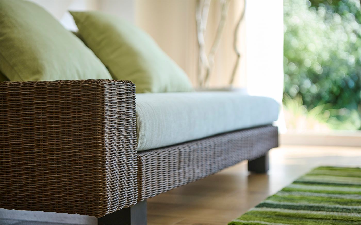 繊細なブラウンのラタンソファは、美しく編み込まれたその姿が魅力です。落ち着いたグリーンのインテリアと相性が良く、空間に温もりと洗練された雰囲気をもたらします。熟練した職人による丁寧な手作業だからこそ作れるローソファです。