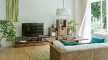 自然感のあるヒヤシンス素材の家具は、ペールトーンのバジルグリーンやリーフグリーンのクッションと相性抜群です。ナチュラルな雰囲気のリビングに仕上げるために、ラグやカーテンは優しいベージュを選び、統一感のある空間を演出しました。