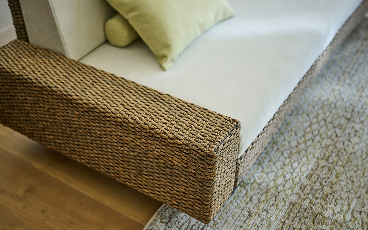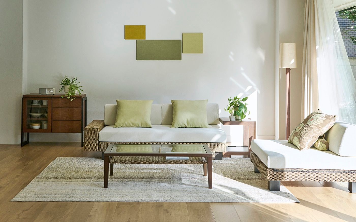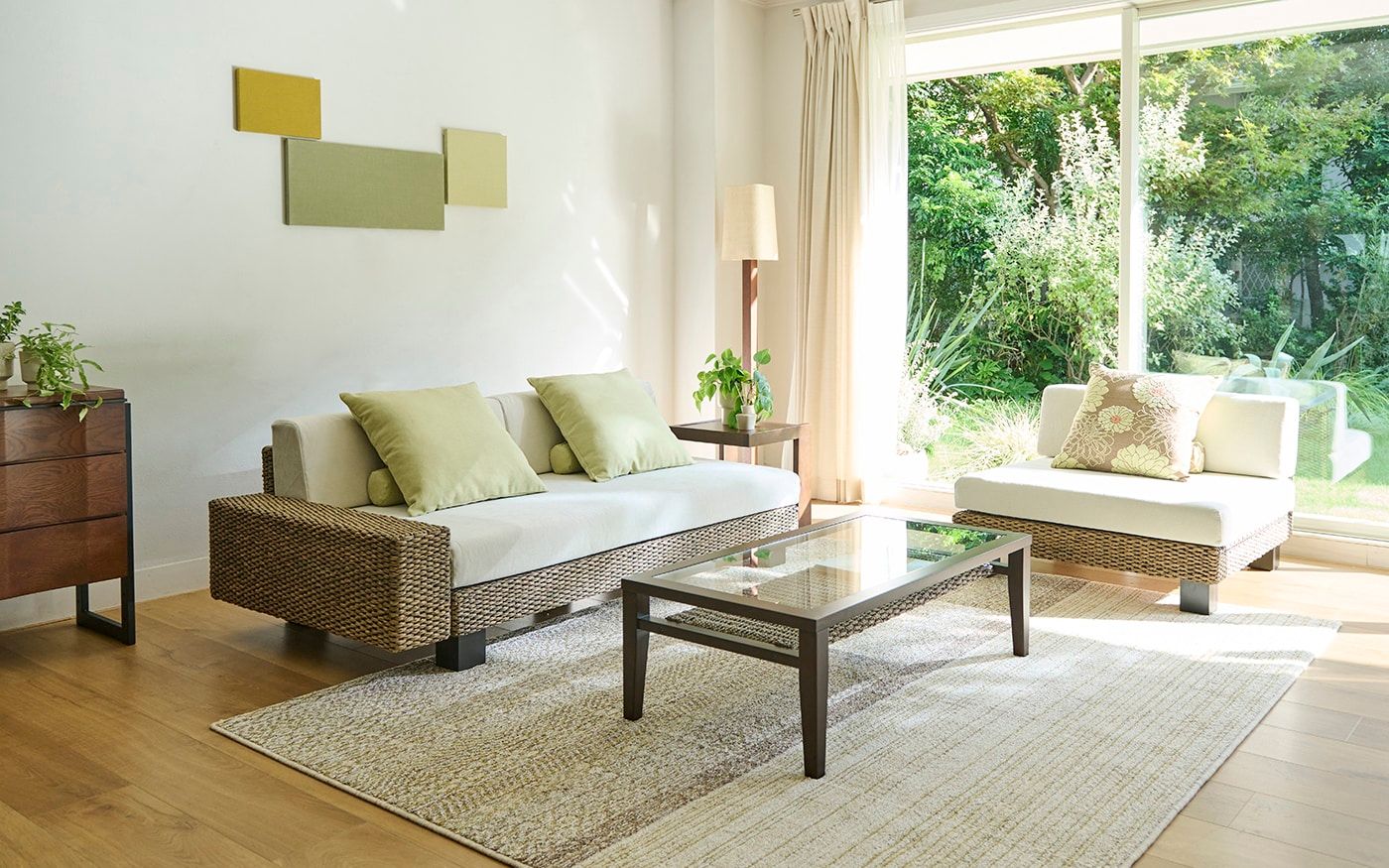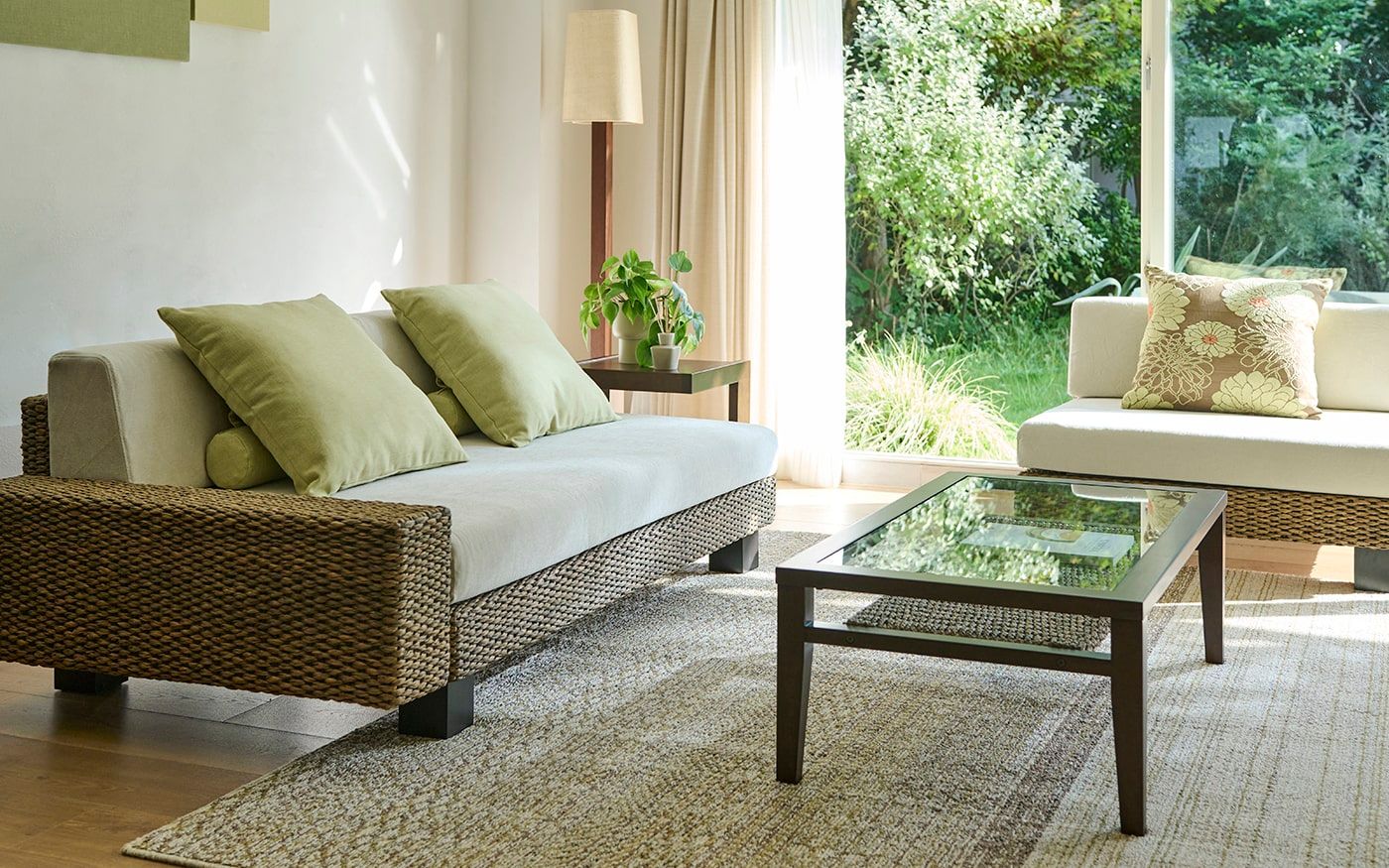 自然感のあるヒヤシンス素材の家具は、ペールトーンのバジルグリーンやリーフグリーンのクッションと相性抜群です。ナチュラルな雰囲気のリビングに仕上げるために、ラグやカーテンは優しいベージュを選び、統一感のある空間を演出しました。