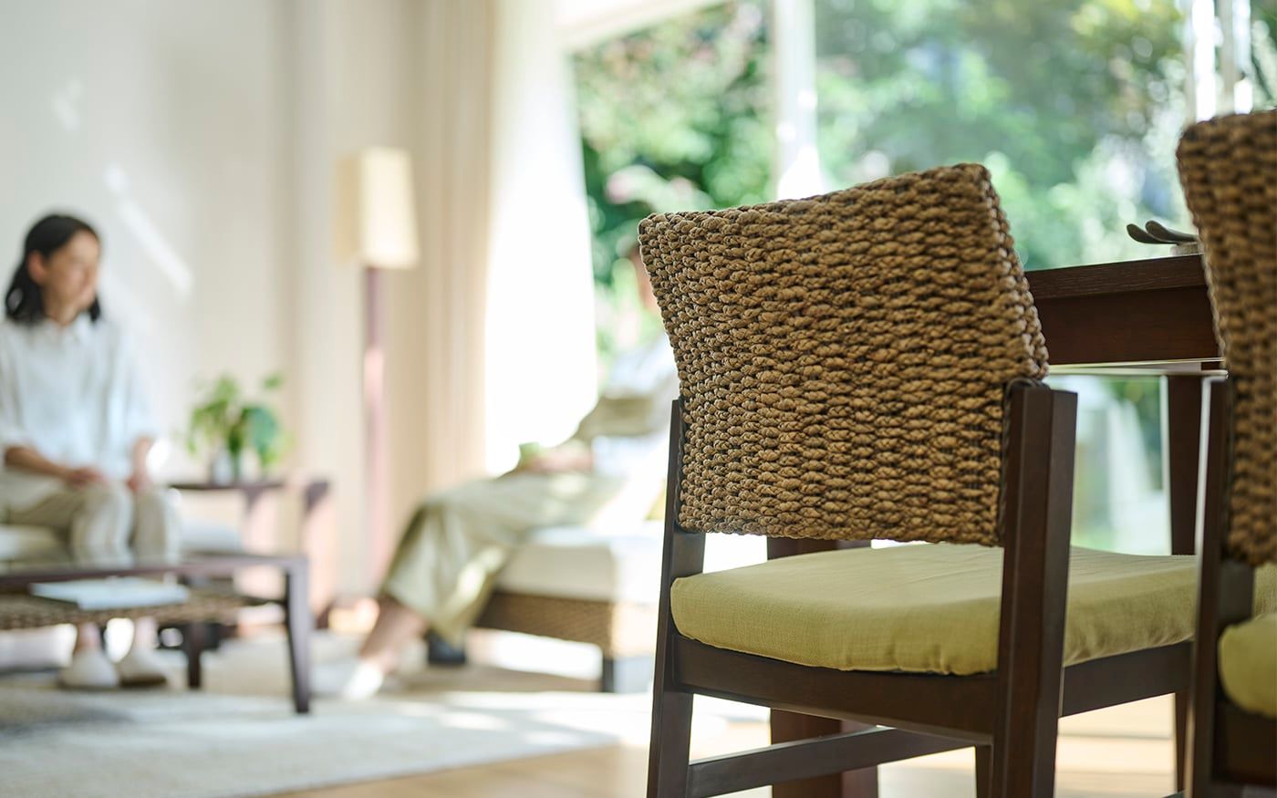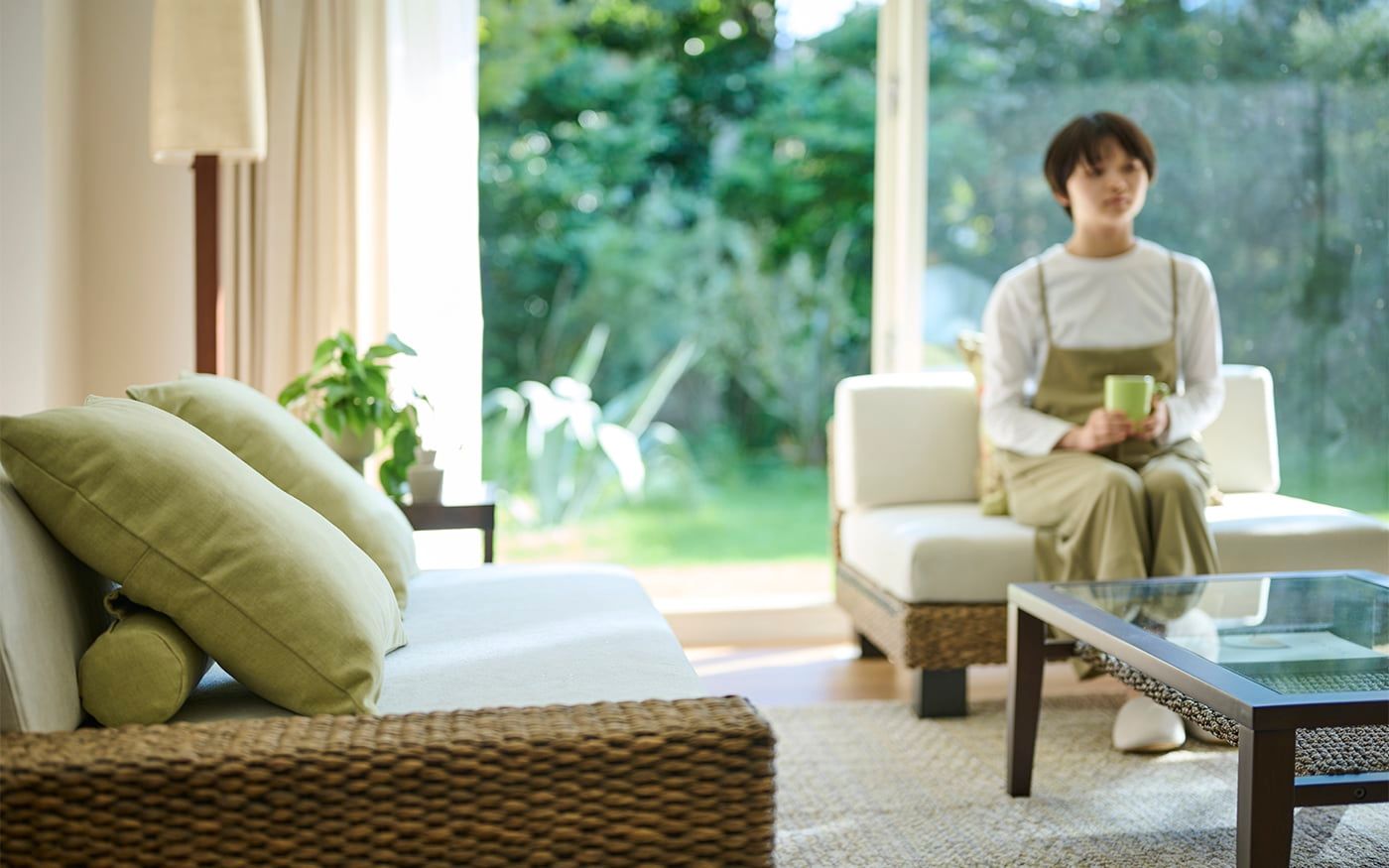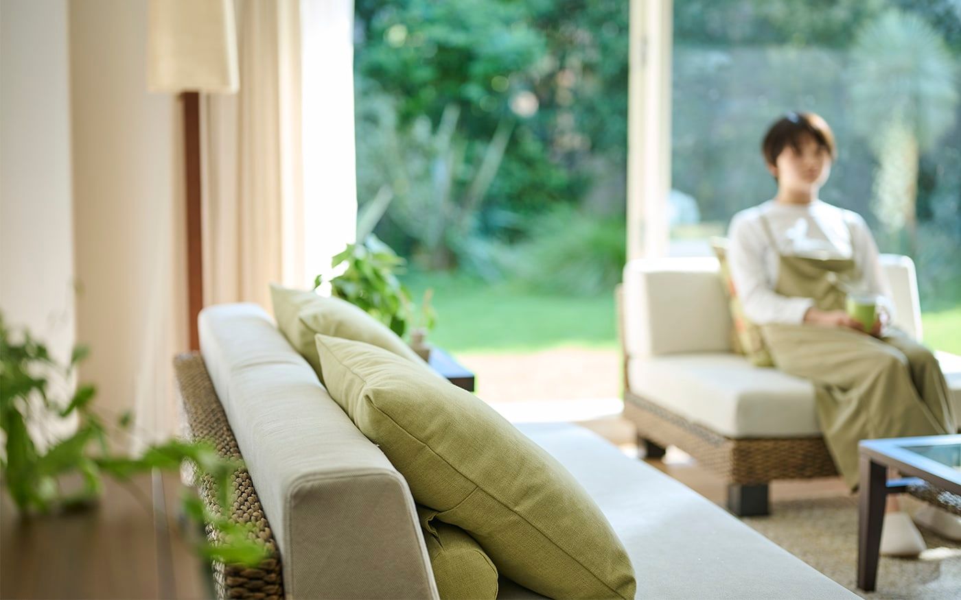 自然感のあるヒヤシンス素材の家具は、ペールトーンのバジルグリーンやリーフグリーンのクッションと相性抜群です。ナチュラルな雰囲気のリビングに仕上げるために、ラグやカーテンは優しいベージュを選び、統一感のある空間を演出しました。
