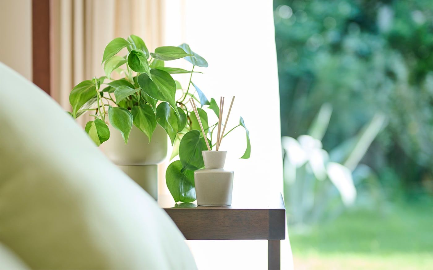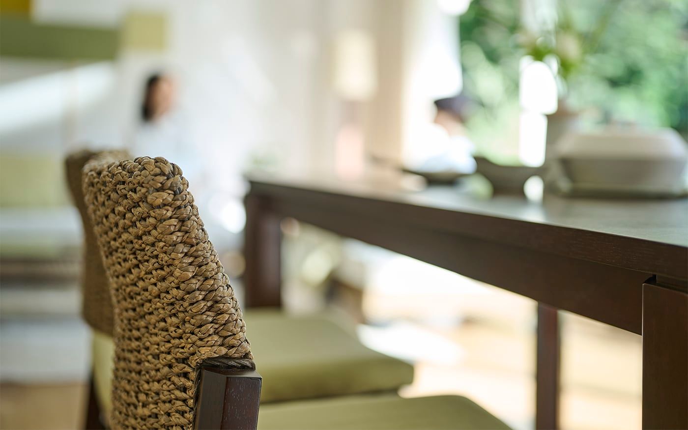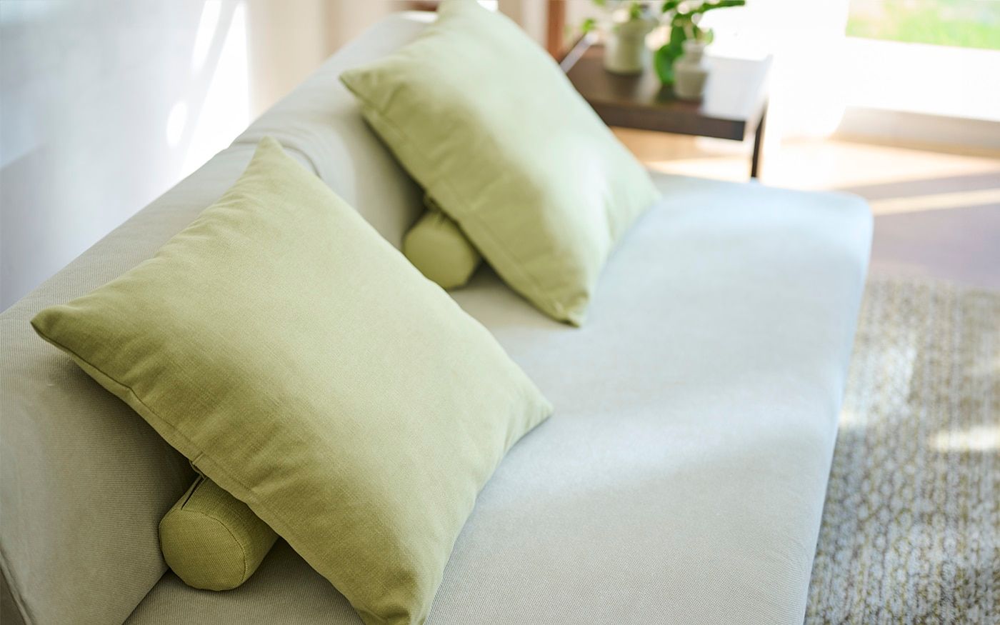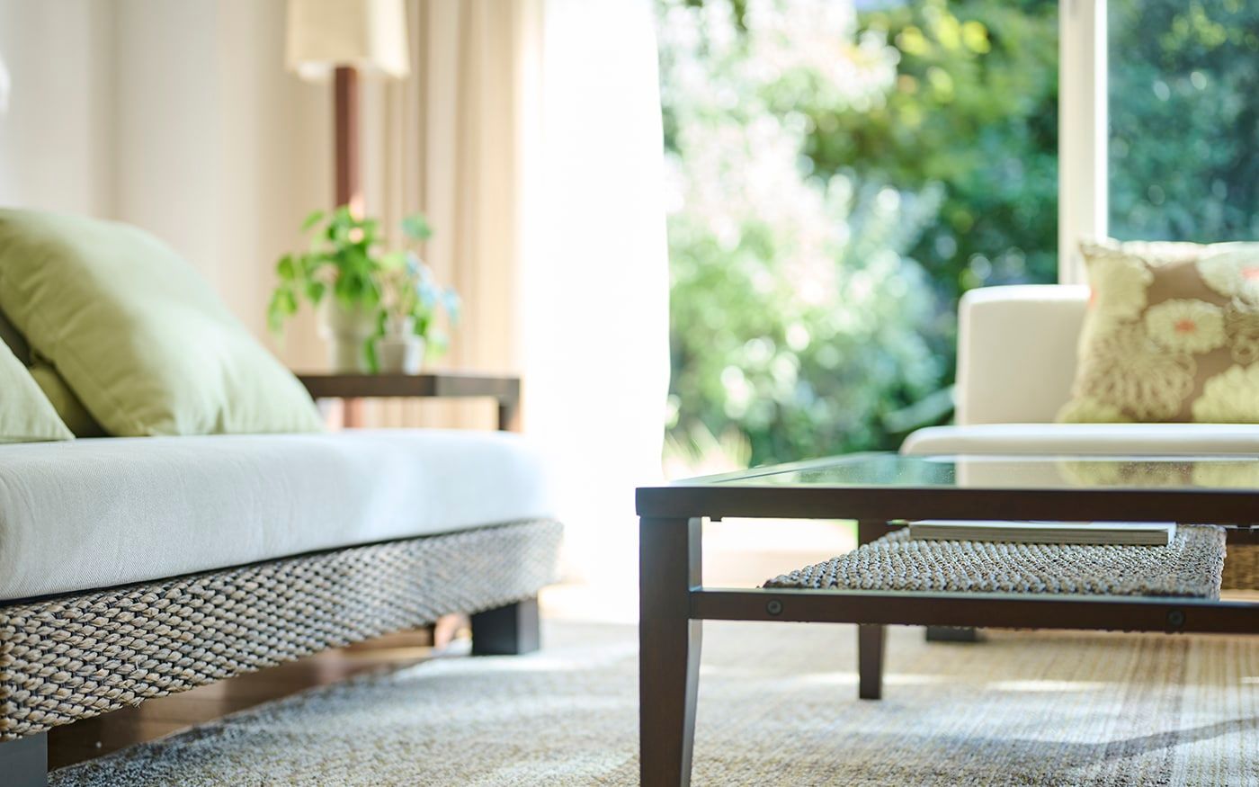 自然感のあるヒヤシンス素材の家具は、ペールトーンのバジルグリーンやリーフグリーンのクッションと相性抜群です。ナチュラルな雰囲気のリビングに仕上げるために、ラグやカーテンは優しいベージュを選び、統一感のある空間を演出しました。