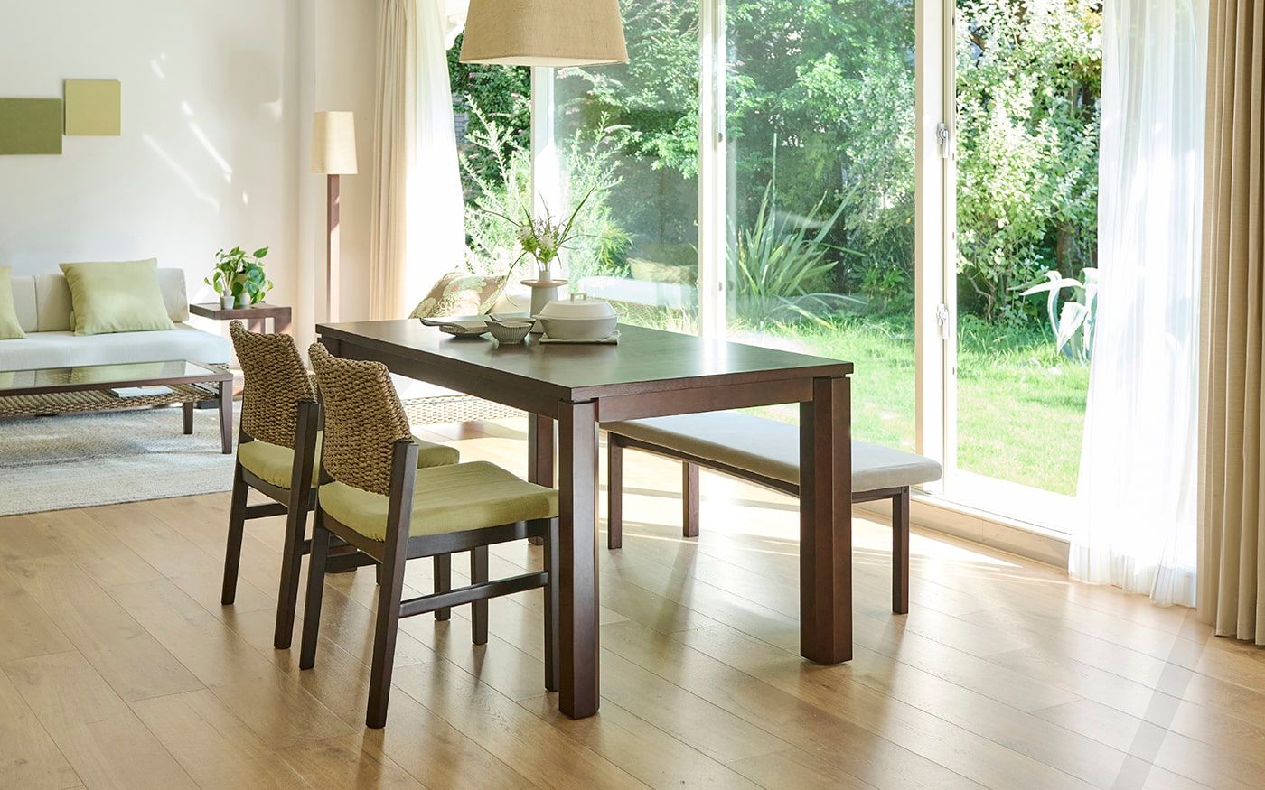 ペールトーンのグリーンで統一したリビングダイニング。食卓周りにもソファと同じ素材感のチェアやカバーを取り入れています。また、ガーデンの美しい景色を楽しめるによう、窓側には抜け感のある背無しベンチをレイアウトしています。