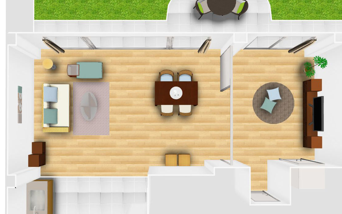 自然素材のローソファがミントグリーンとアクアブルーの淡い色合いと調和し、リビングに穏やかな雰囲気をもたらします。流線形のガラスローテーブルも、この優しいカラーコーディネートに溶け込み、柔らかい空気感のリビングを演出しました。
