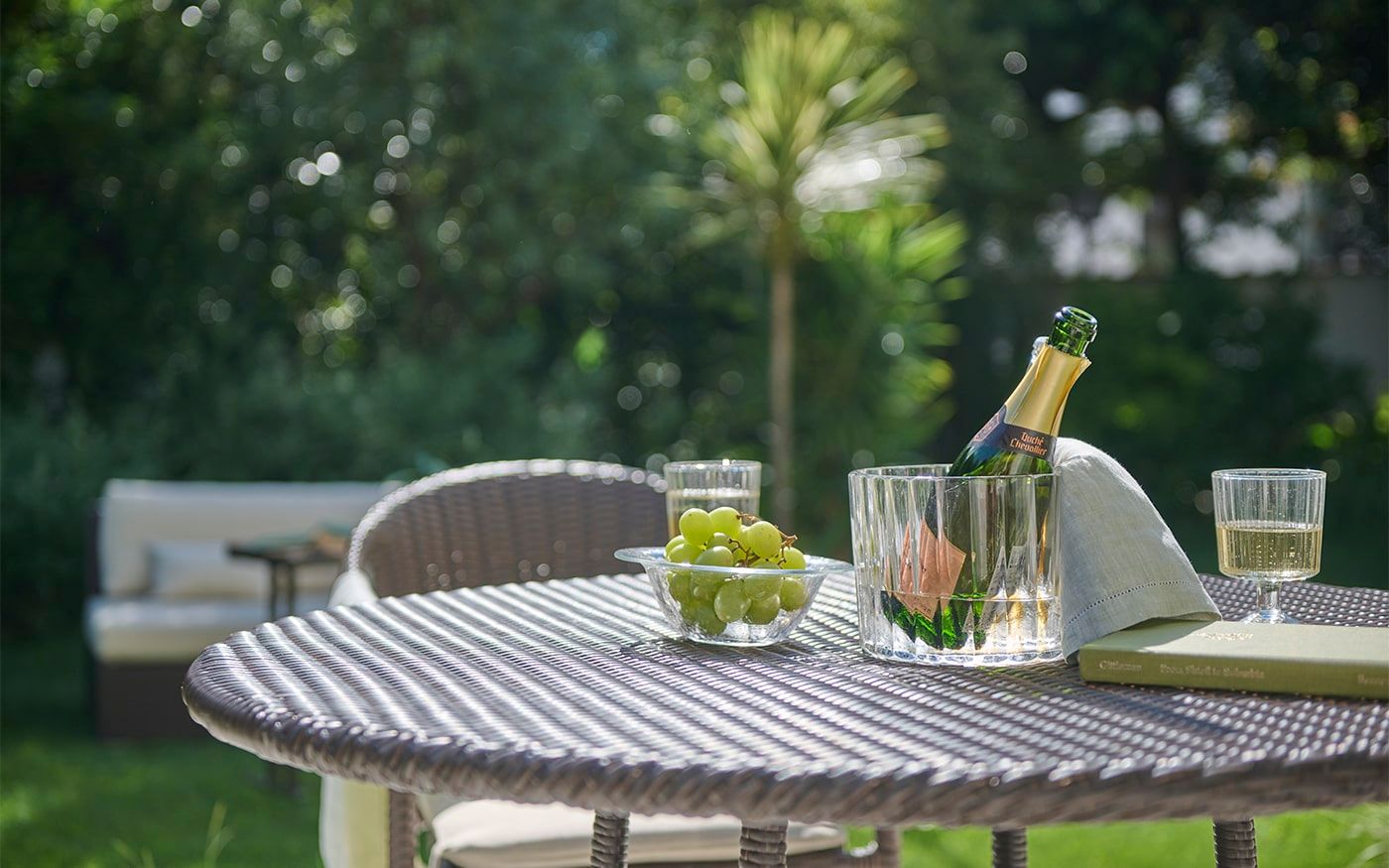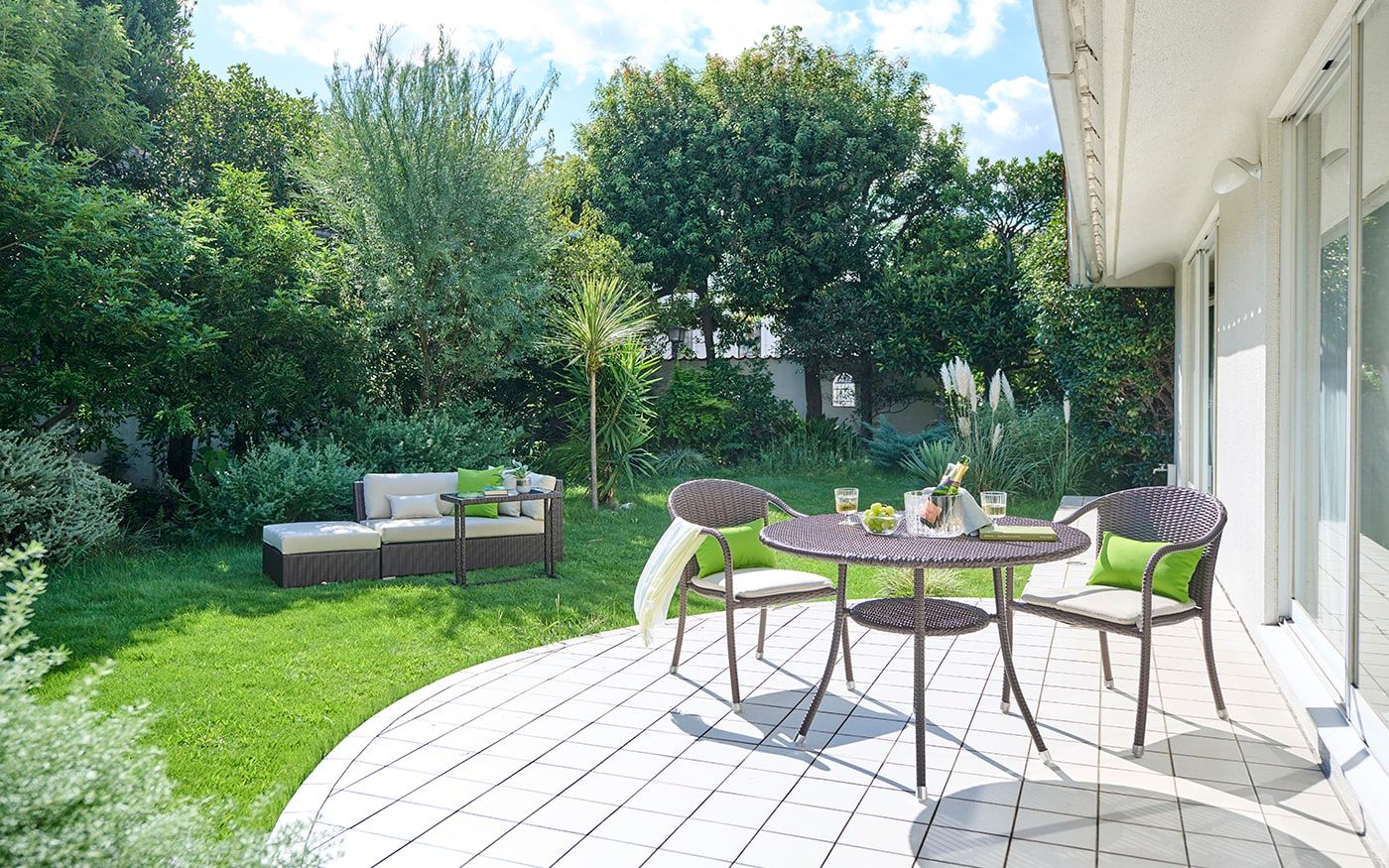 爽やかな木々と芝生が広がるロケーションと調和する、おしゃれな屋外用家具を配置したテラス。アクセントカラーに鮮やかなライムグリーンのクッションを添えて、晴れの日に家族やゲストと贅沢な時間をすごせる空間を作りあげました。