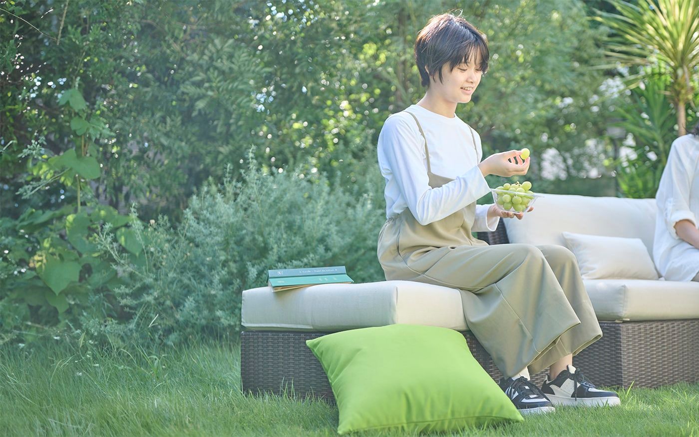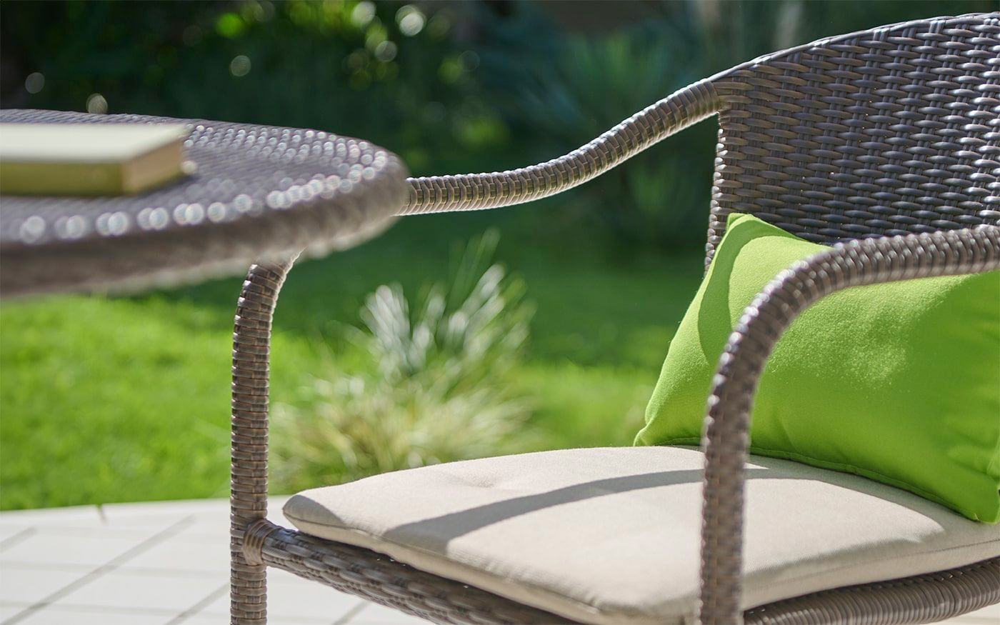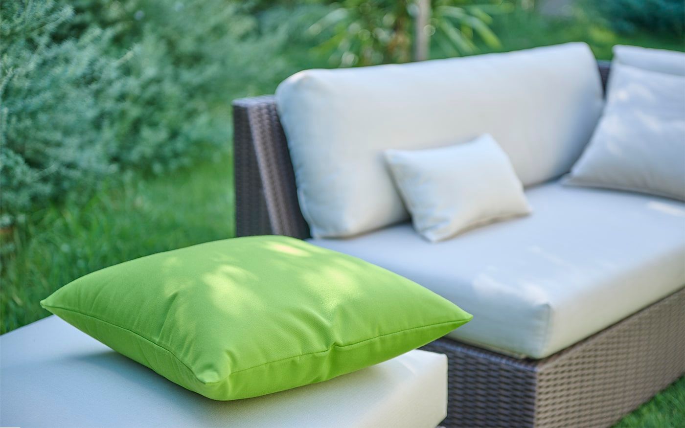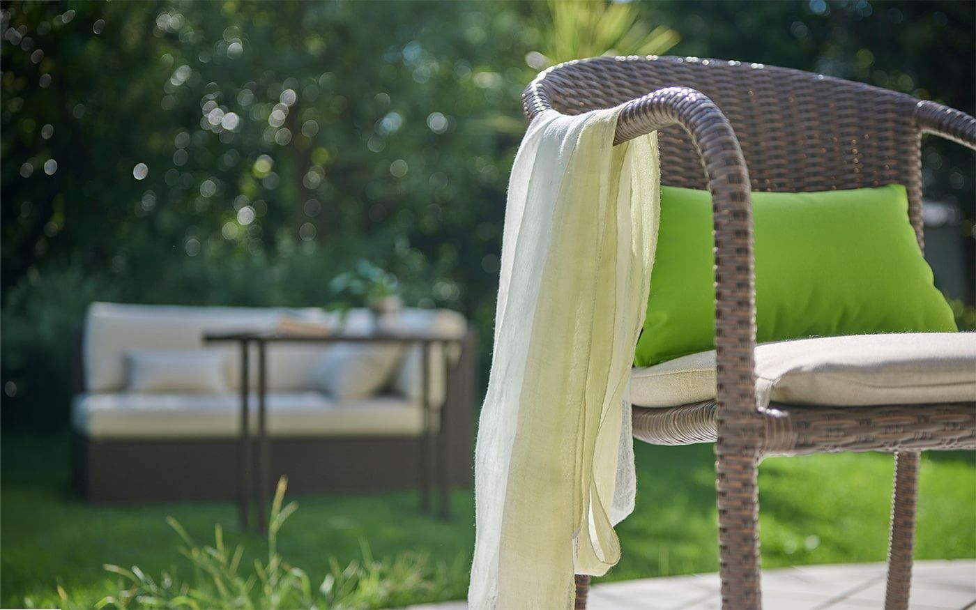 屋外のスペースでもカラーコーディネートは楽しめます。風雨や紫外線にも強い特殊なファブリック・中材を使用したクッションカバーをそえれば、テラスでこだわりのインテリアコーディネートを実現可能。ガーデンと好相性なライムグリーンをアクセントにしました。